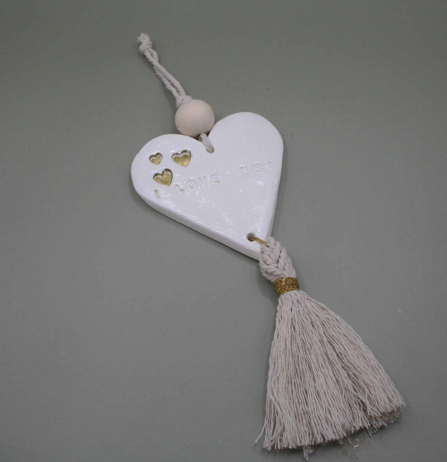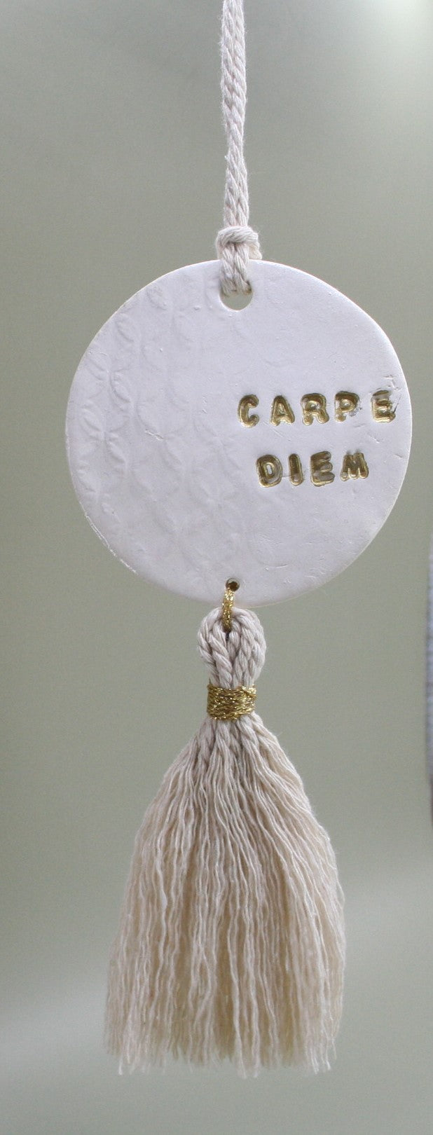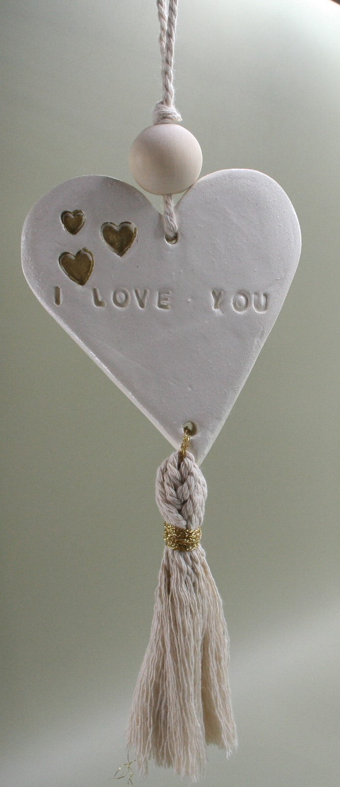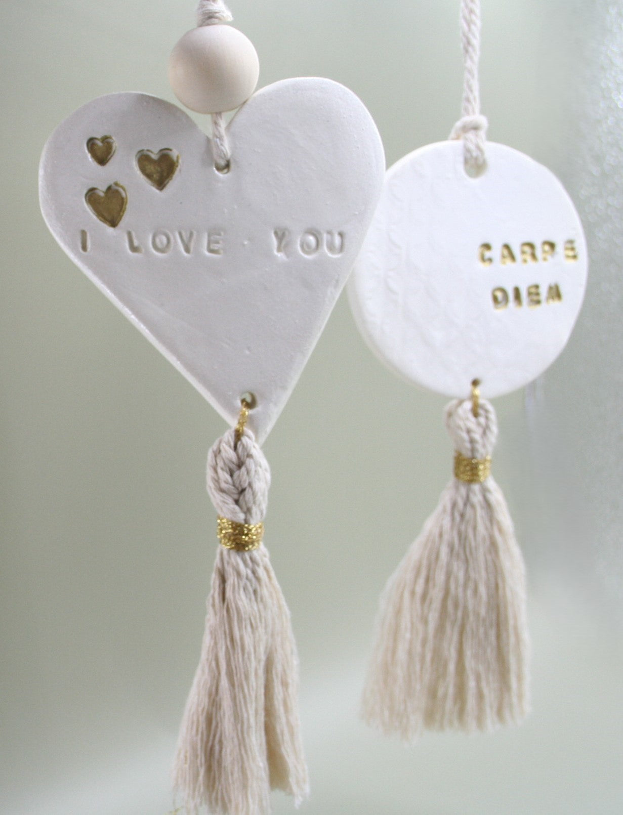 Ornements décoratifs en pate autodurcissante, à suspendre à une poignée ou un mur. Messages embossés ("I LOVE YOU" et "CARPE DIEM") et pampilles crème pour une touche poétique et inspirante.