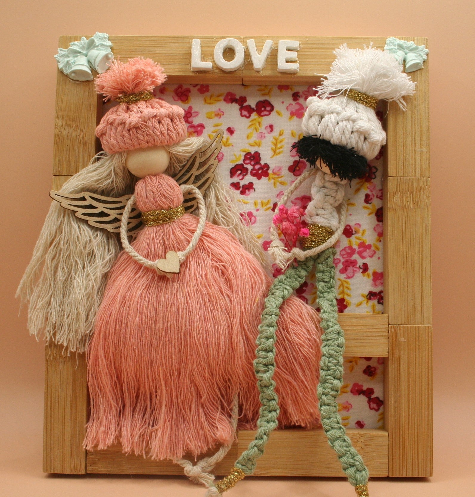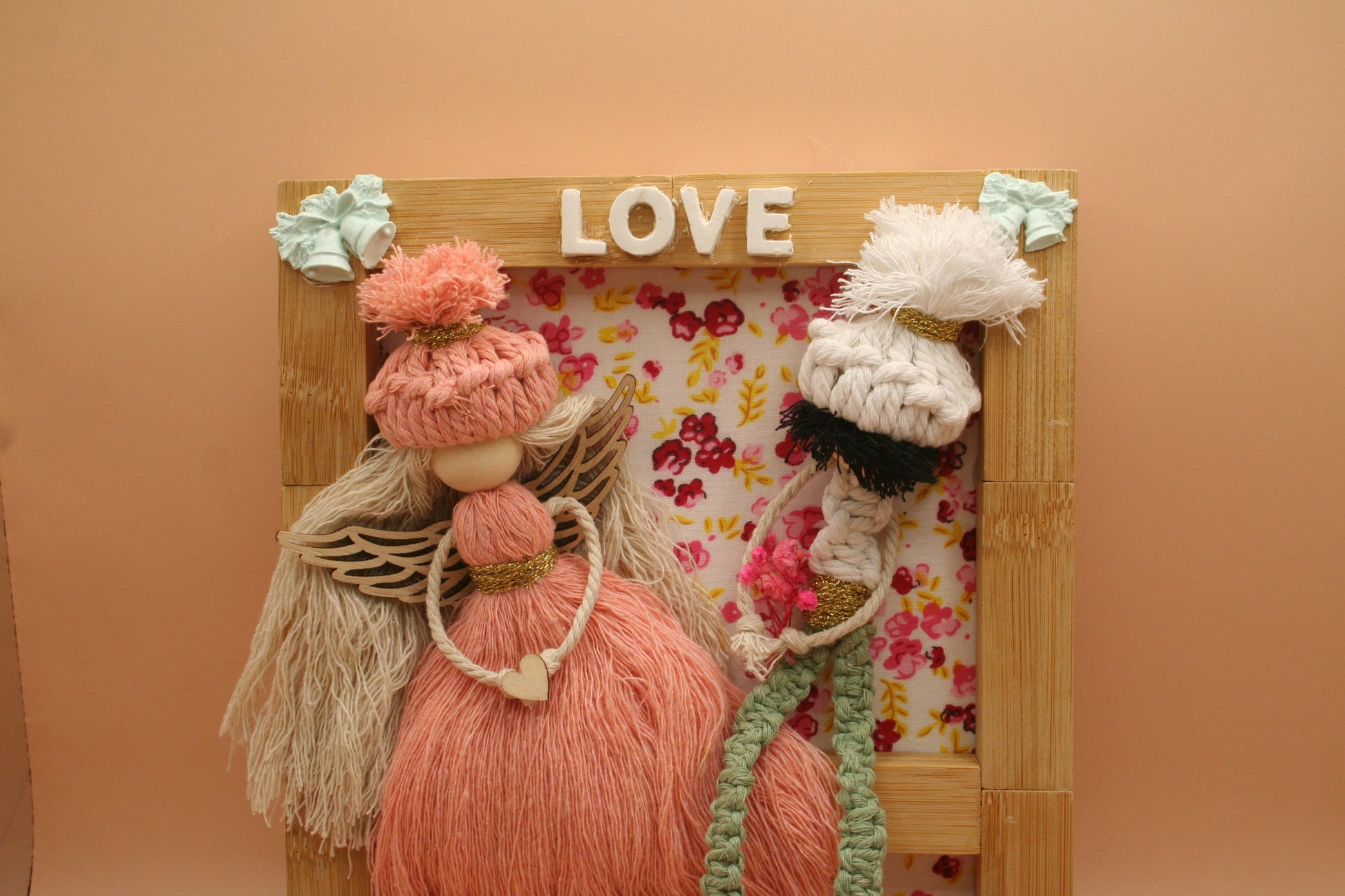 Une ode à l'amour et à la complicité. Cette décoration murale unique met en scène un ange gracieux en macramé, avec une robe rose et des ailes dorées, accompagné de son ami. L'ensemble est monté sur un cadre en bois "LOVE", créant une composition poétique et joyeuse. Un cadeau parfait pour un mariage, une naissance ou une pendaison de crémaillère.