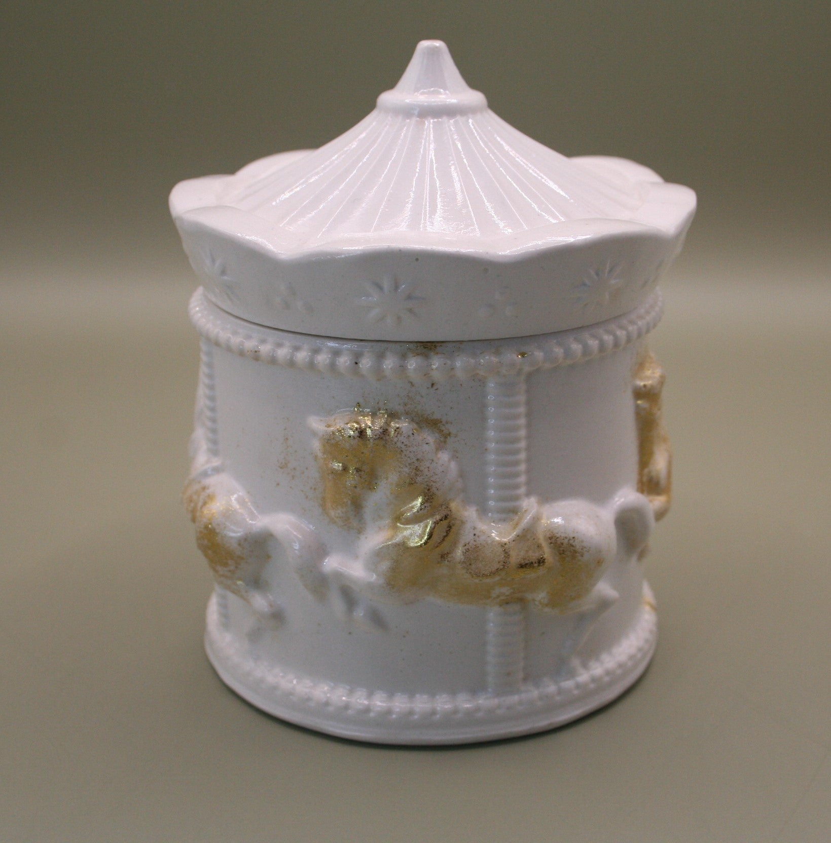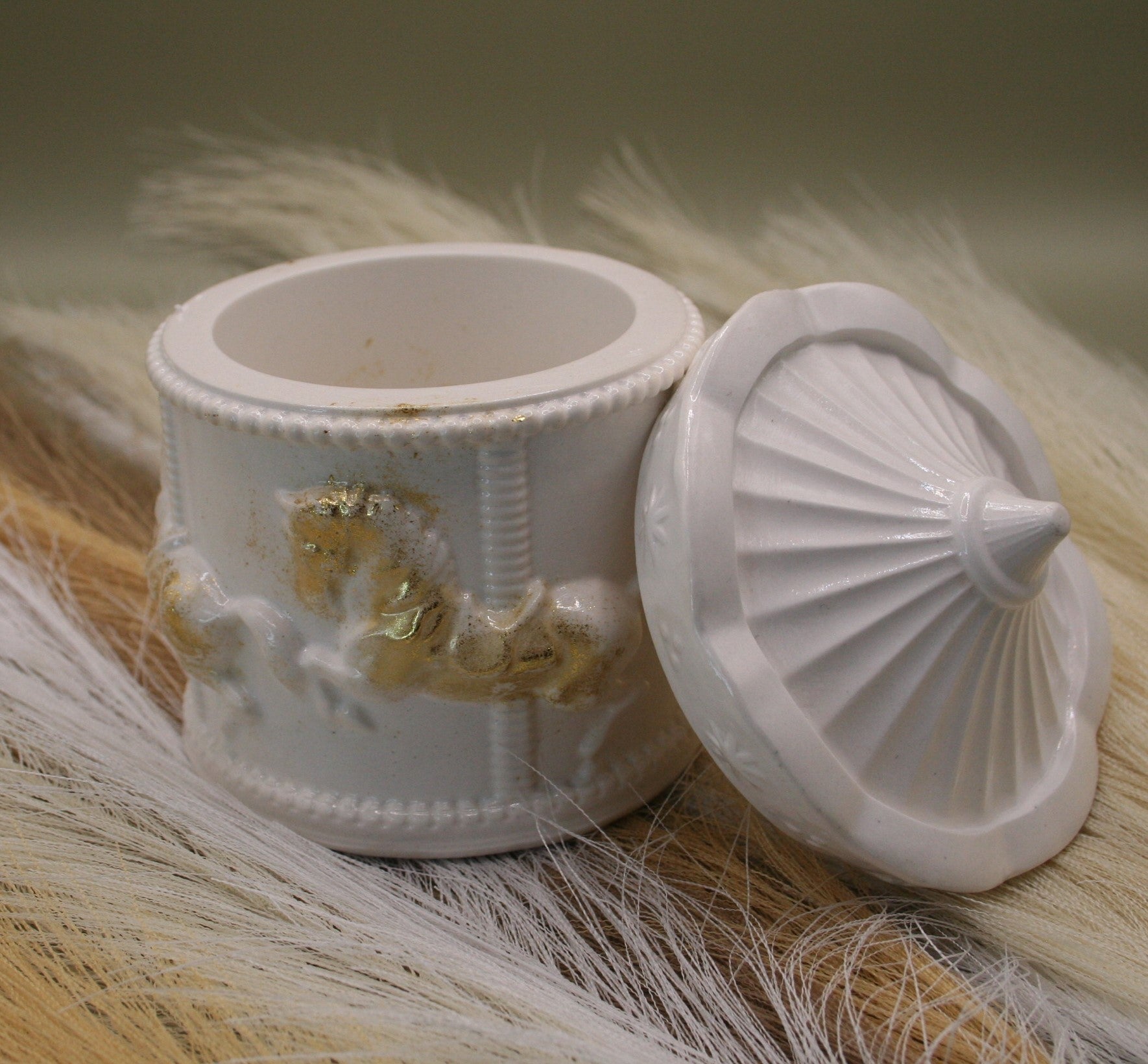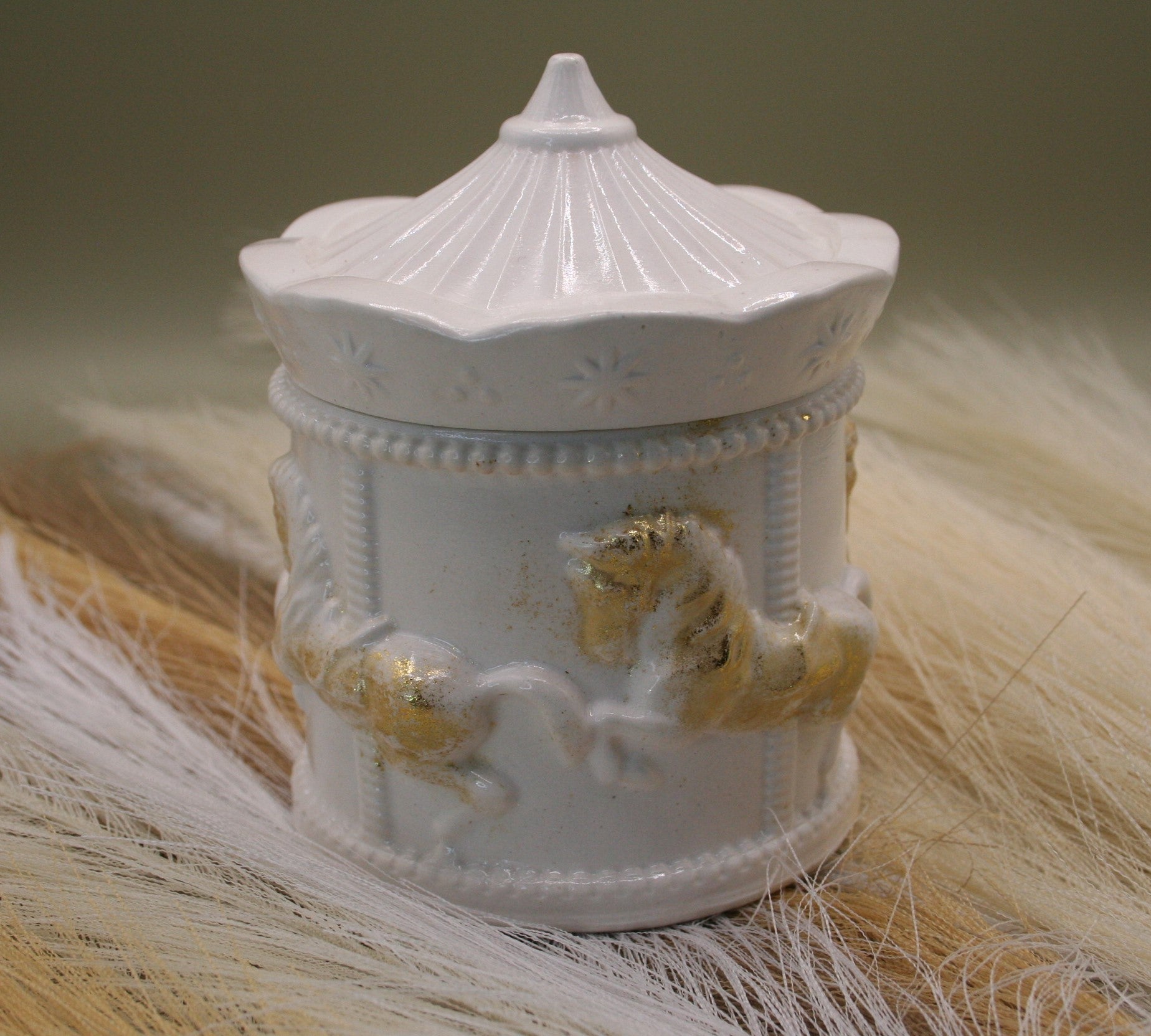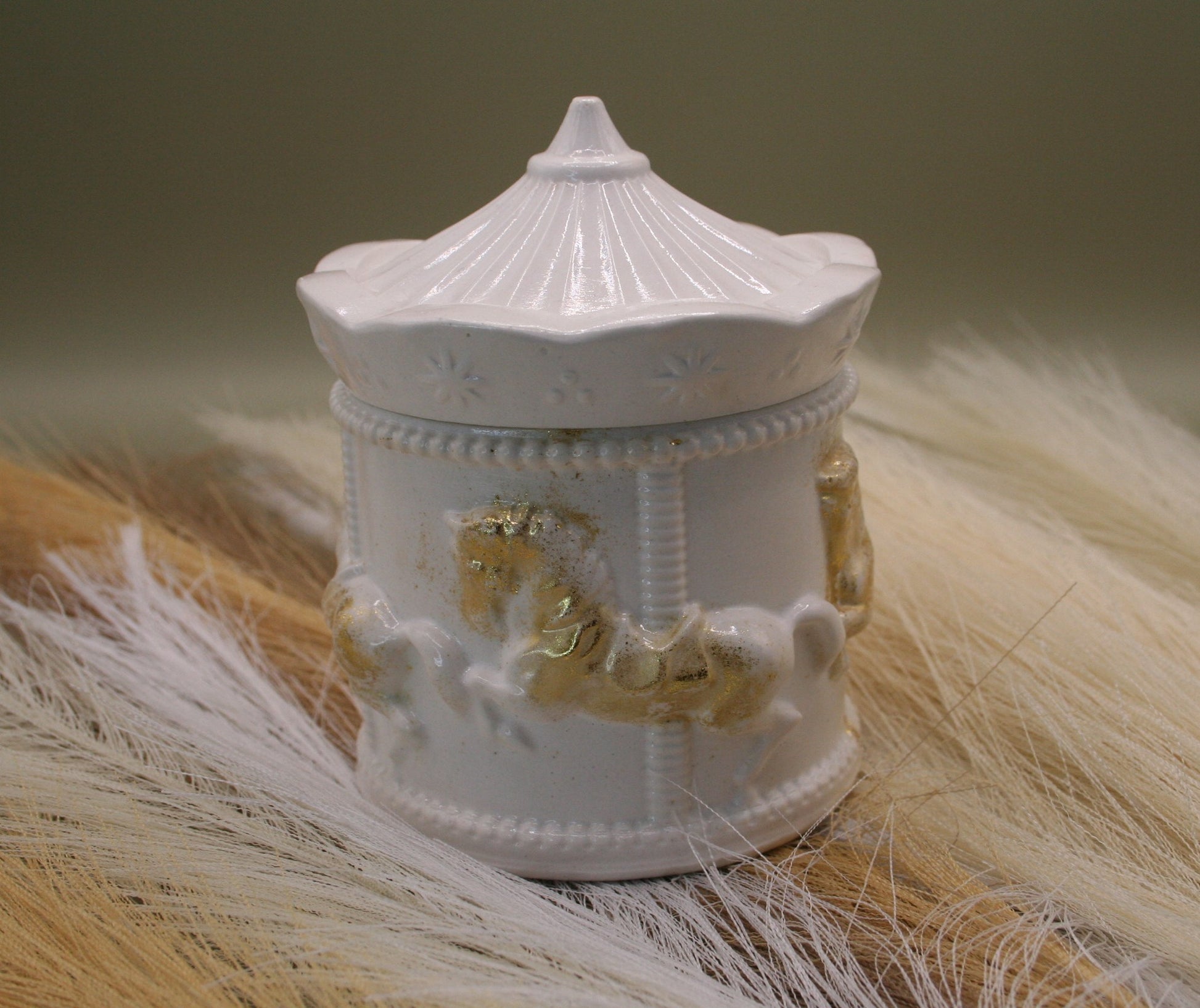 Plongez dans la nostalgie et la poésie des fêtes foraines avec cette boîte en résine naturelle en forme de carrousel. Son design raffiné, surmonté d’un couvercle rappelant le toit des manèges, est orné de chevaux délicatement sculptés et rehaussés de touches dorées.