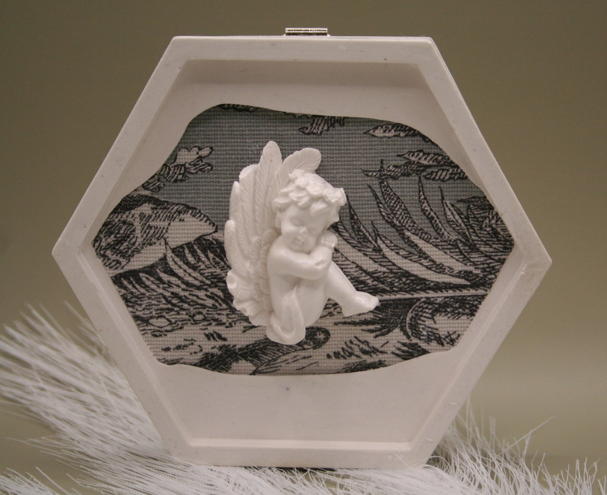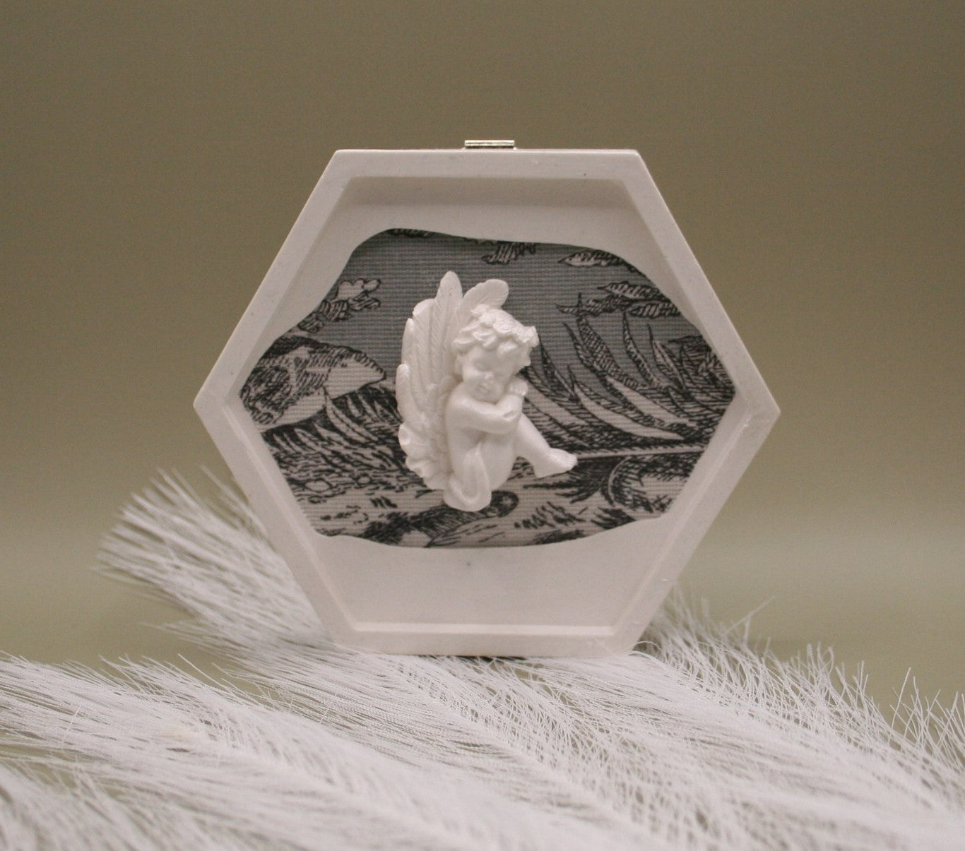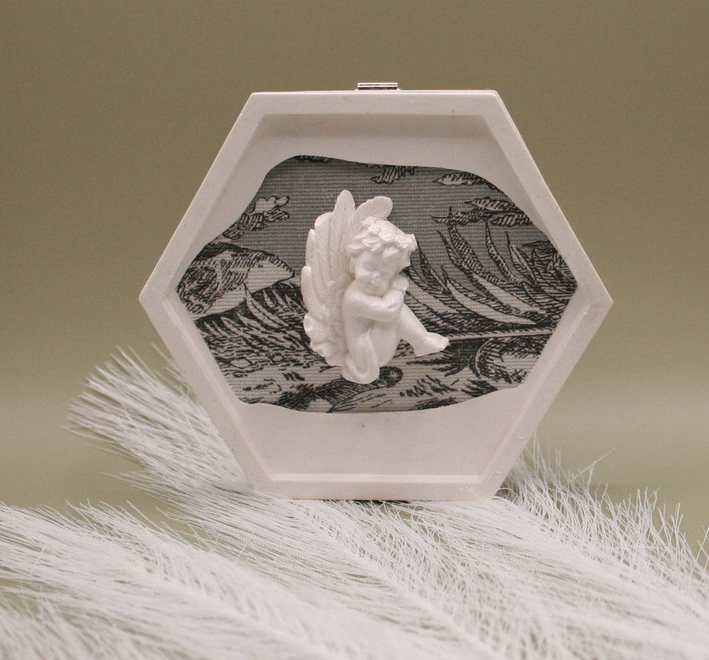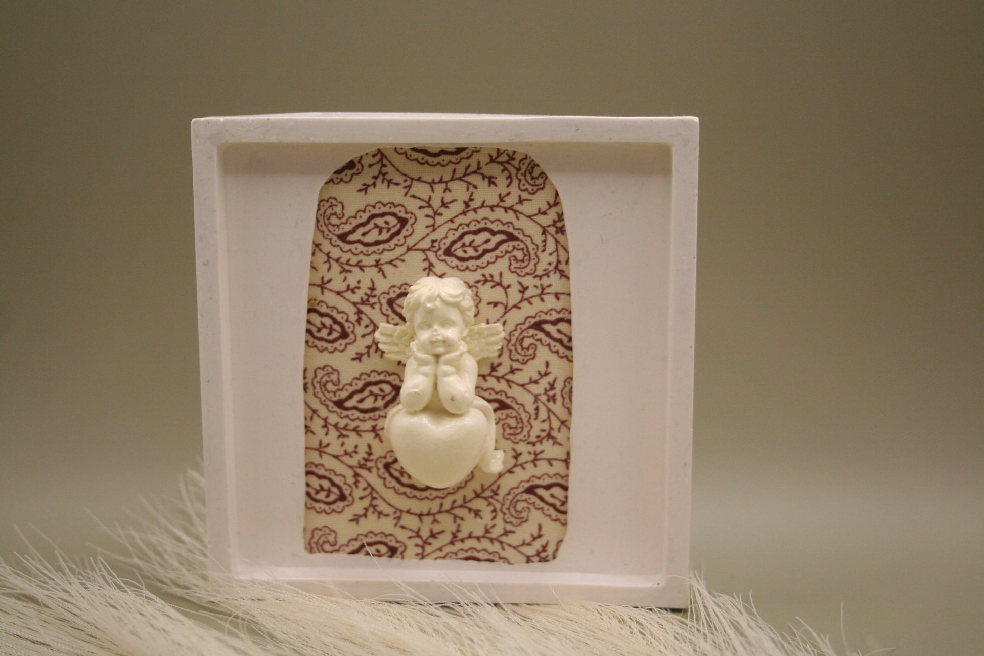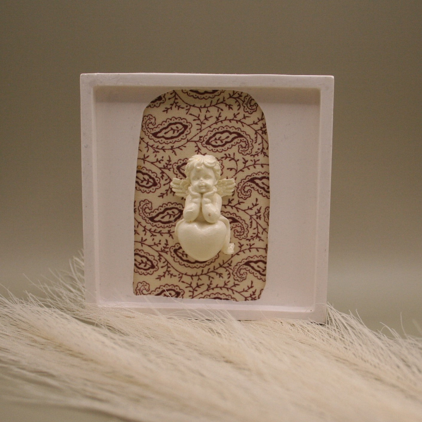 Cadre blanc contenant un fond orné d’un tissu imprimé de motifs. Au centre, un petit ange en résine, avec des ailes délicates dans le dos.
