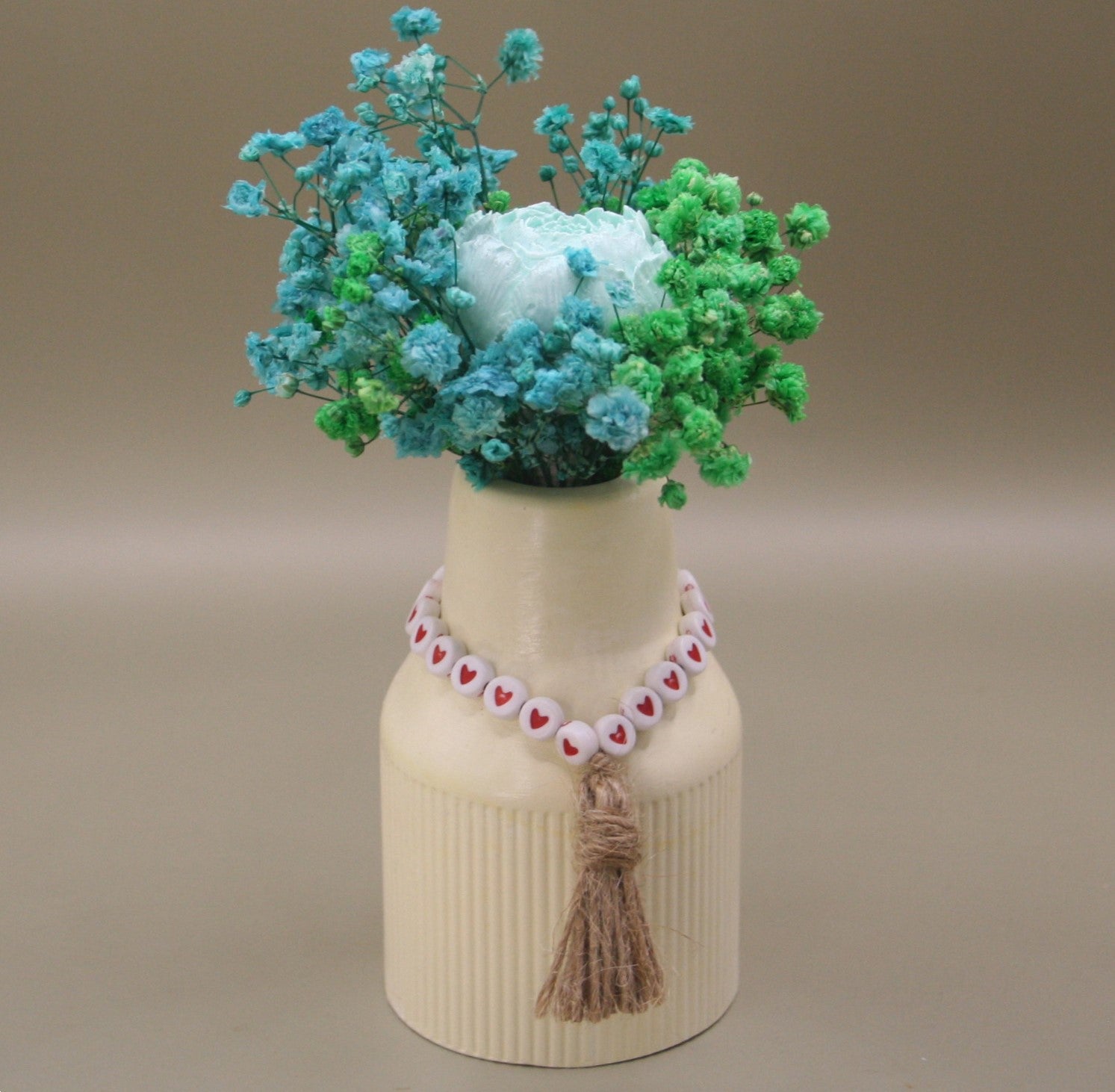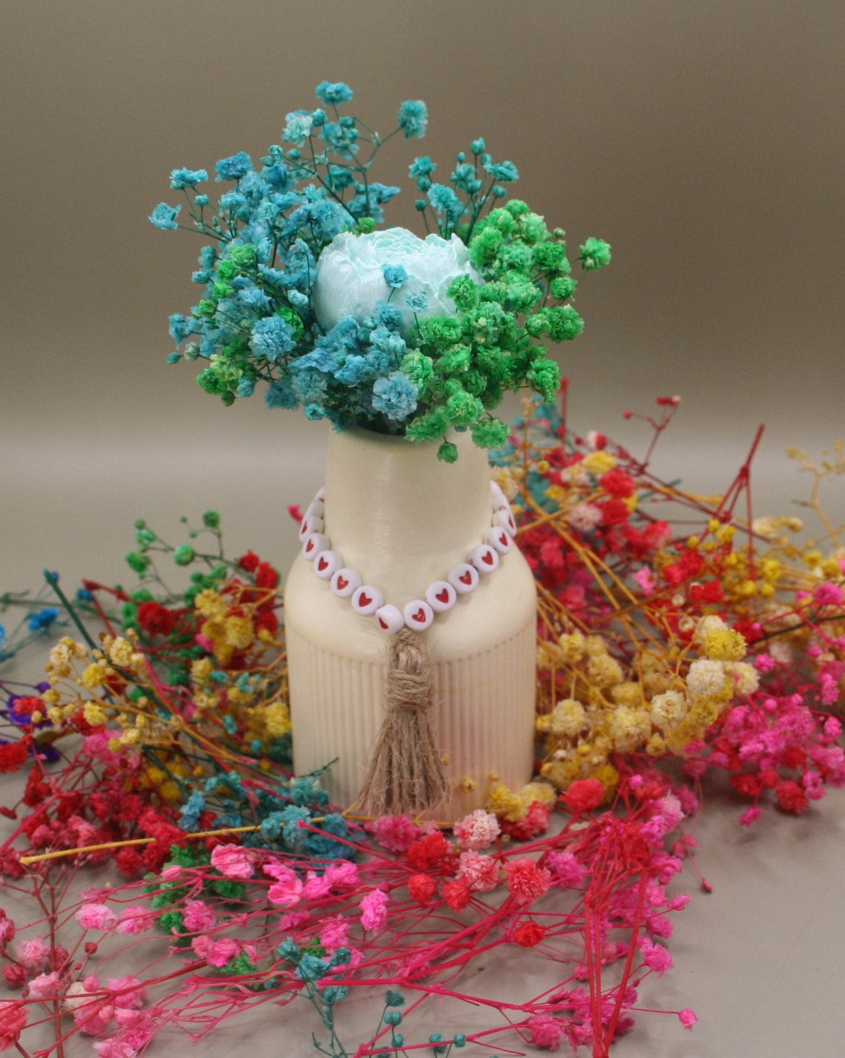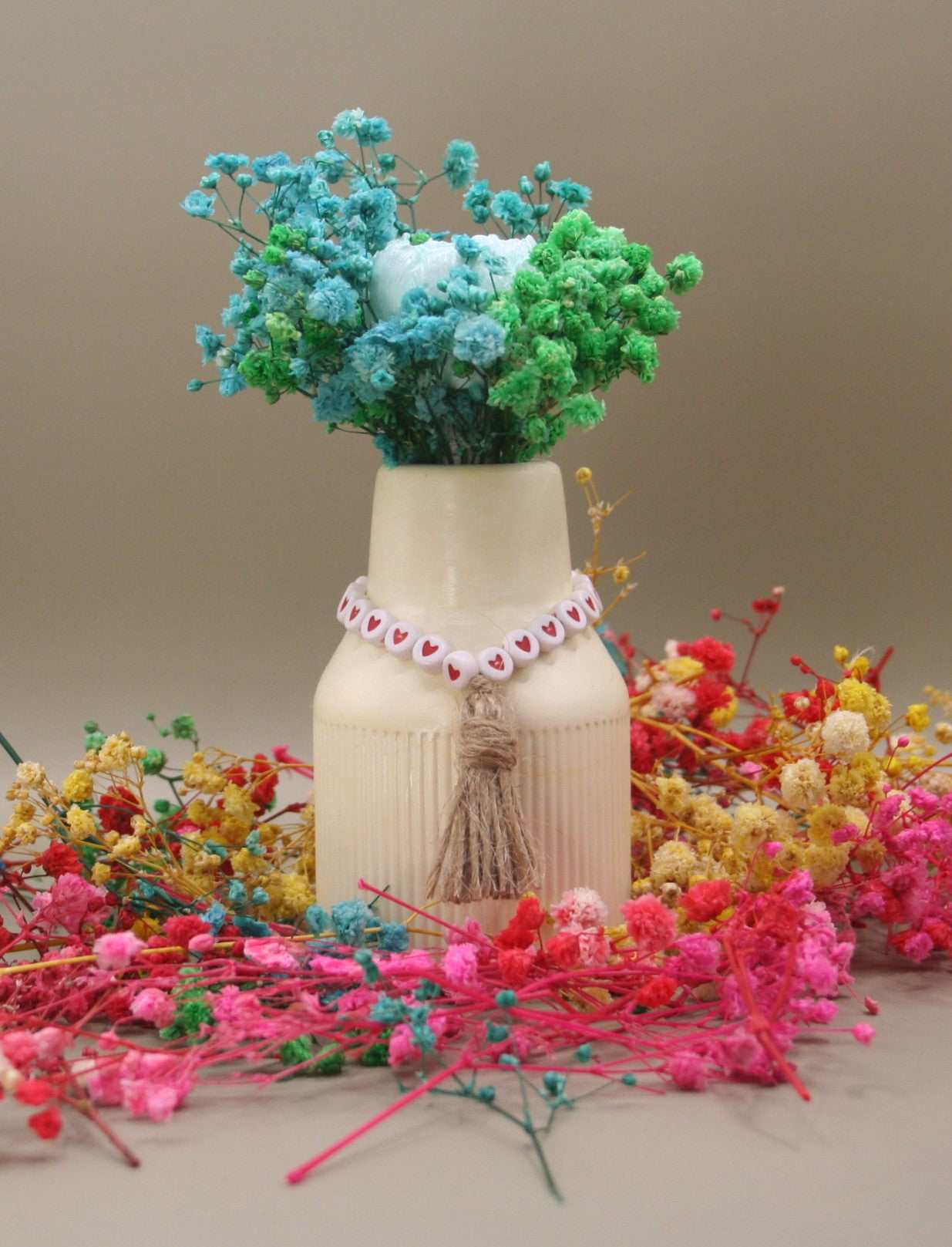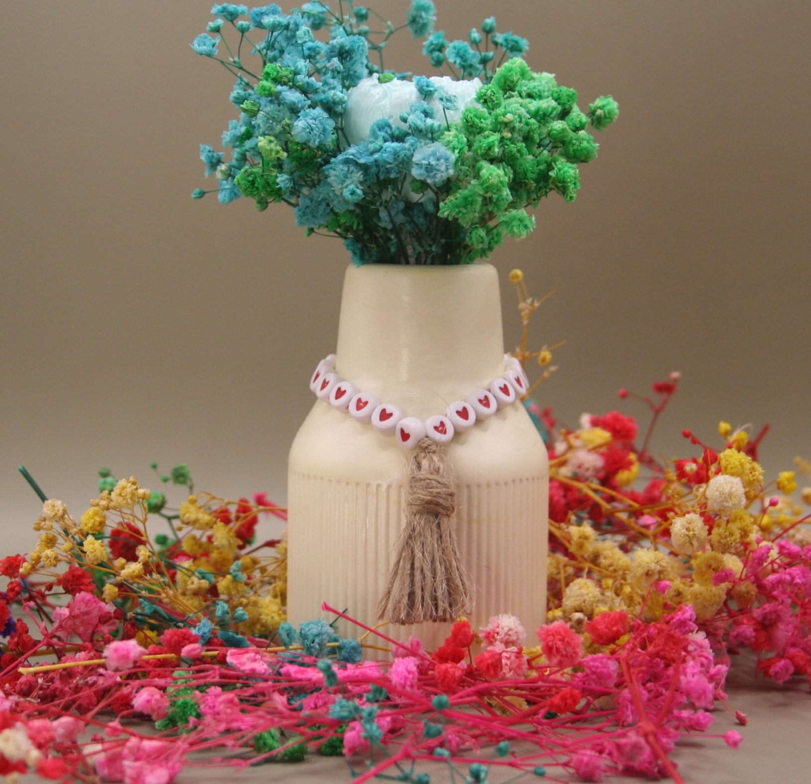 Élégance artisanale et esprit bohème s’unissent dans Cœur Bohème, une création florale pleine de charme. Le vase nervuré en résine naturelle crème, habillé d’un collier de perles blanches ponctuées de cœurs rouges et terminé par une pampille en corde, évoque les objets précieux faits main. À l’intérieur, une rose blanche aux reflets bleutés s’épanouit parmi des gypsophiles bleus et verts, pour une composition douce et vibrante.