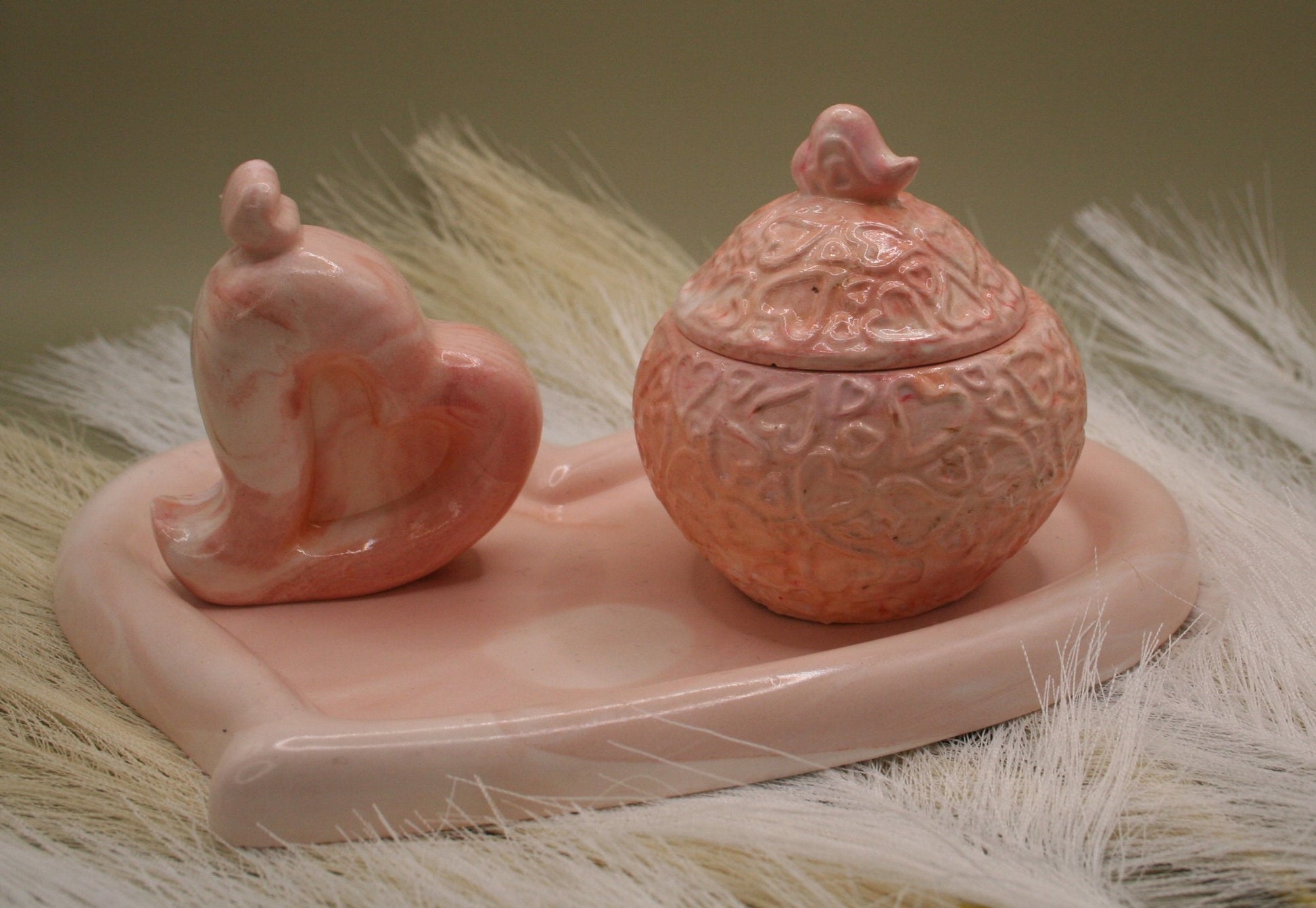 Ce coffret au tendre ton rose poudré, finement orné de motifs en relief, repose sur un plateau en forme de cœur aux nuances marbrées. Parfait pour conserver vos petits trésors ou pour offrir, il apportera une touche douce et poétique à votre intérieur.