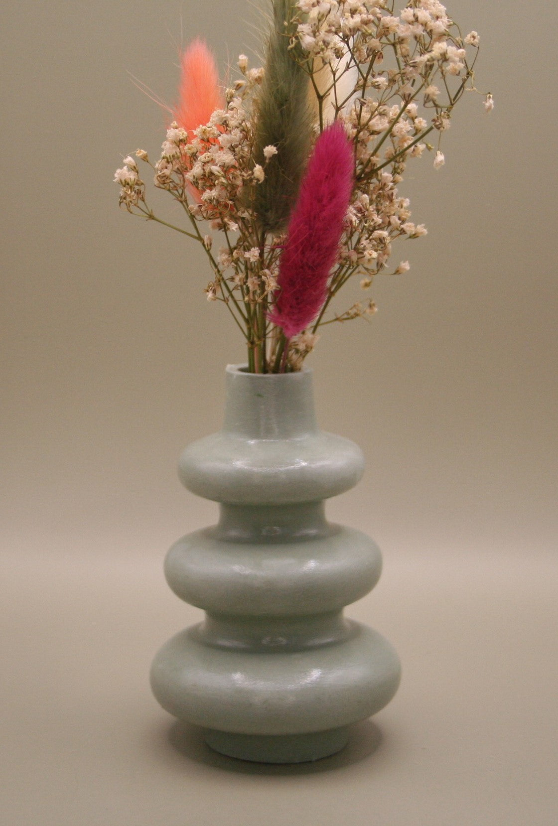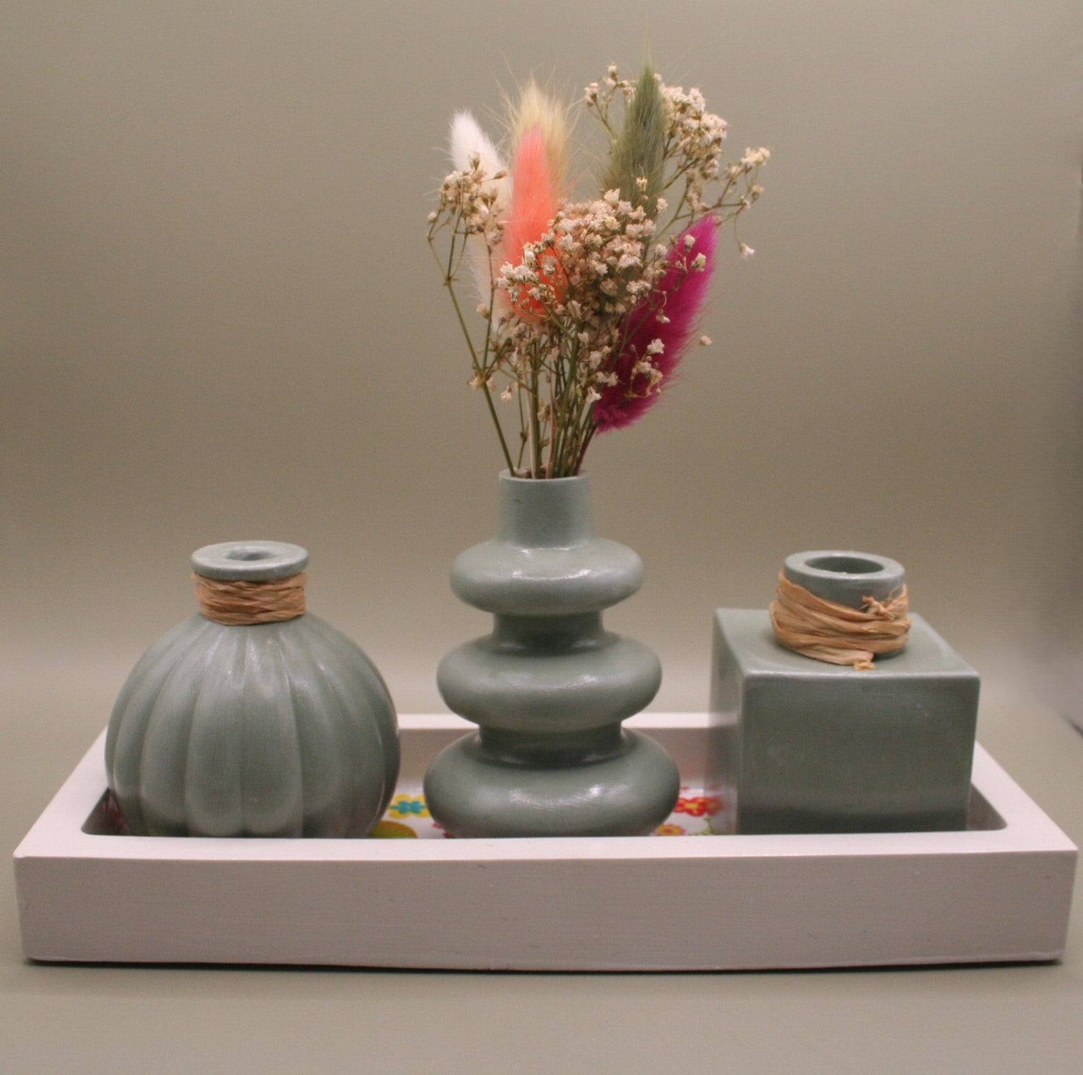 Apportez une touche d’élégance naturelle à votre intérieur avec ce Trio Botanique en Douce Harmonie. Présenté dans un plateau colorée fleuri, cet ensemble de trois vases en résine vert sauge se distingue par ses formes uniques – ronde, sculpturale et cubique – chacune sublimée par un lien de raphia pour un charme artisanal. Le vase central accueille un délicat bouquet de fleurs séchées et de pampas colorées, offrant un contraste poétique et chaleureux. Idéal en centre de table, sur une console ou une étagère, cet ensemble conjugue douceur, modernité et esprit nature.