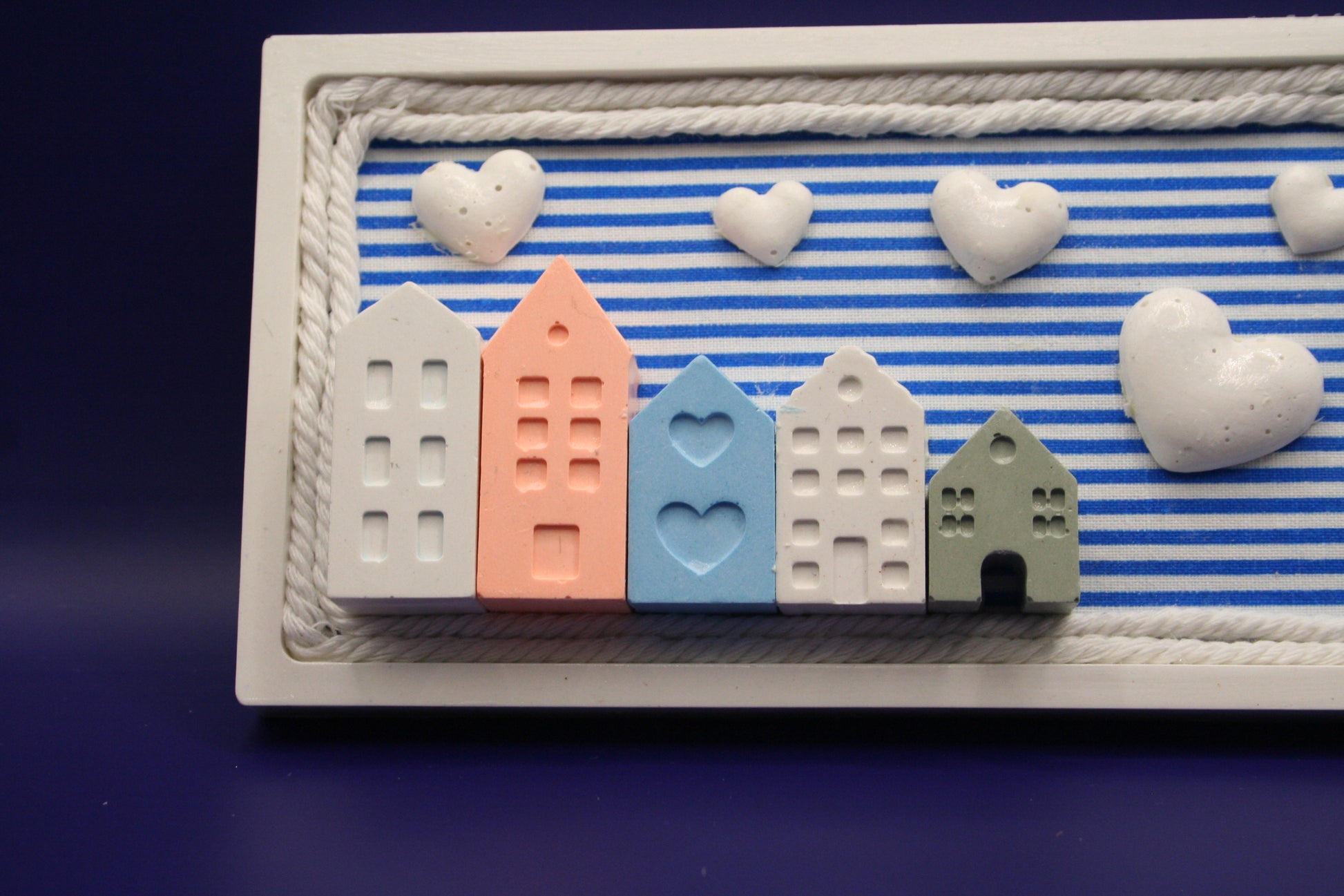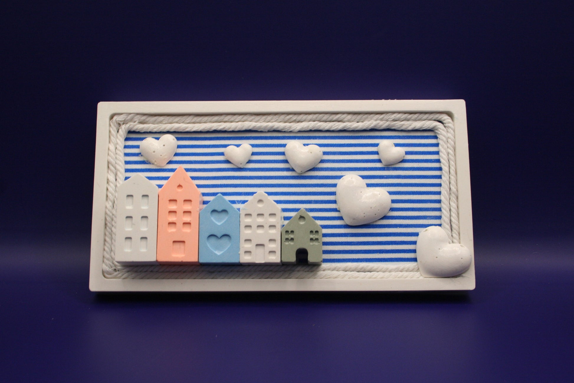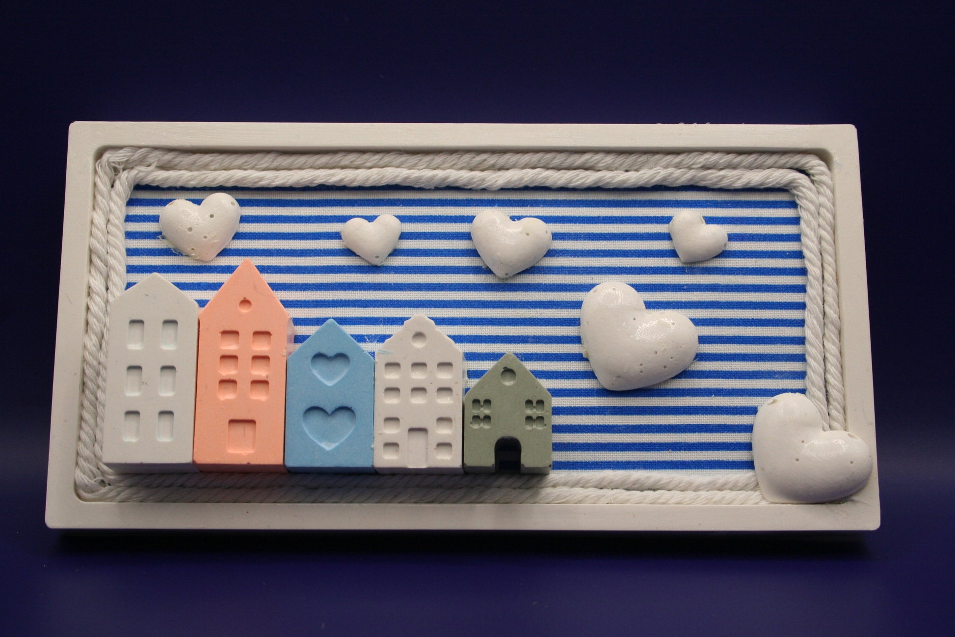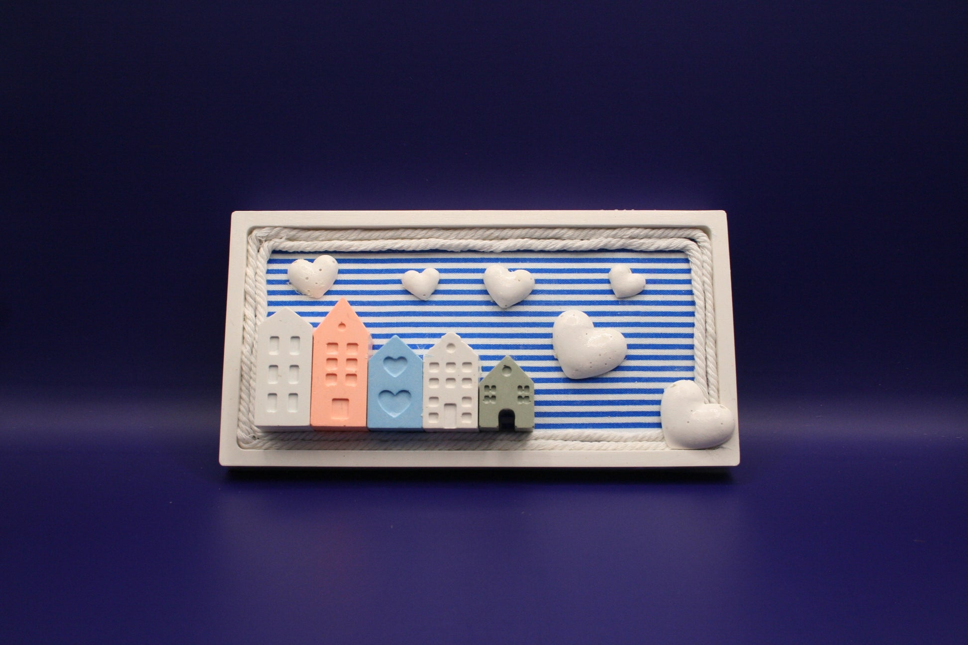 Un tableau décoratif charmant qui représente une rangée de petites maisons en résine, aux couleurs pastel apaisantes. Le fond rayé bleu et blanc, encadré d'une cordelette blanche, évoque l'atmosphère sereine du bord de mer. Plusieurs petits cœurs blancs flottent au-dessus des toits, ajoutant une note de tendresse. Idéal pour décorer une chambre d'enfant, une entrée ou un salon avec une touche de fantaisie et de douceur.
