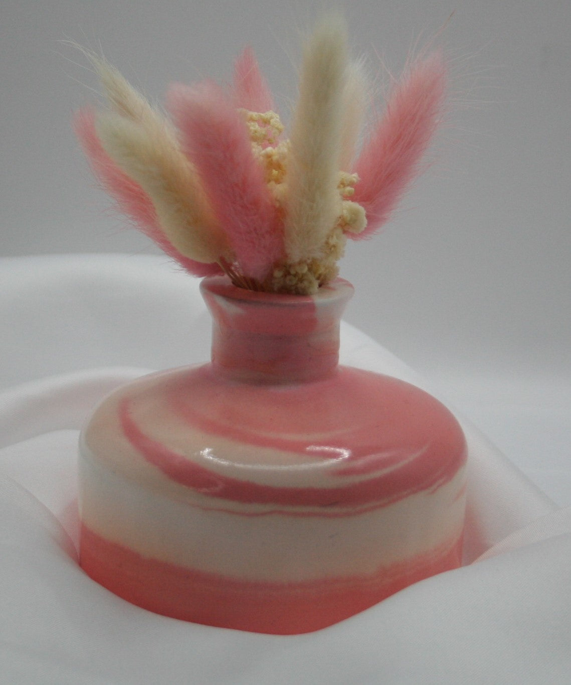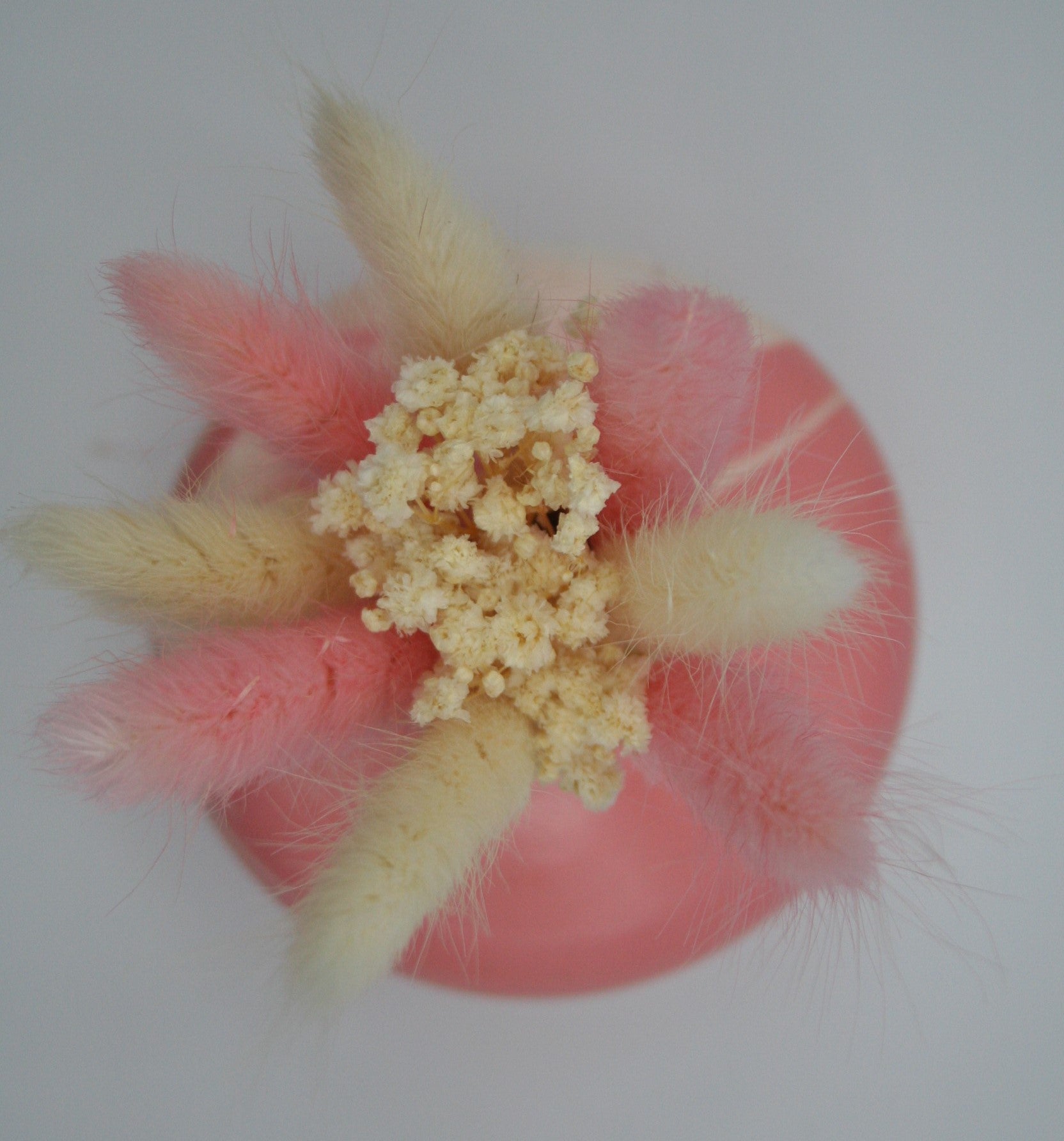 Ce lot rose poudré est composé d'un plateau rond, d'un vase avec ses fleurs séchées, son pendentif de perles de bois, ses deux boîtes, l'une au couvercle de fleurs, l'autre au couvercle cœur.