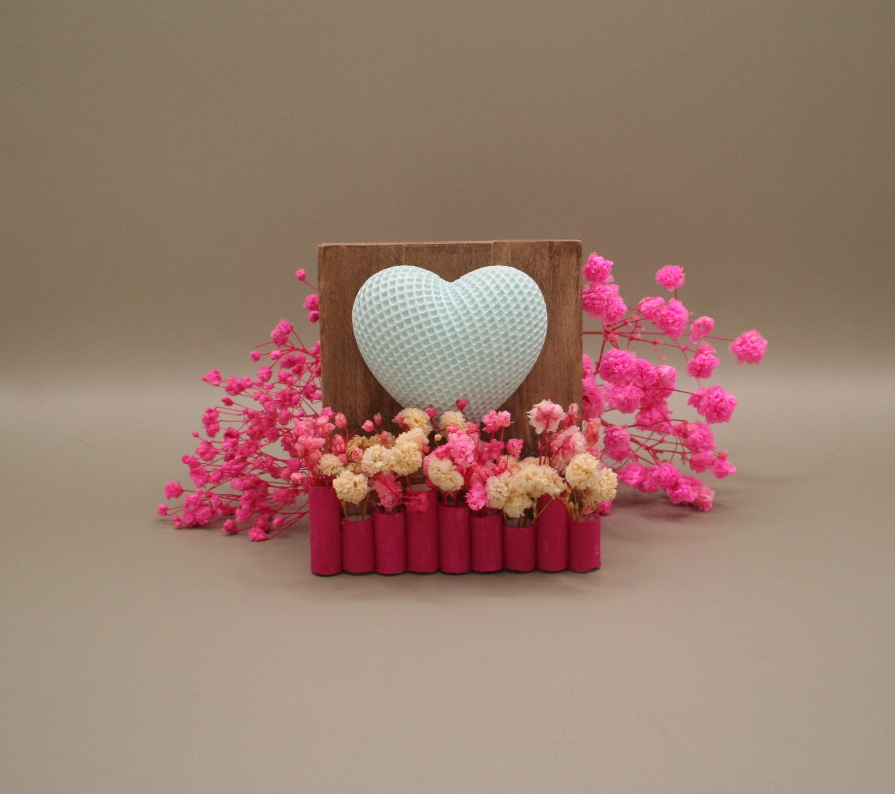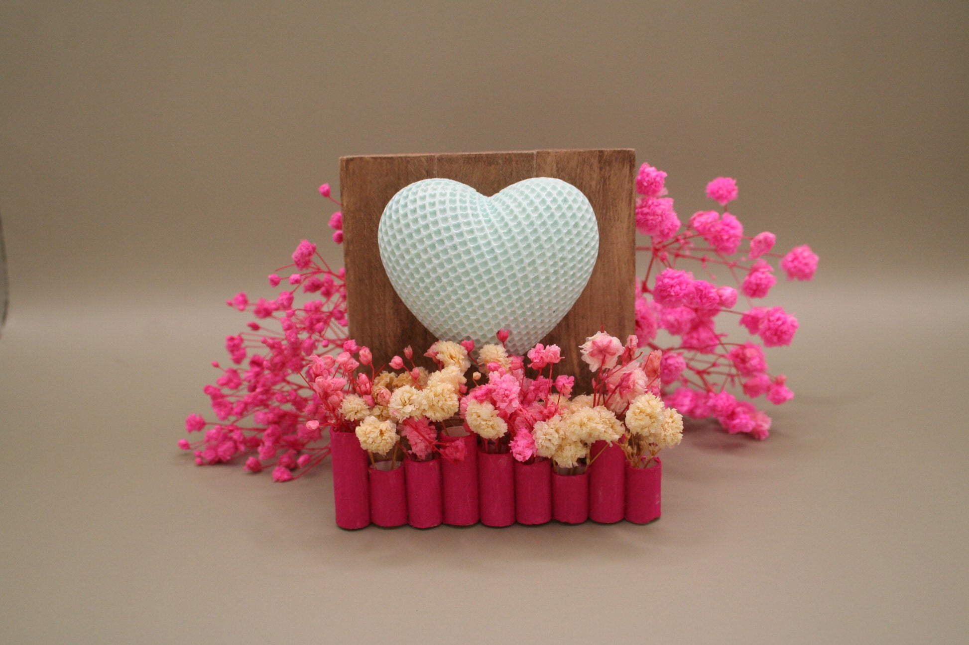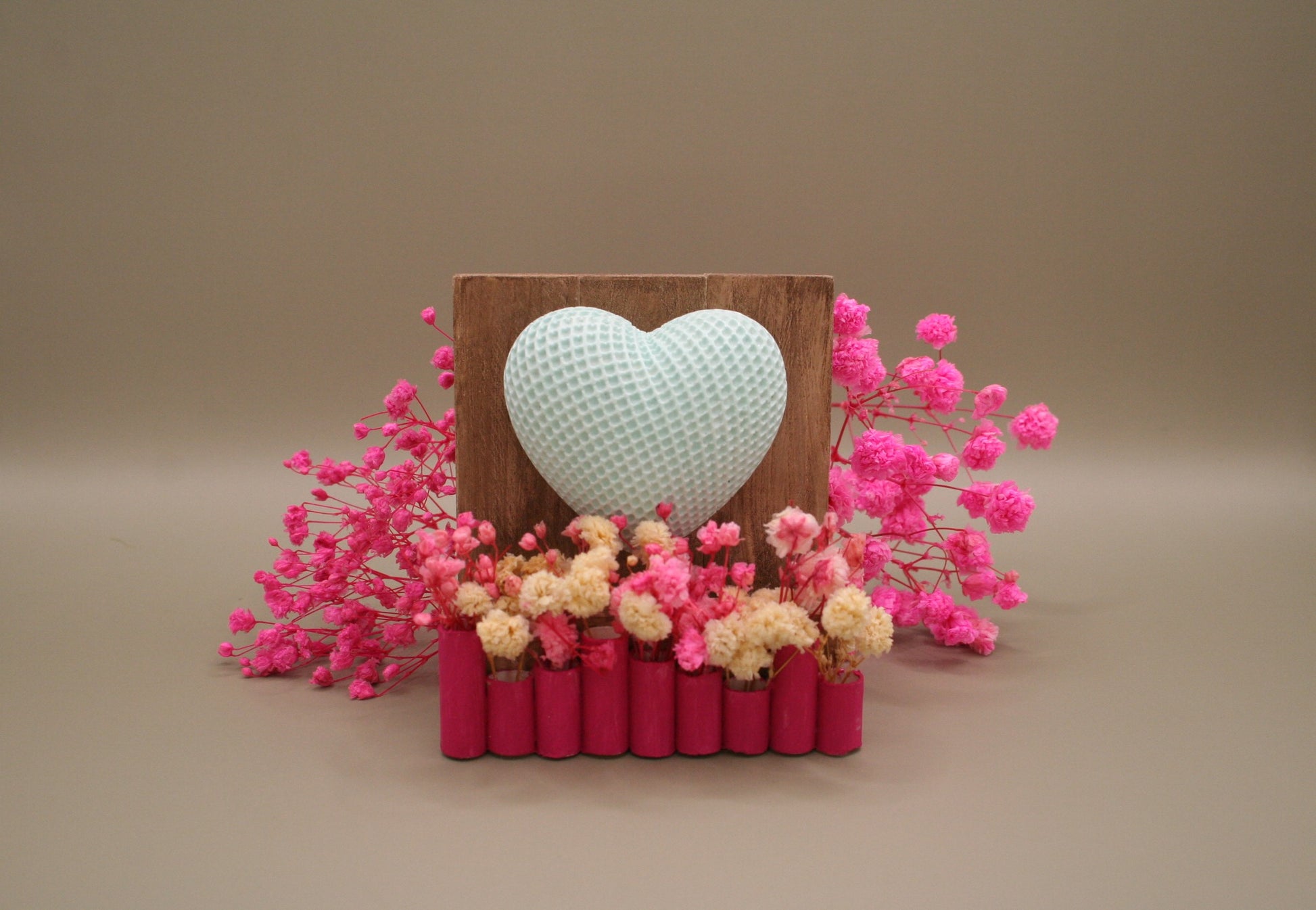 Un délicat arrangement qui allie la douceur d'un cœur en résine aux motifs texturés, reposant sur un socle en bois brut. Les petites fleurs séchées aux teintes de rose et de blanc apportent une touche de poésie et de nature. Idéal pour une décoration de table, une étagère ou un bureau, cet objet artisanal est un cadeau parfait pour exprimer votre amour et votre affection.