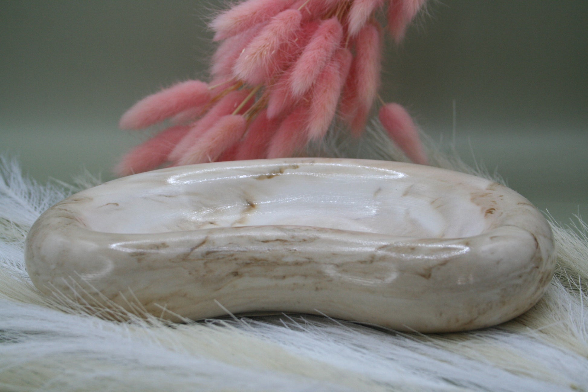 Chaque pièce est unique grâce à son effet marbré qui rappelle les veines minérales et les traces laissées par l’écume sur le rivage. Douce et organique, cette coupelle s’utilise comme vide-poches, repose-bijoux ou simple objet décoratif.