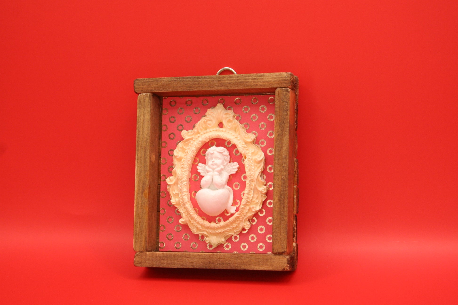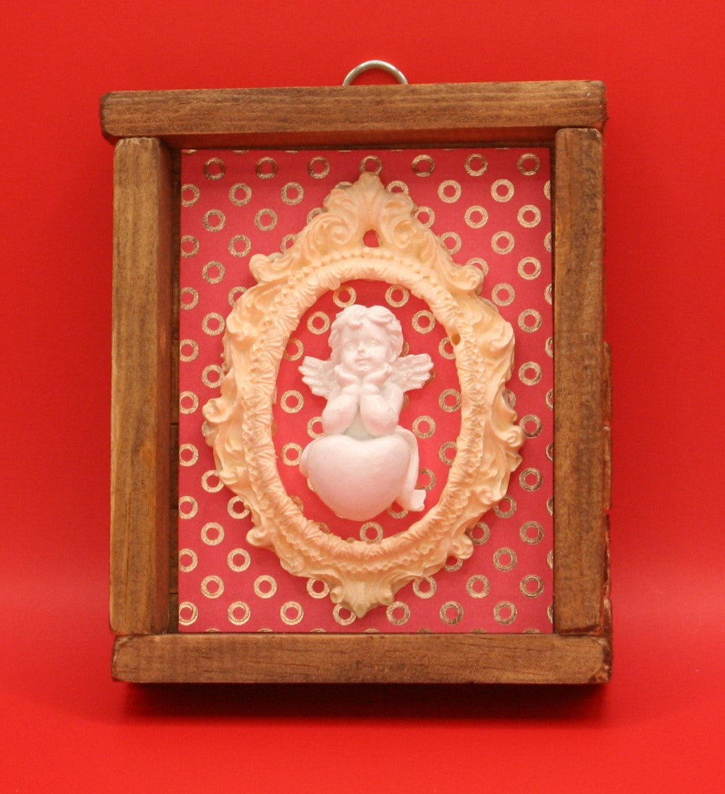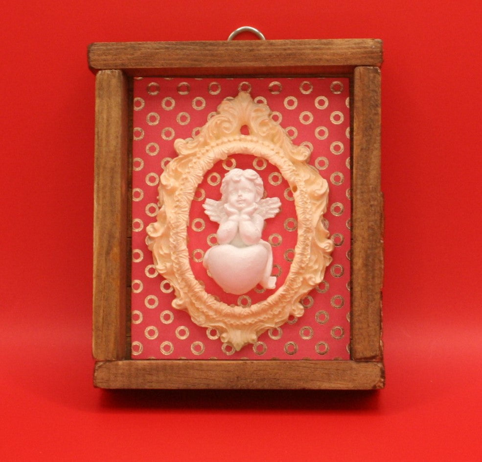 Ce charmant petit cadre mural allie élégance vintage et simplicité rustique. Il est fabriqué à partir de bois naturel brut et orné d’un médaillon en résine finement sculptée. Le médaillon encadre un joli petit ange en relief.