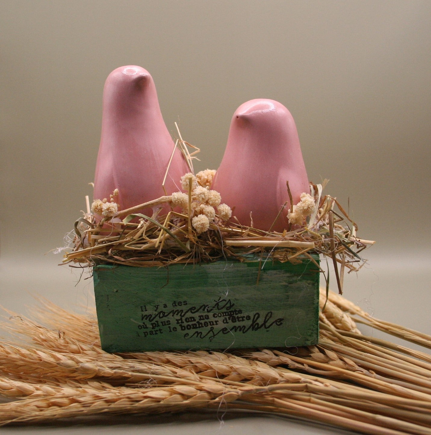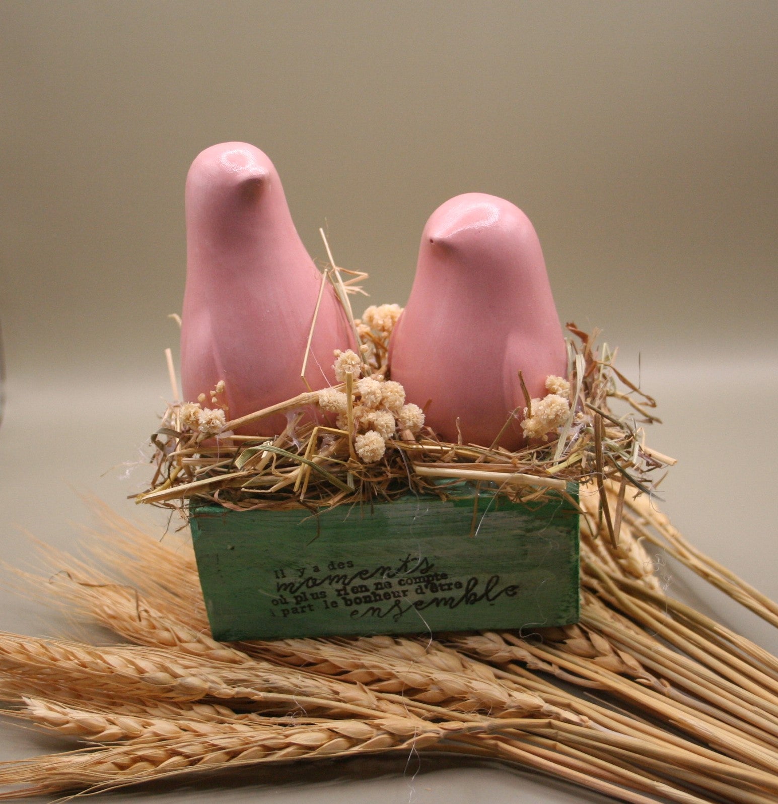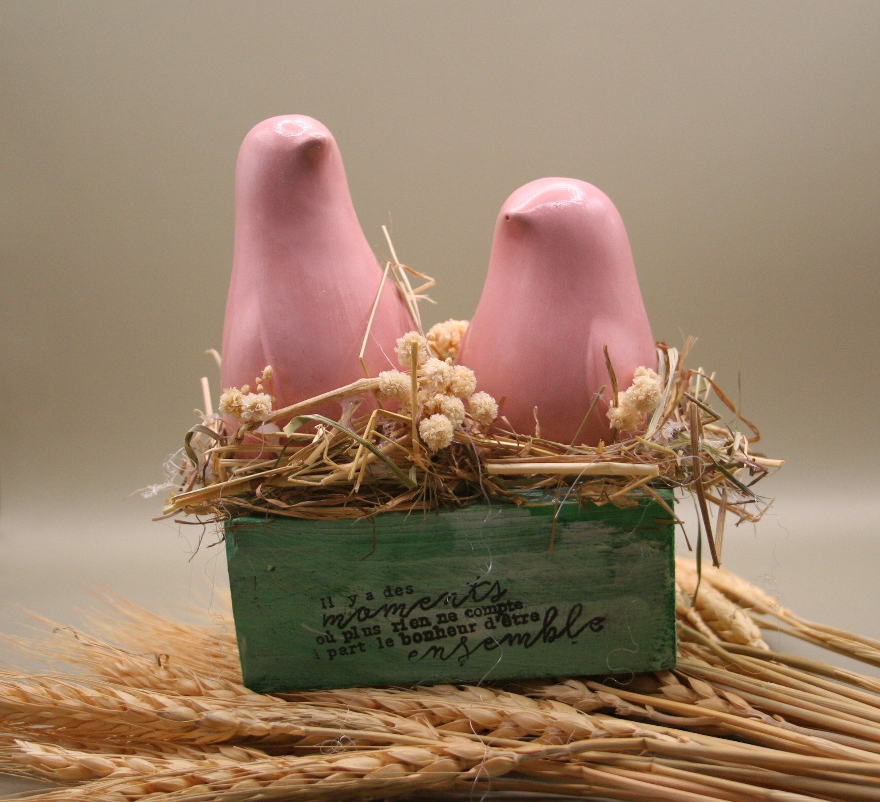 Elle se compose de deux figurines en forme d'oiseaux stylisés, de couleur rose pâle, nichées dans un lit de paille et de petites fleurs séchées.