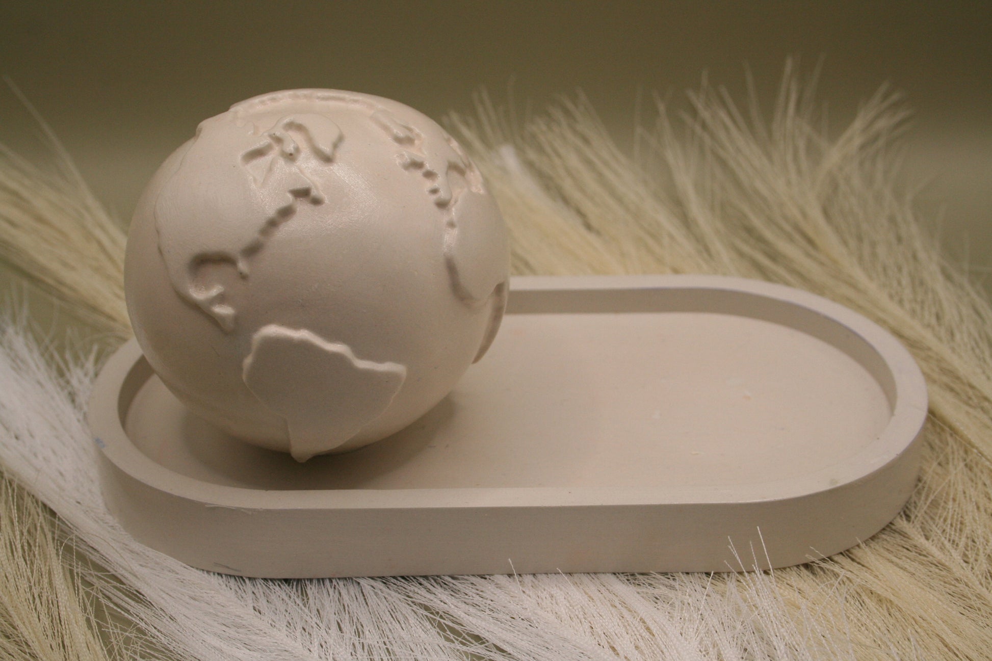 Pour les âmes voyageuses, notre ensemble "Globetrotter" est un incontournable. Il se compose d'un plateau ovale et d'une sphère terrestre, coulés en résine naturelle d'une élégante teinte beige. Chaque relief des continents est finement détaillé, invitant à la contemplation et au rêve d'évasion. Un objet de décoration unique et significatif pour un bureau ou une table basse.
