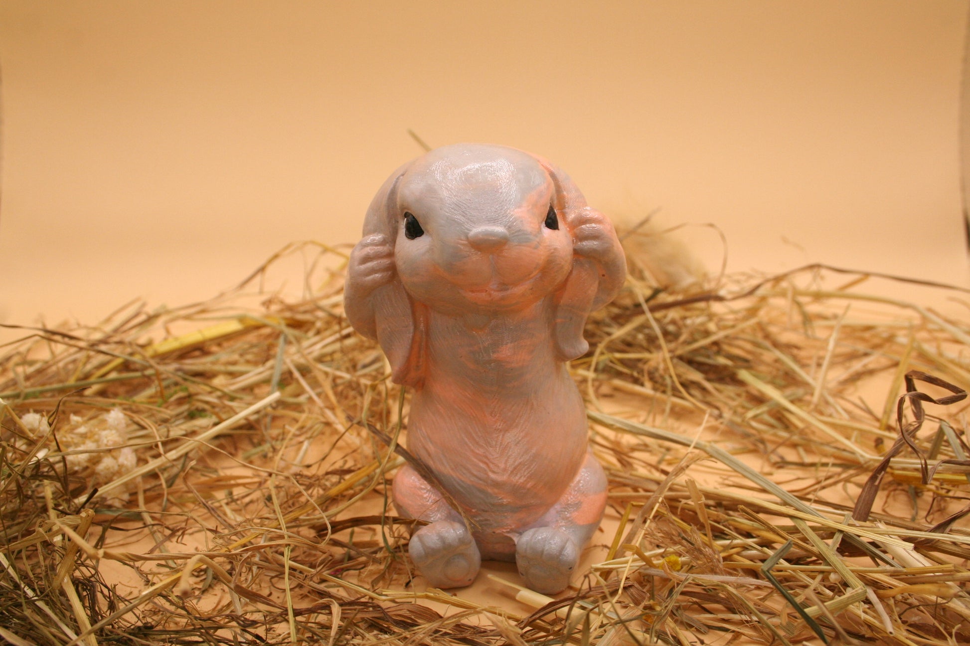 Petite sculpture en résine représentant un lapin debout, les pattes levées pour tenir ses longues oreilles.