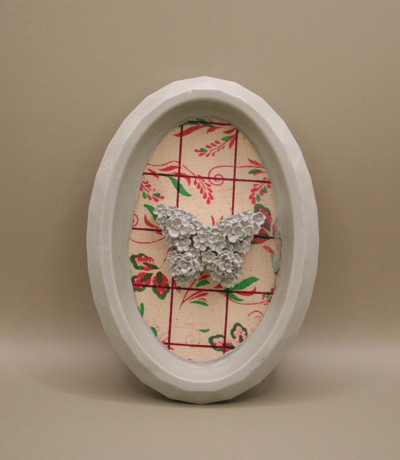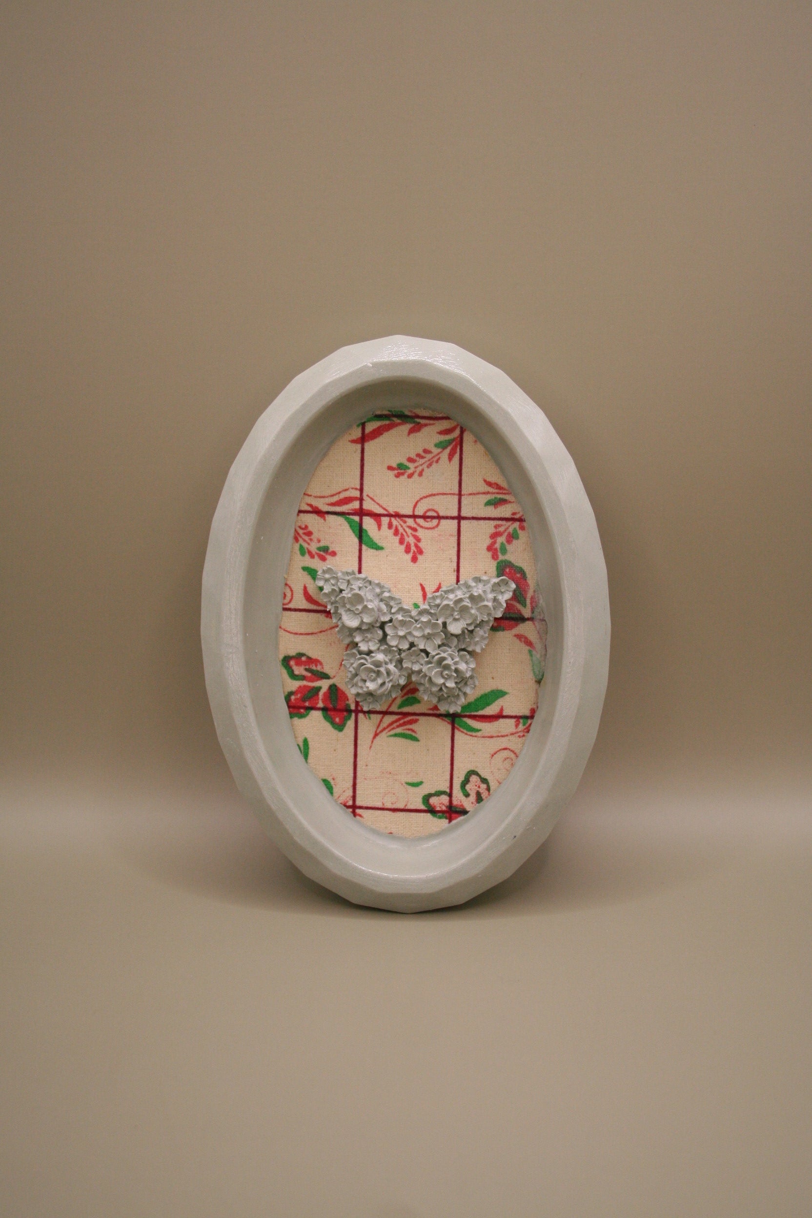 Sublimez votre intérieur avec ce cadre ovale en résine naturelle, mettant en valeur un délicat papillon orné de fleurs en relief, posé sur un fond textile à motif rétro rouge et vert. Une pièce unique qui mêle douceur et nostalgie, parfaite pour un mur de salon, une chambre ou un coin lecture.