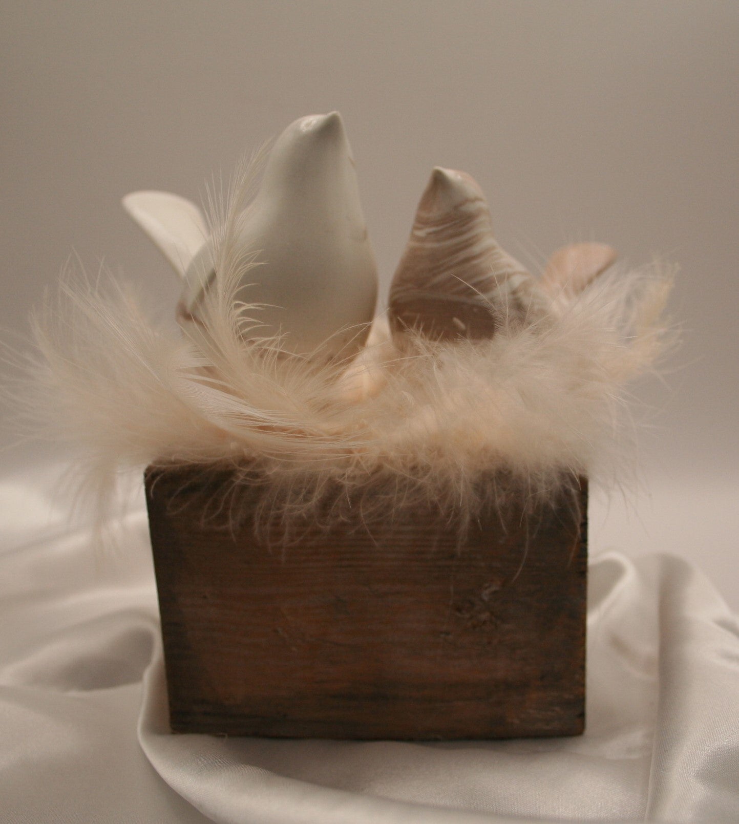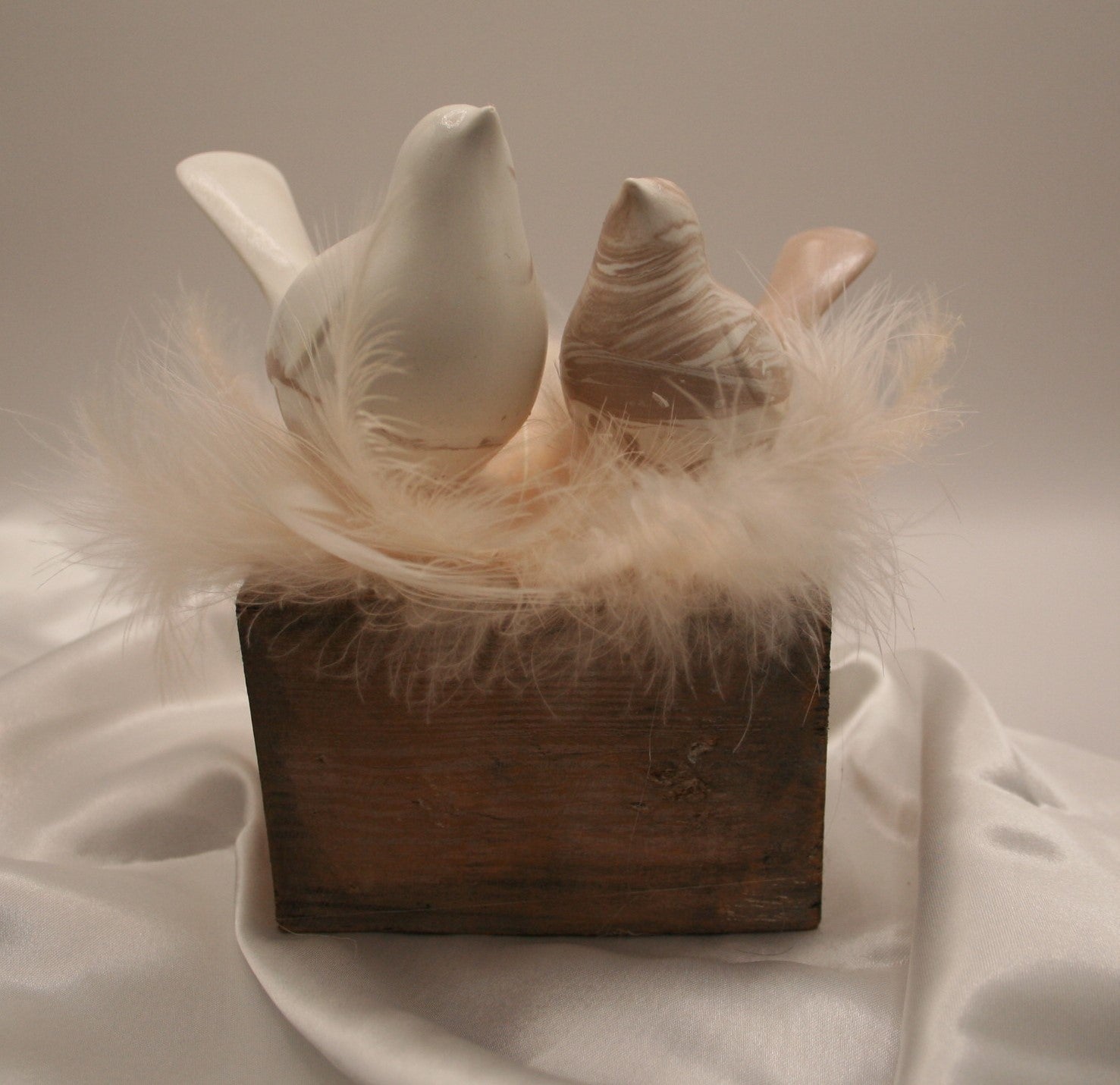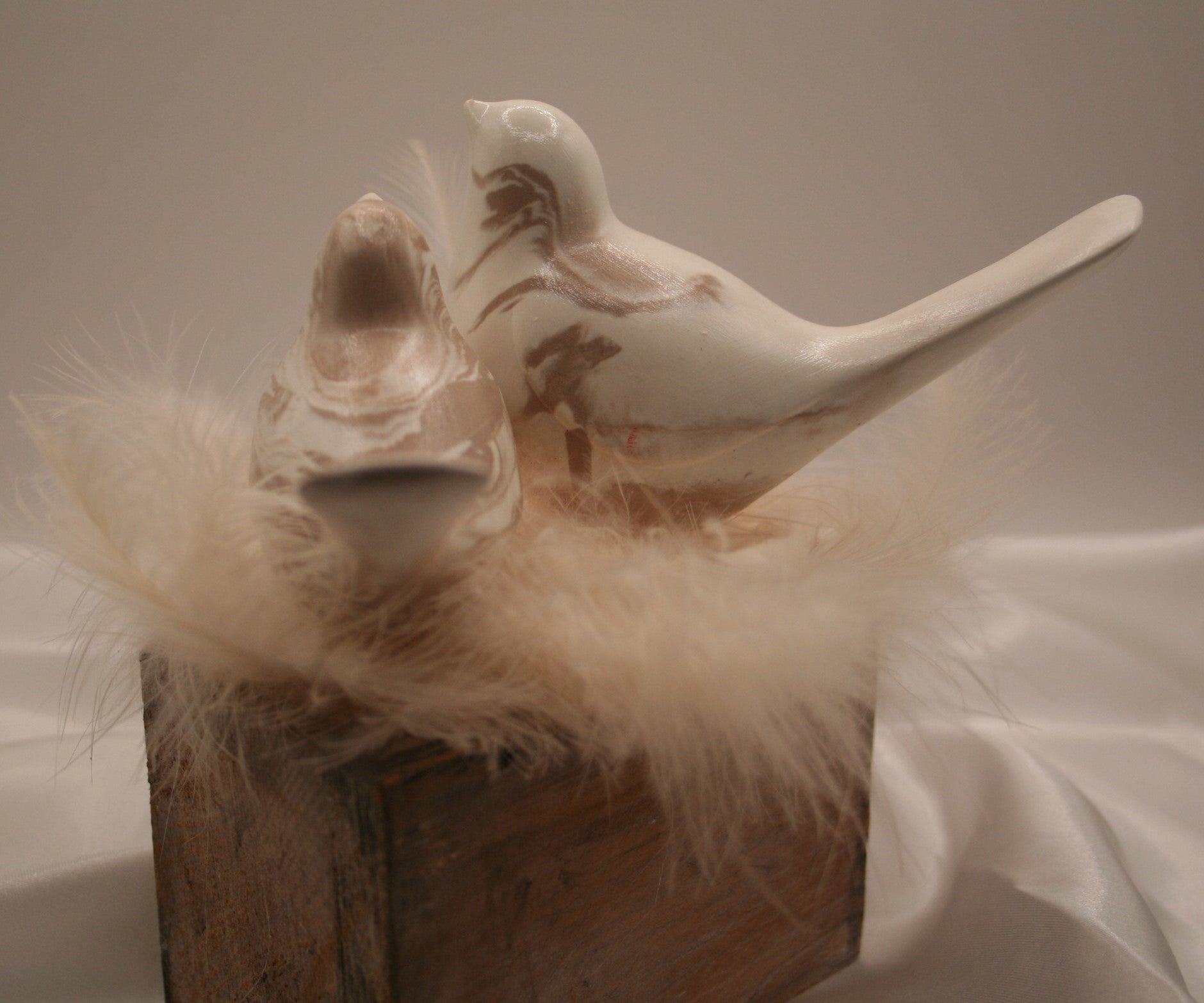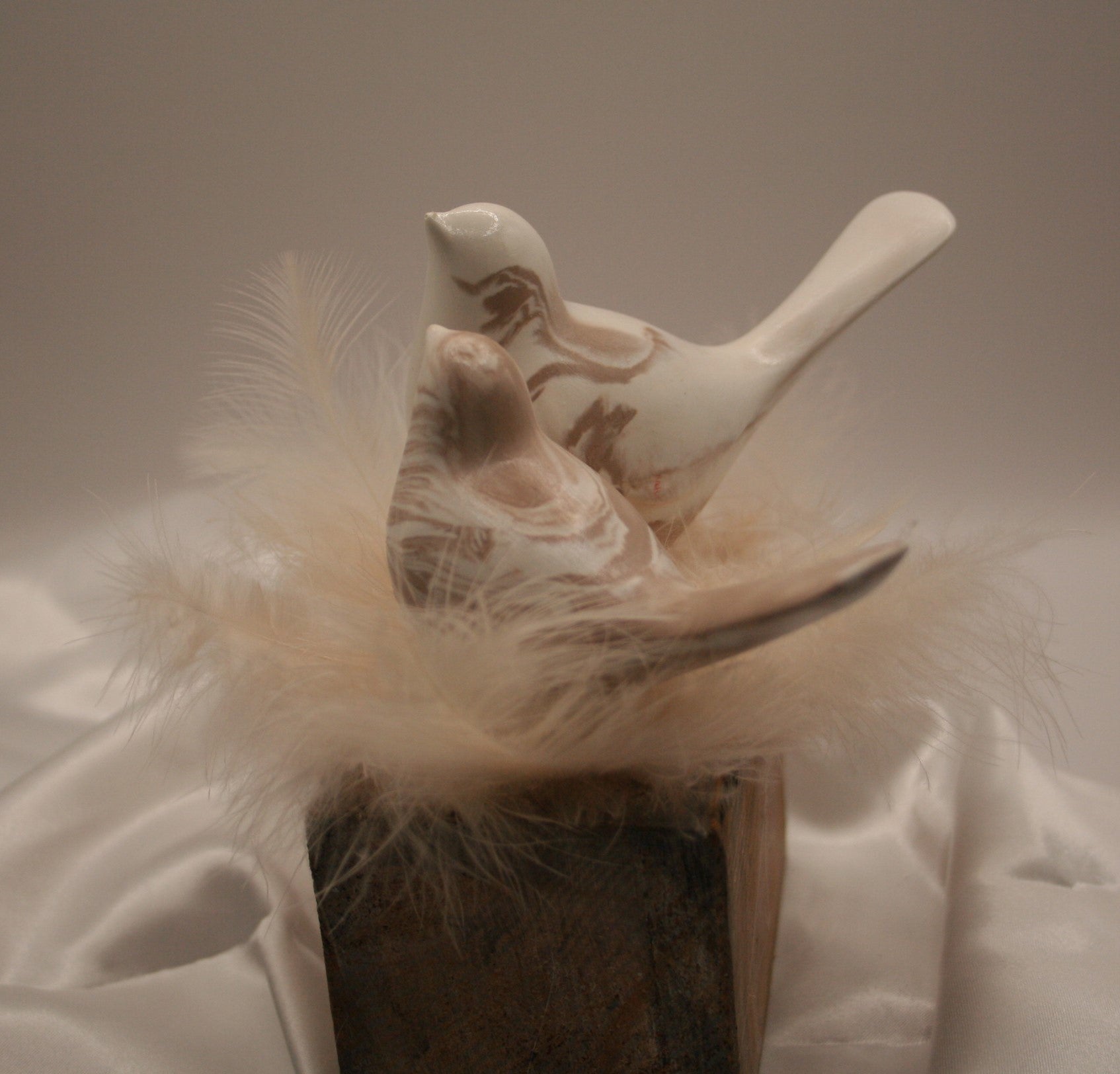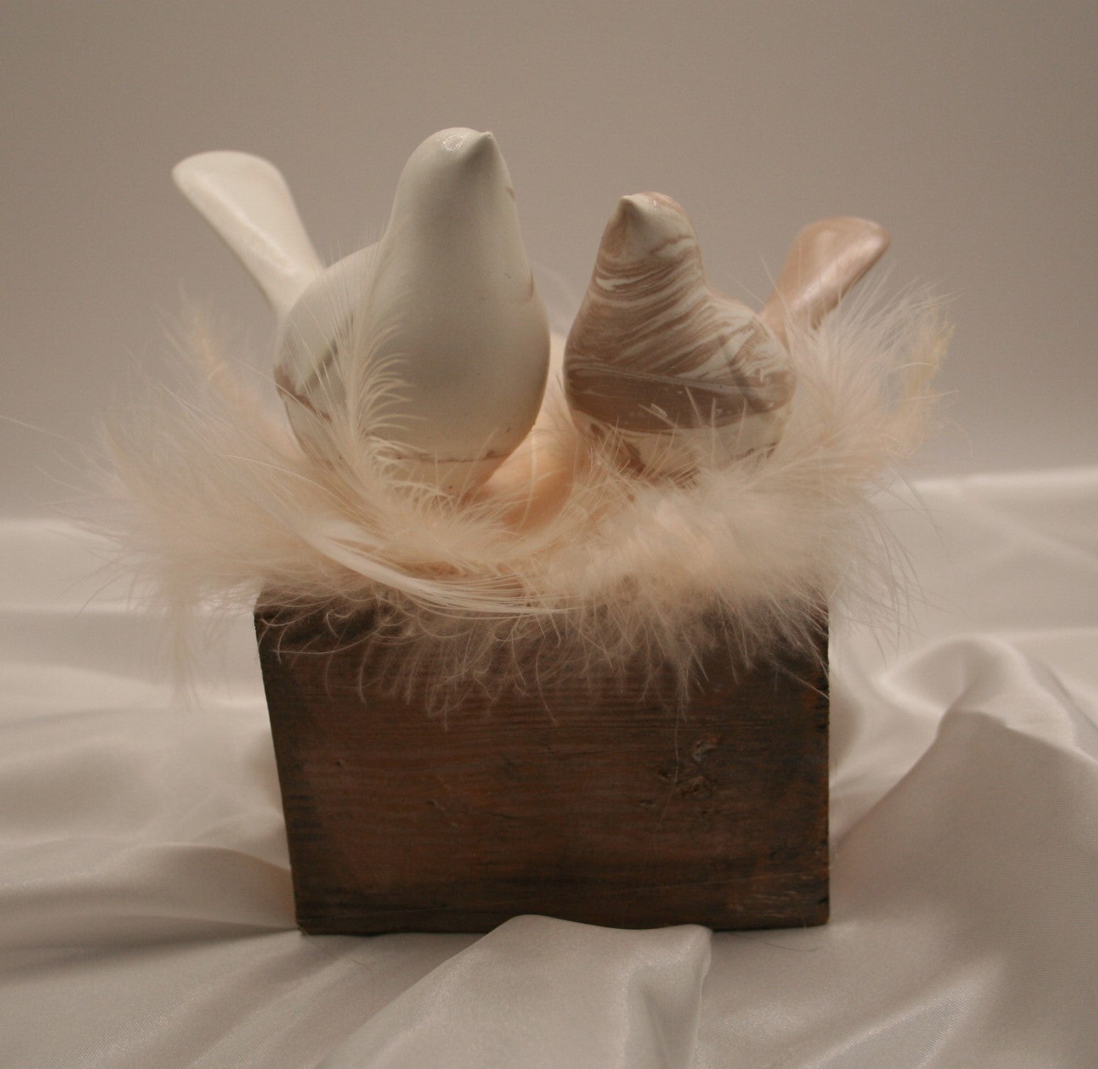 Deux petits oiseaux en résine naturelle reposent tendrement sur un nid de plumes douces, installés sur un socle en bois brut. L’un en blanc uni, l’autre marbré de nuances naturelles, ce duo évoque la complicité, la douceur et l’harmonie.