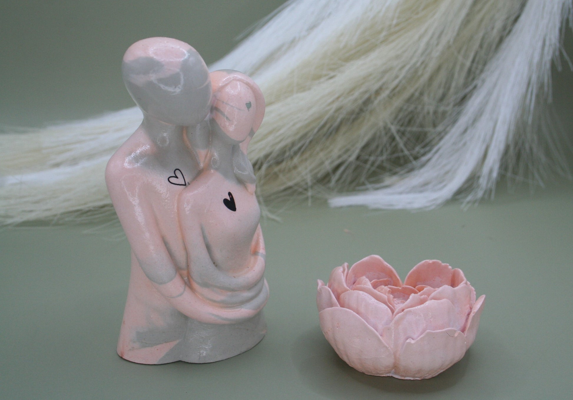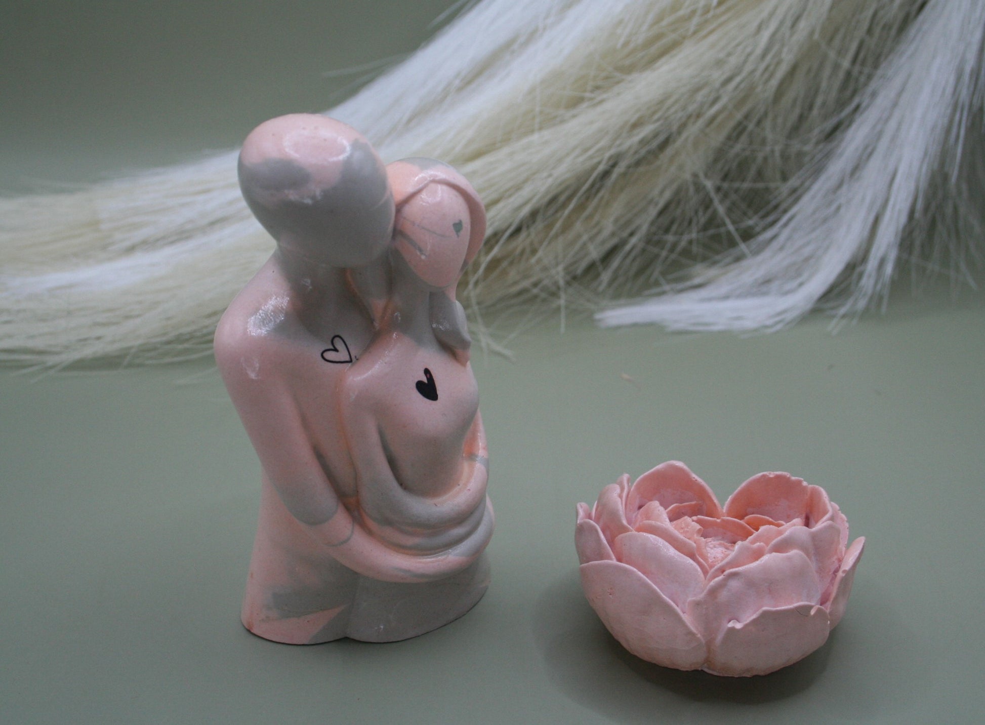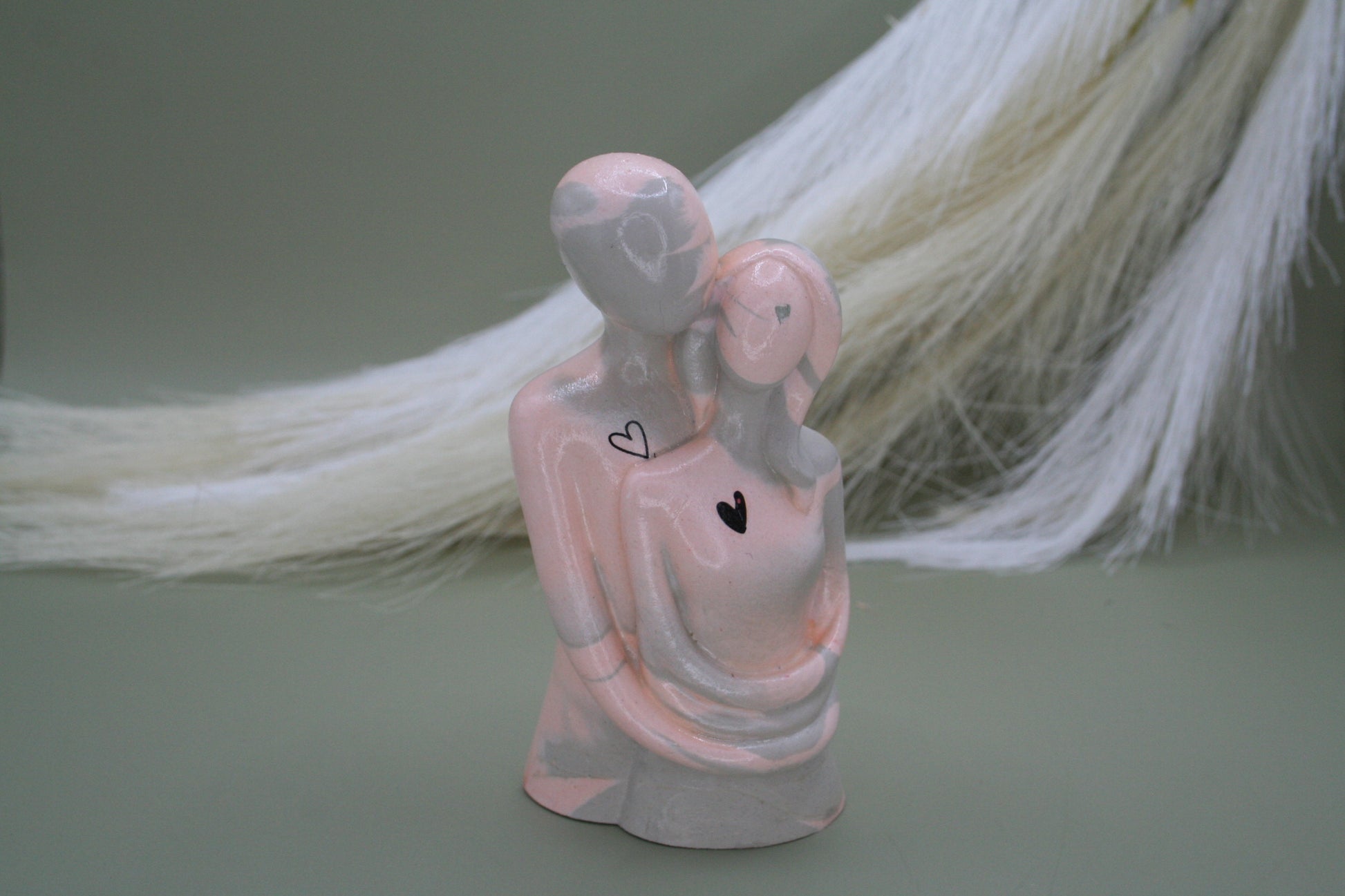 Deux silhouettes humaines abstraites, en résine naturelle , s’enlacent dans une étreinte délicate. Les cœurs dessinés sur leur poitrine symbolisent l’union des âmes. Cette œuvre minimaliste célèbre l’intimité et la connexion émotionnelle, tout en apportant une touche artistique et chaleureuse à ton espace.