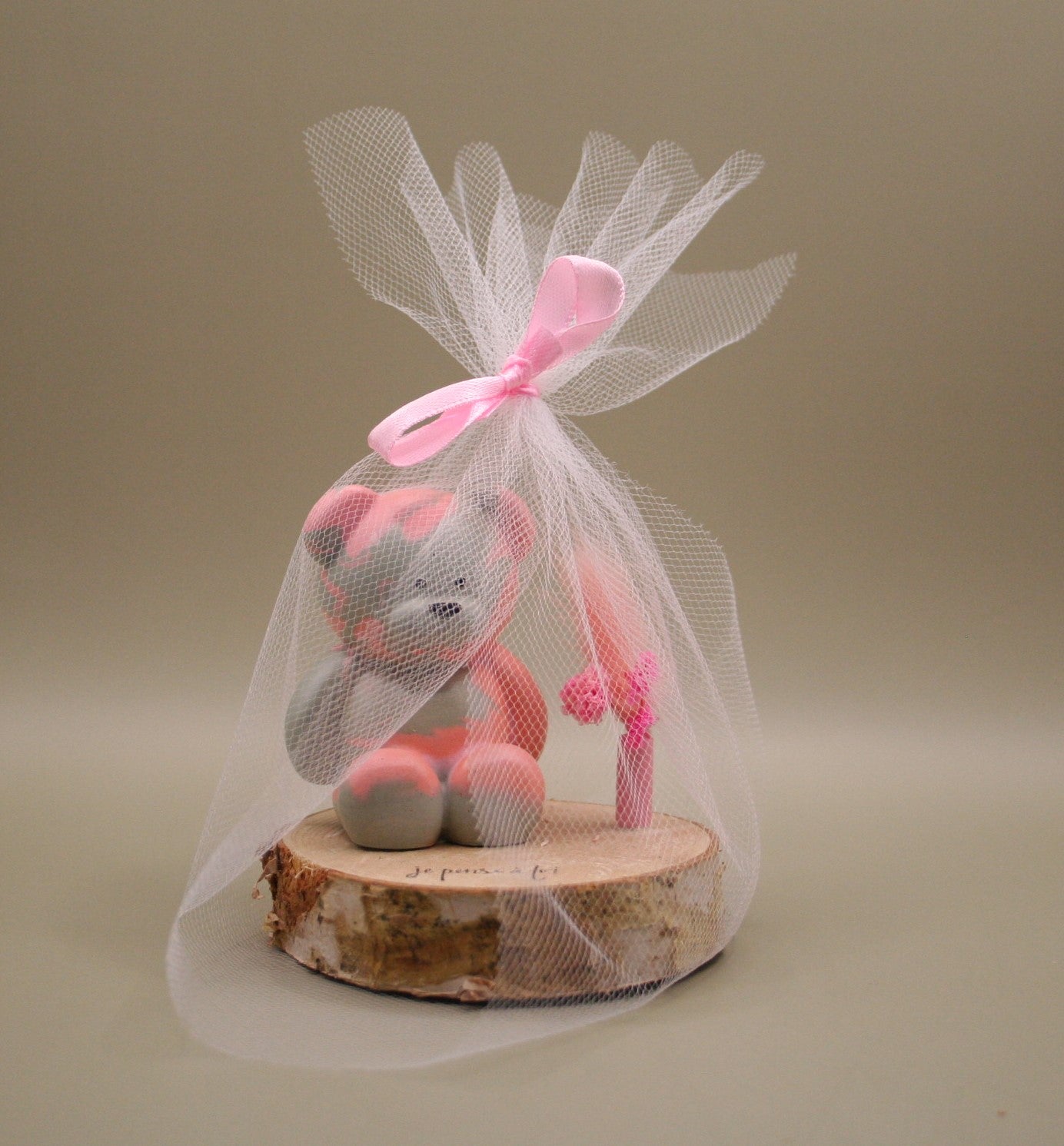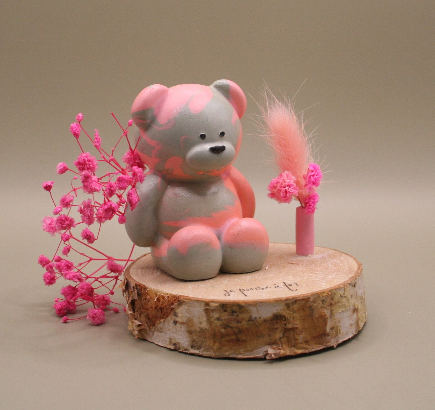 Un cadeau qui parle au cœur. Ce set à message se compose d'un adorable ourson en résine, au motif marbré gris et rose, et d'un petit pot de fleurs séchées assorti, le tout posé sur une base en bois brut. L'inscription "je pense à toi" est délicatement posé, faisant de cet objet le messager parfait pour exprimer votre affection, votre soutien ou simplement pour faire plaisir.