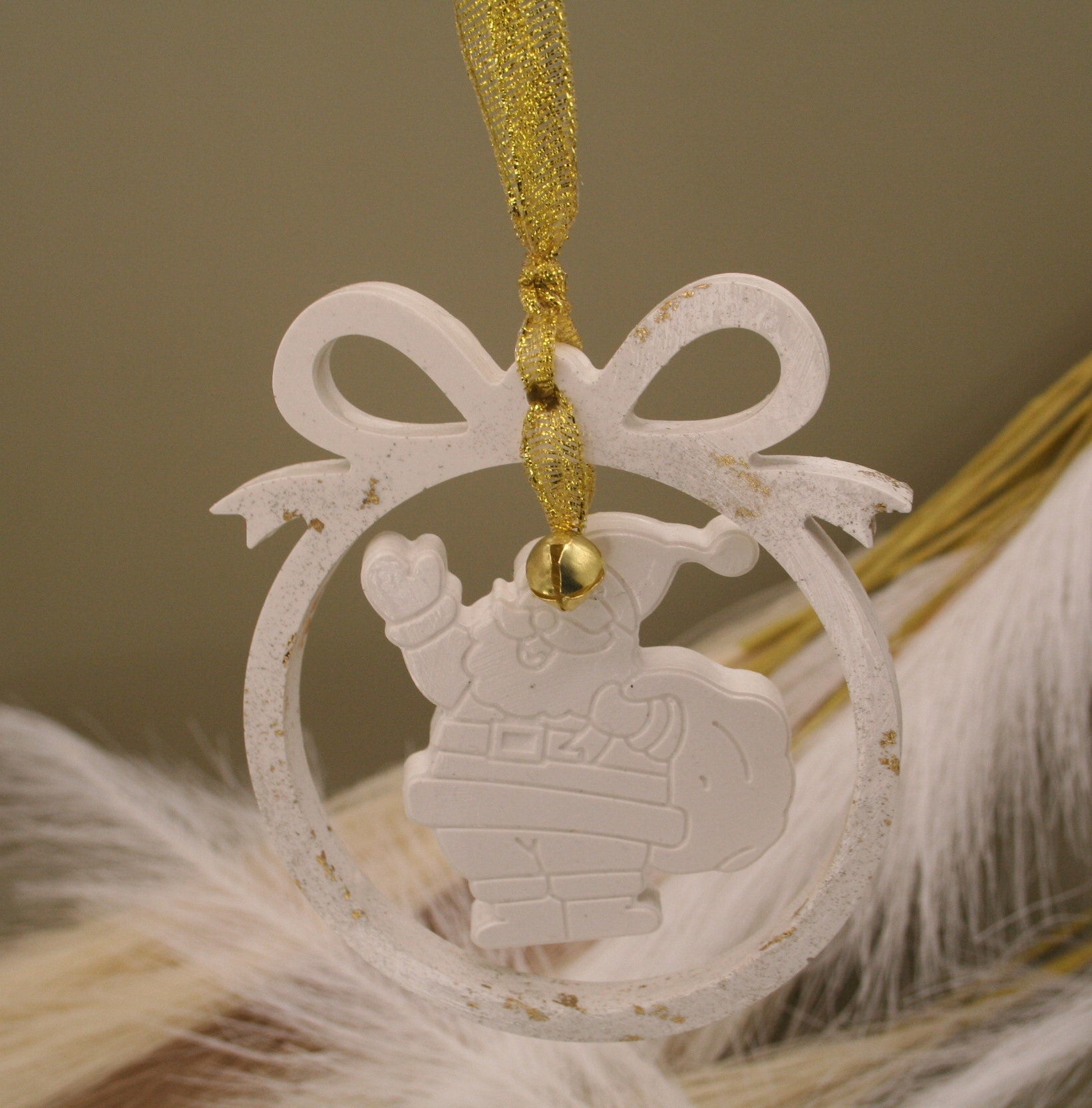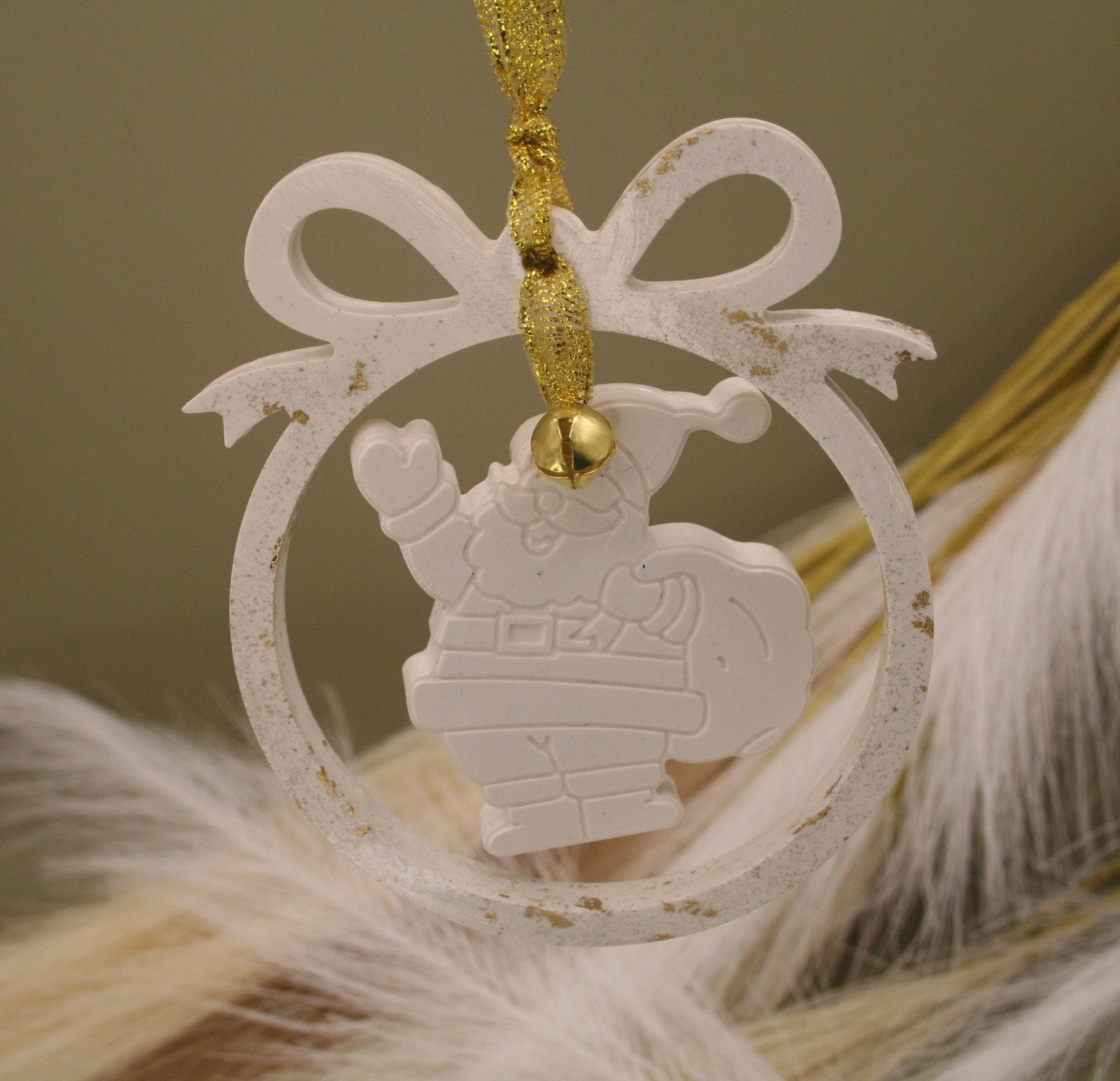 Ajoutez une touche de tradition et d’élégance à votre décoration de fêtes avec ce Médaillon du Père Noël, un médaillon raffiné en silhouette blanche représentant le Père Noël dans son iconique tenue. Suspendu par un ruban doré orné d’une clochette scintillante, cet ornement incarne l’esprit chaleureux et joyeux de Noël.