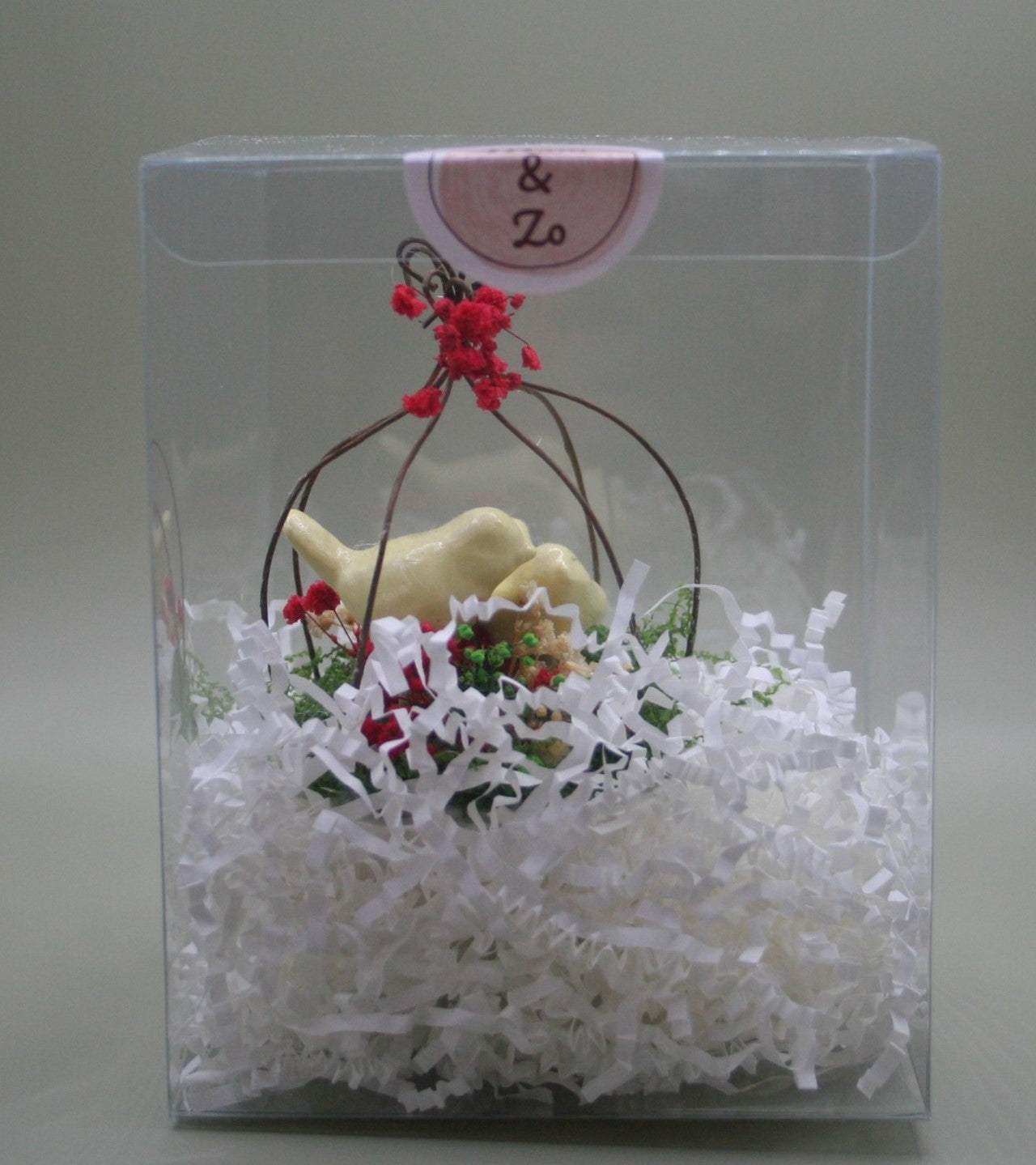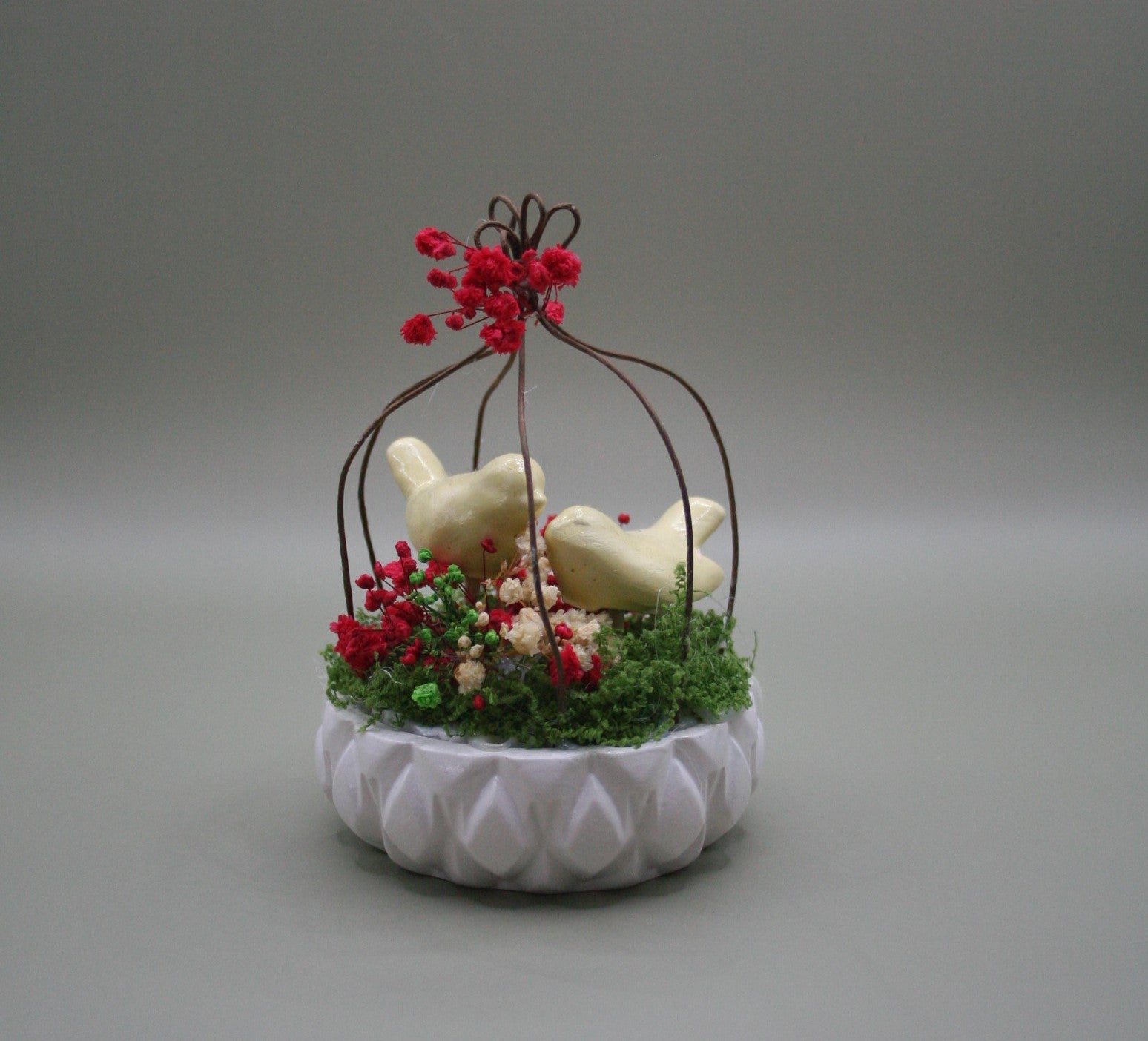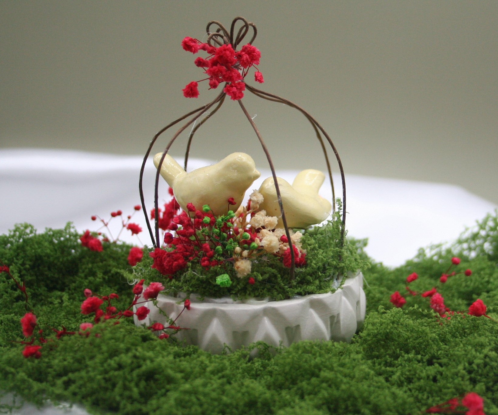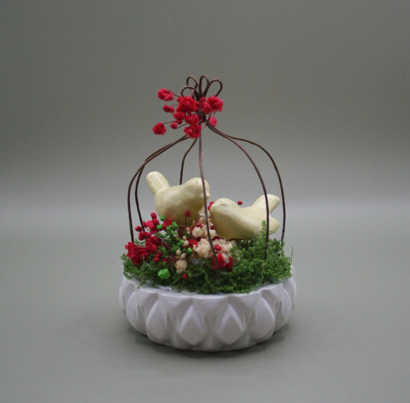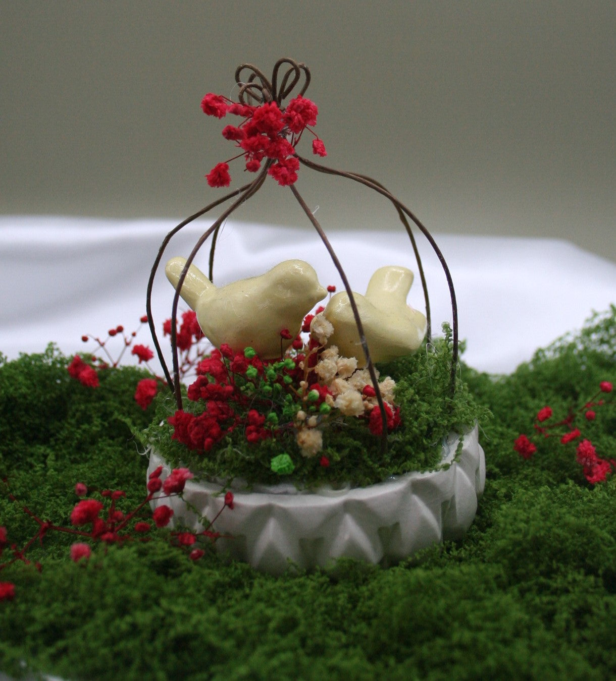 Deux adorables oiseaux pastel perchés au cœur d’un écrin végétal évoquent tendresse et douceur. La structure en fil métallique brun surplombée d’un bouquet de fleurs aérien donne un effet de légèreté tout en sublimant l’ensemble.