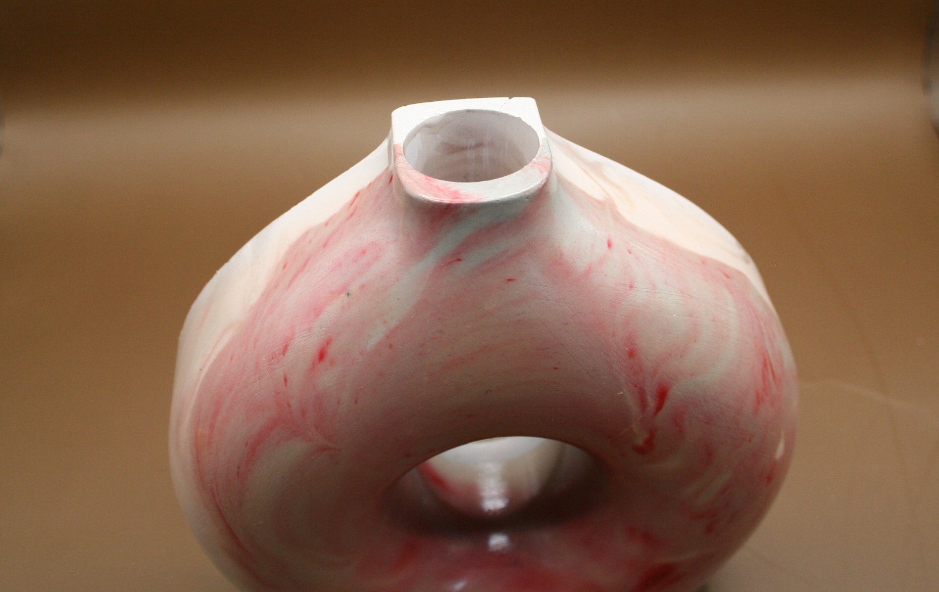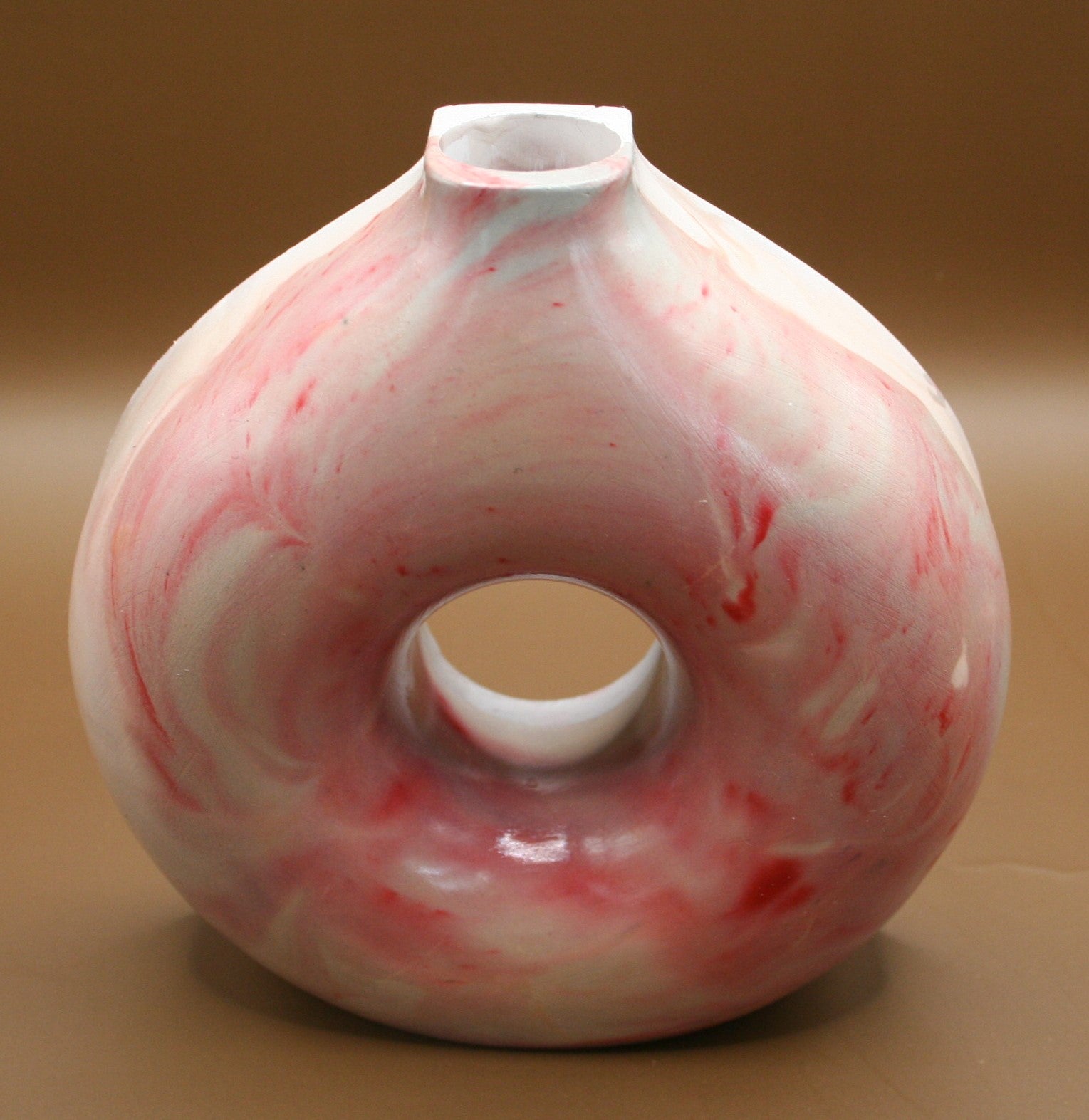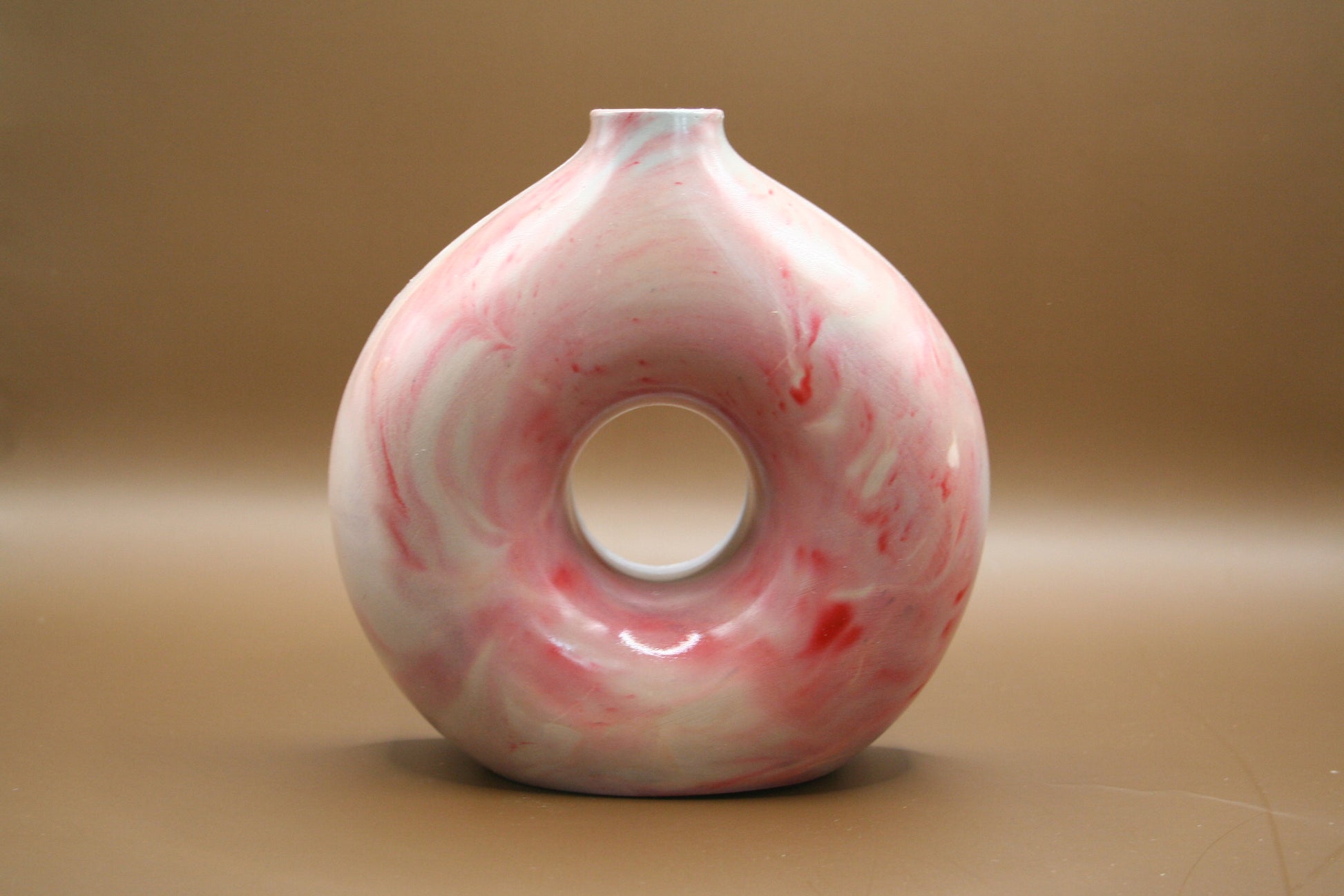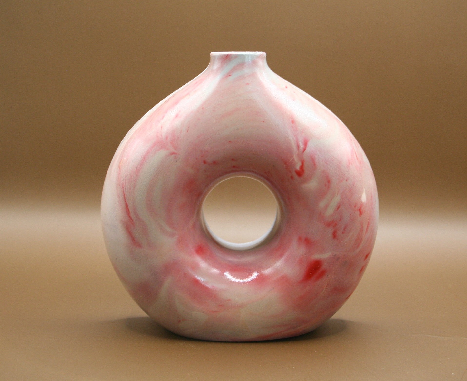 Minimaliste et élégant, ce vase en forme d'anneau est un objet de décoration incontournable. Son design unique, avec une ouverture centrale, et ses couleurs marbrées de rose et de blanc, apportent une touche de douceur et de modernité. Parfait pour accueillir quelques fleurs séchées ou simplement comme pièce maîtresse décorative sur une table ou une étagère.