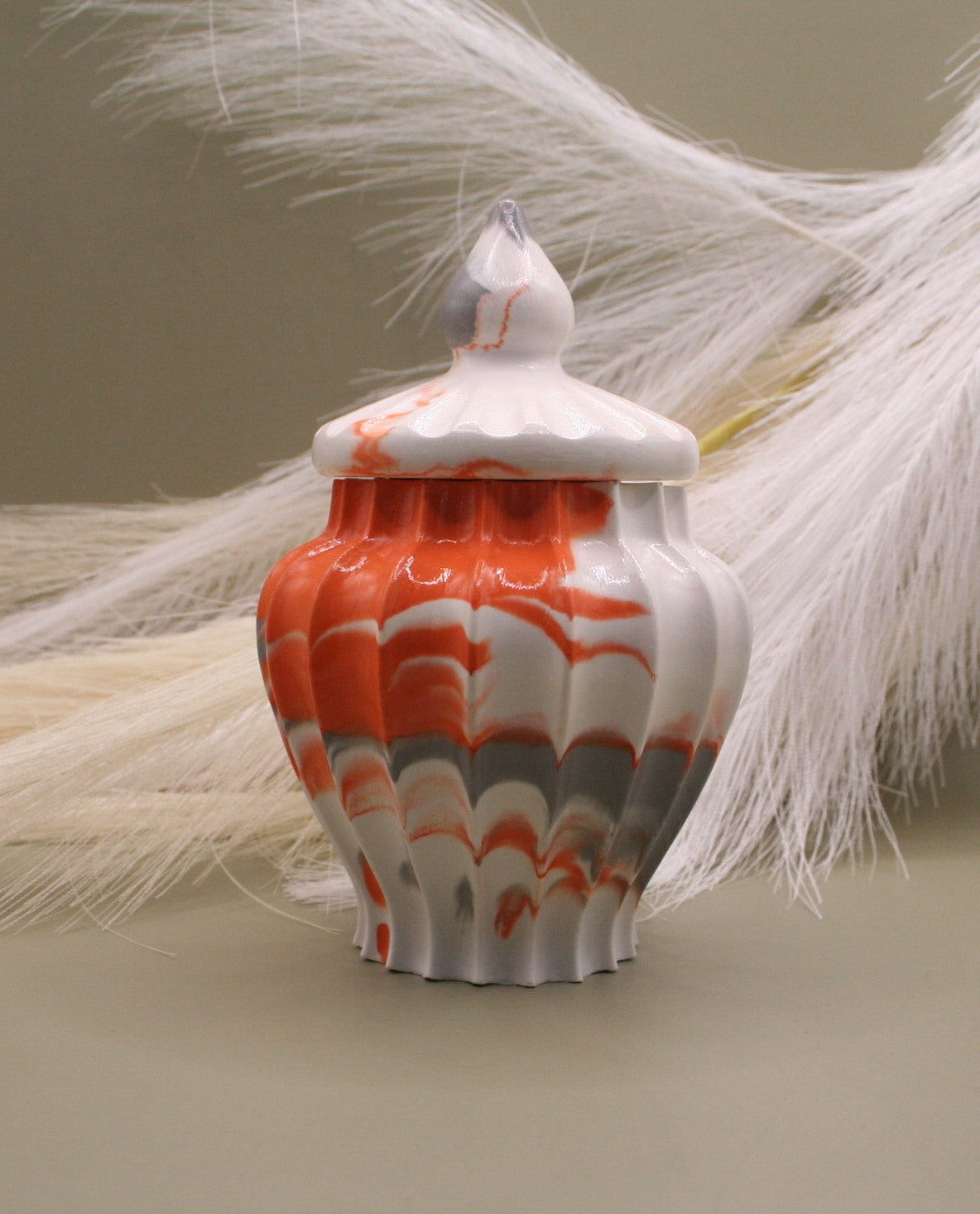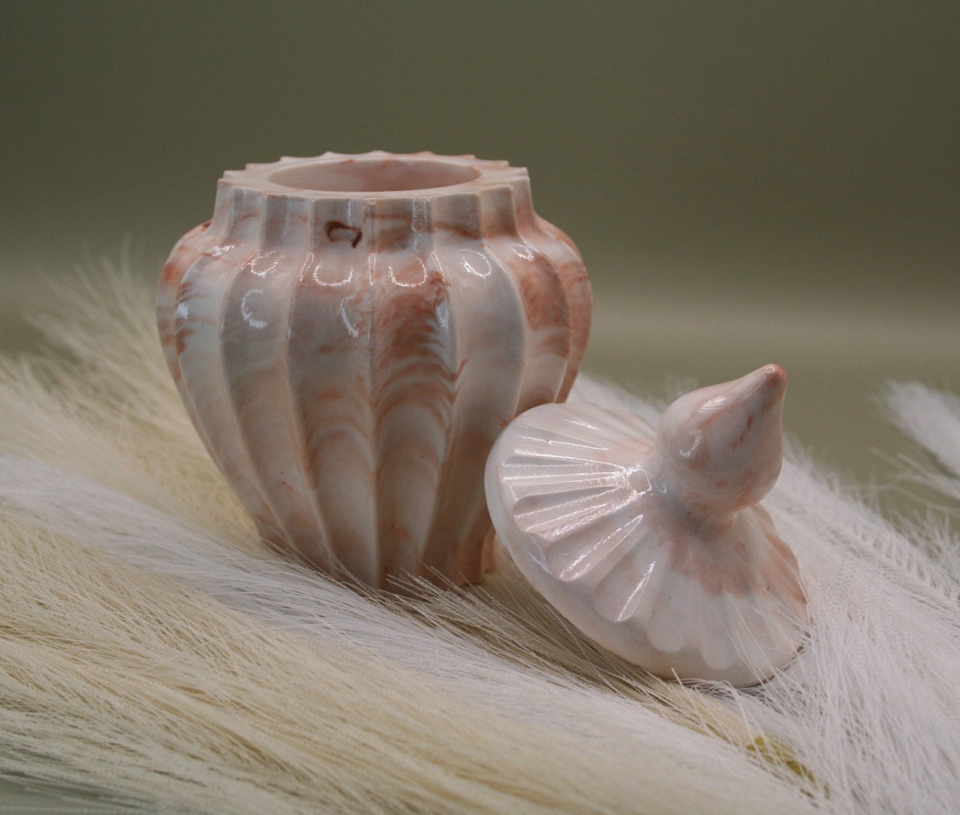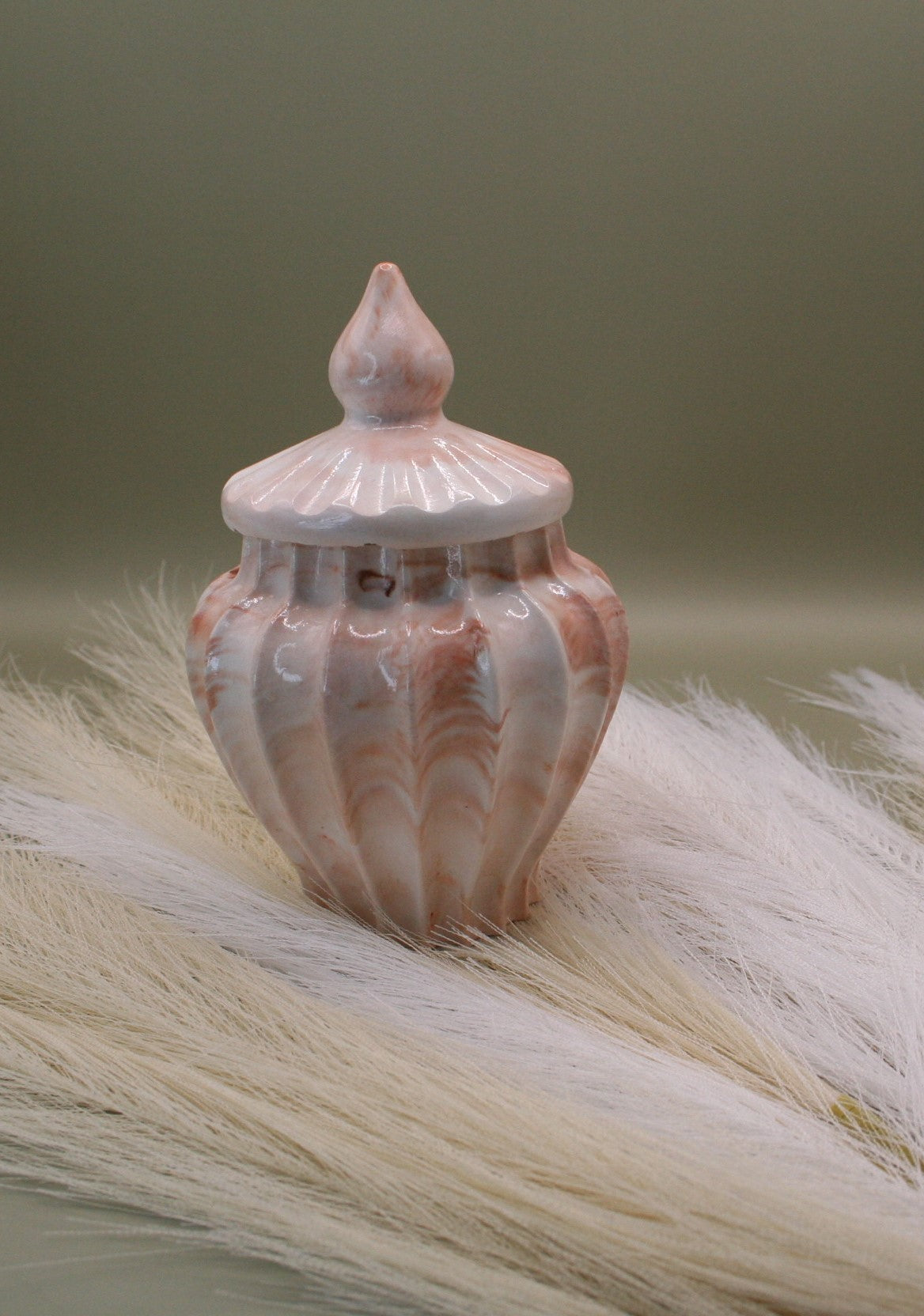 Petit pot raffiné en résine naturelle, sa forme galbée et son couvercle sculpté lui confèrent un charme unique. Parfait pour ranger de petits objets, des bijoux ou simplement embellir une étagère.
