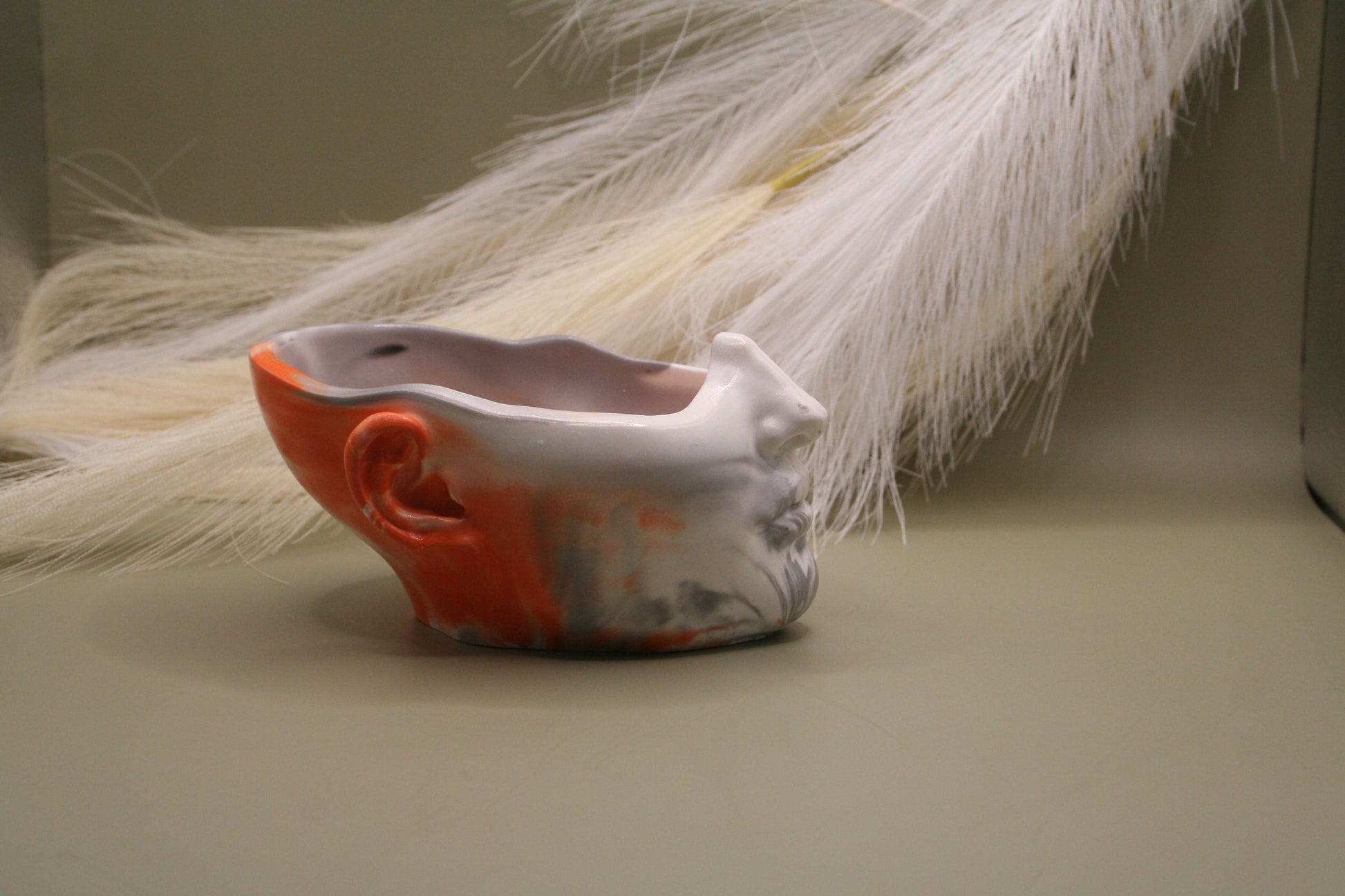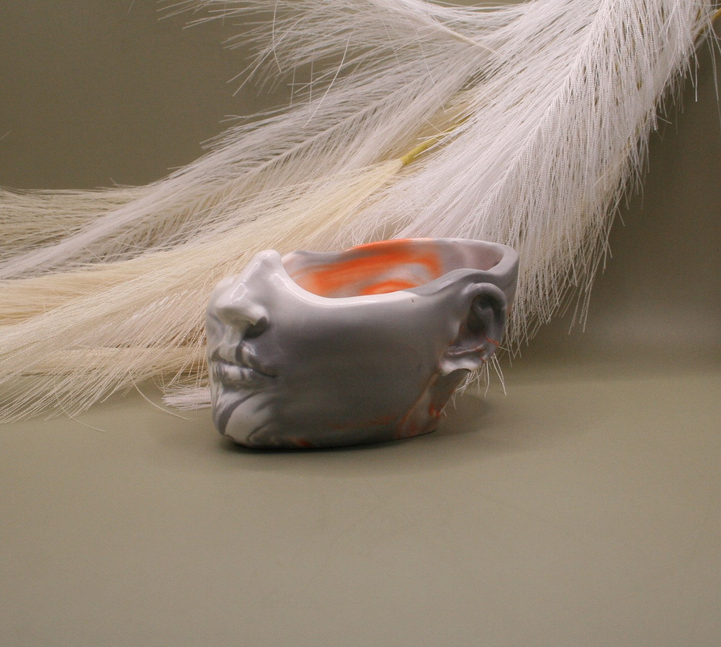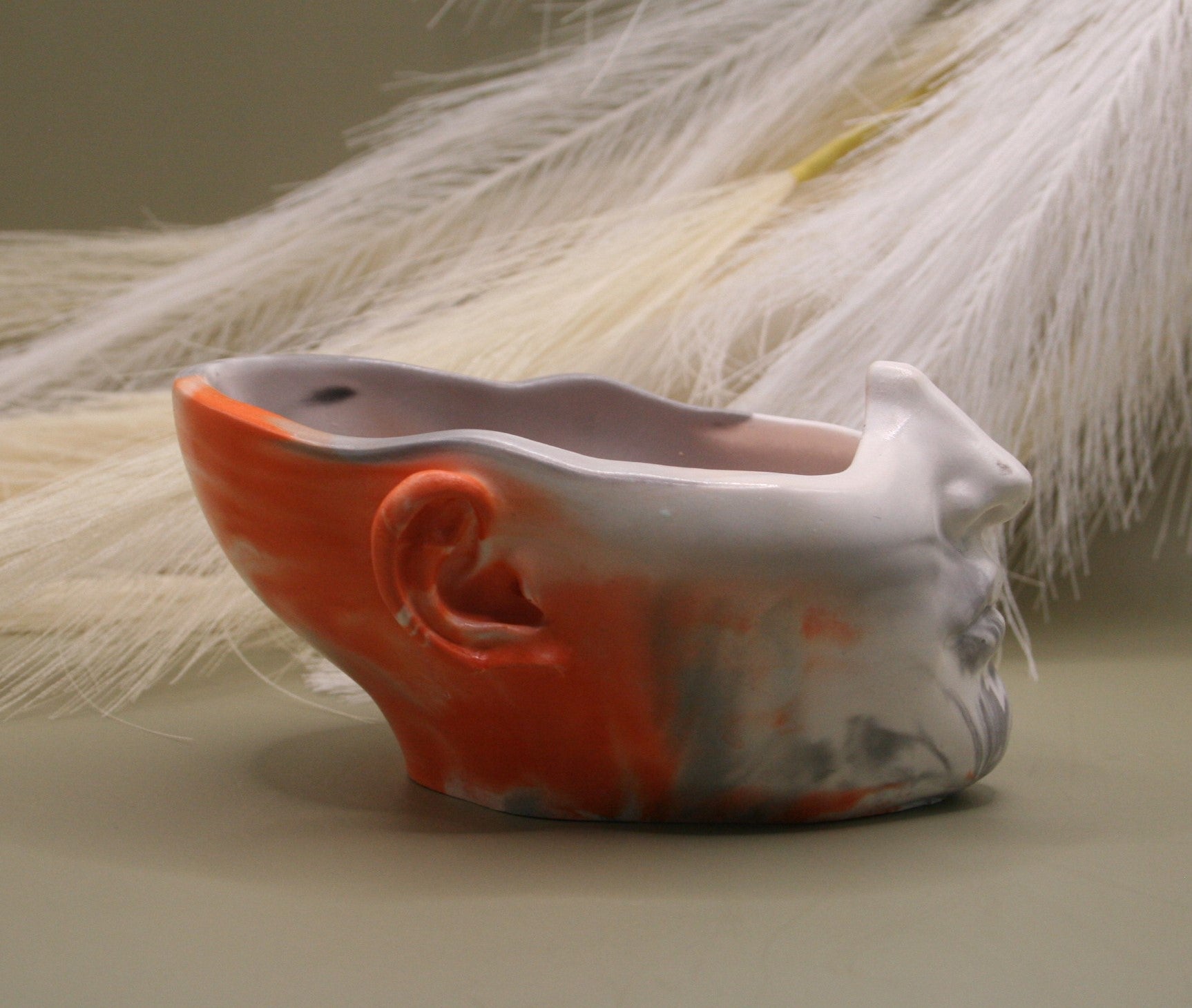 Cette décoration est en forme de demi-tête raffinée en résine naturelle, orné d’un motif marbré dans les tons orange, gris et blanc. Sa forme galbée et se visage sculpté lui confèrent un charme unique. Parfait pour ranger de petits objets, des bijoux ou simplement embellir une étagère.