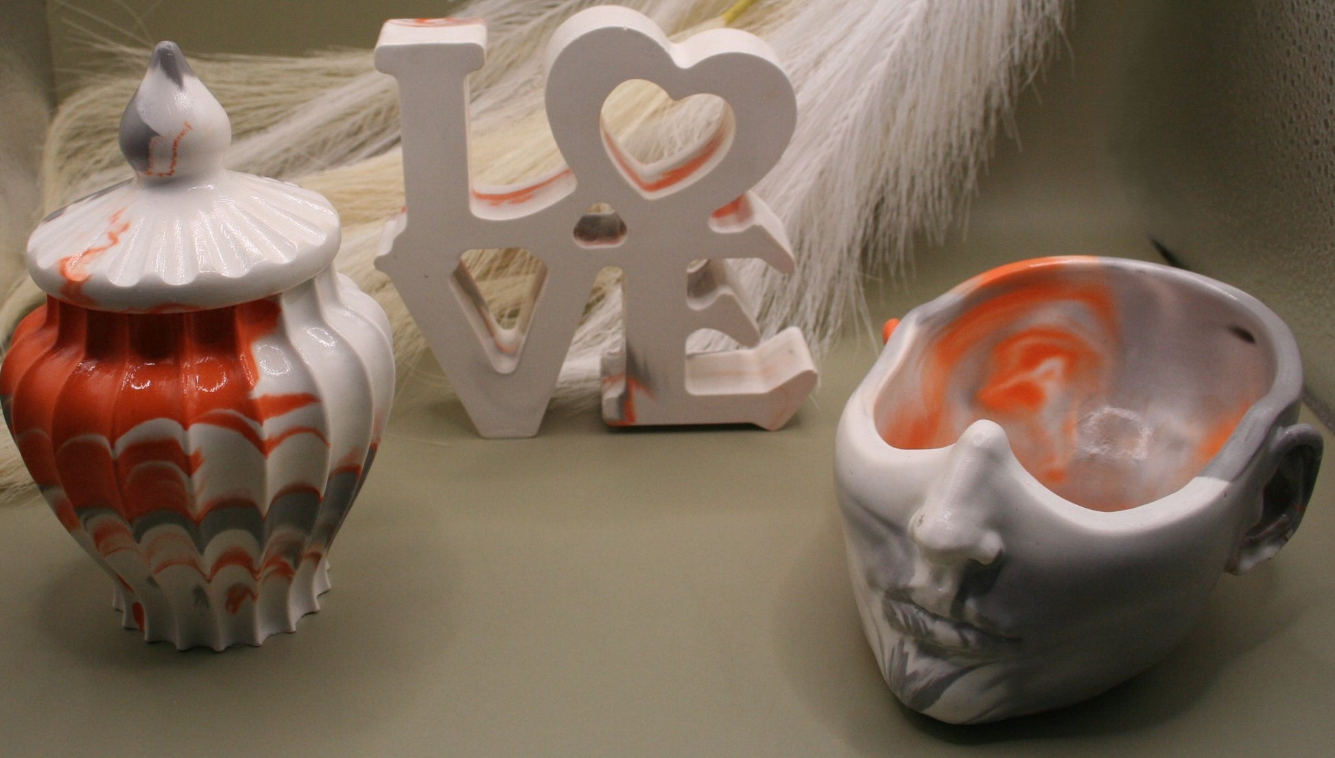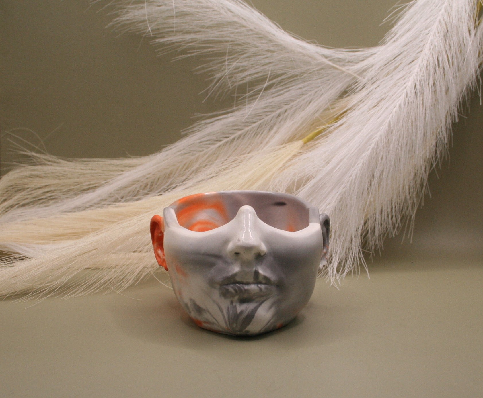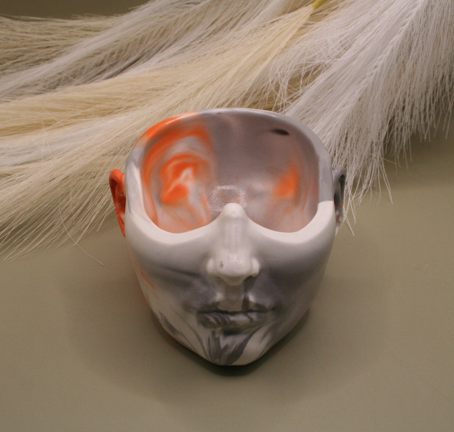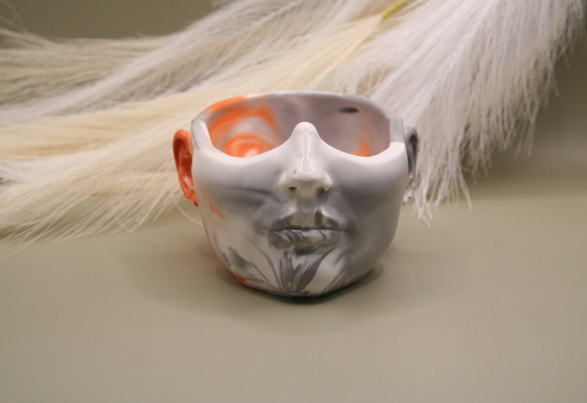 Cette décoration est en forme de demi-tête raffinée en résine naturelle, orné d’un motif marbré dans les tons orange, gris et blanc. Sa forme galbée et se visage sculpté lui confèrent un charme unique. Parfait pour ranger de petits objets, des bijoux ou simplement embellir une étagère.