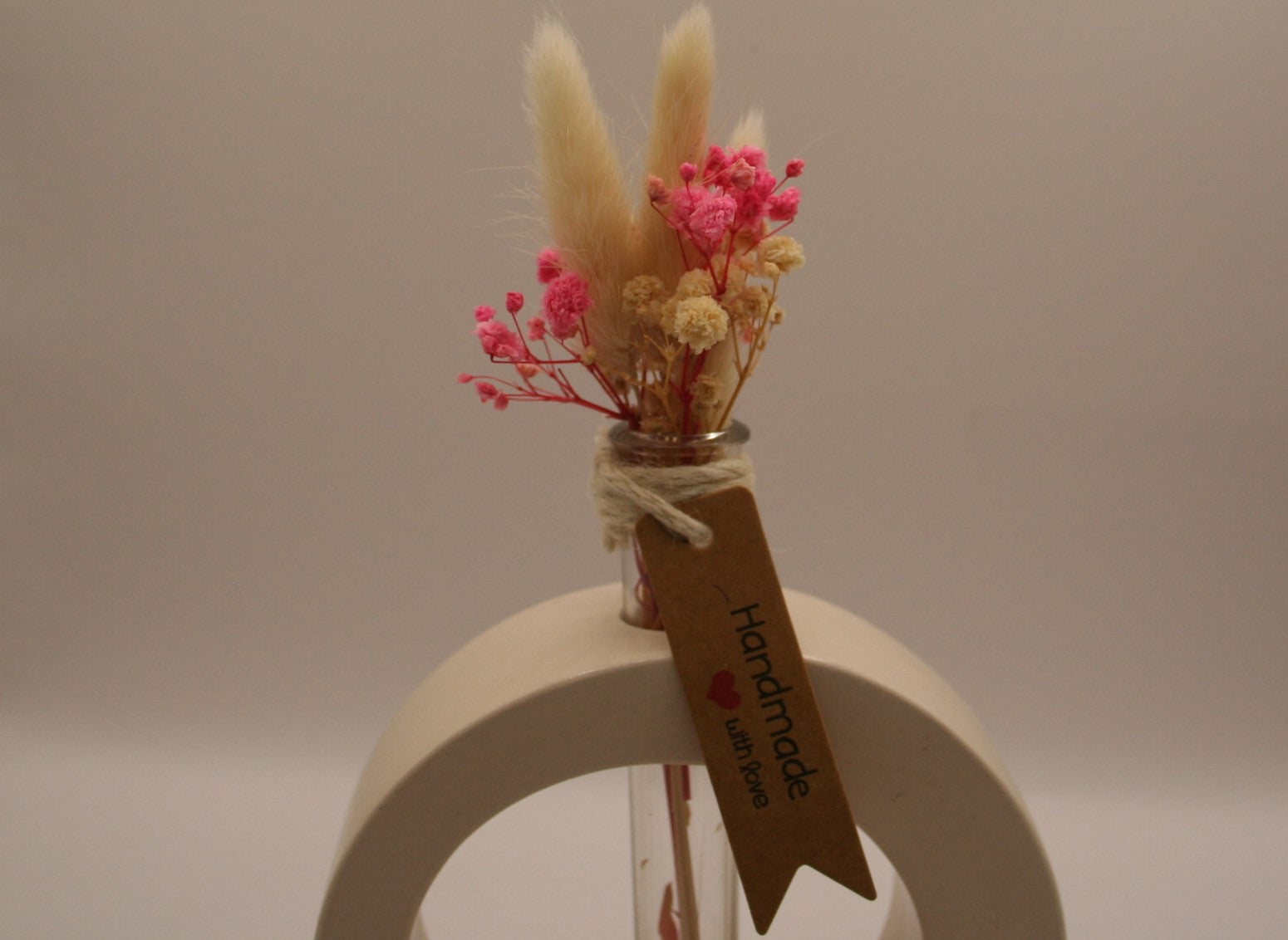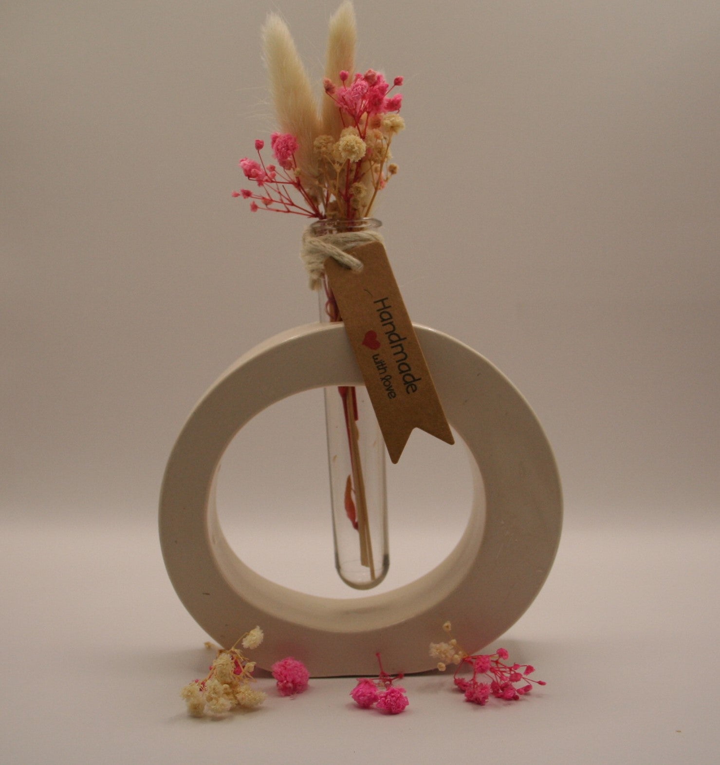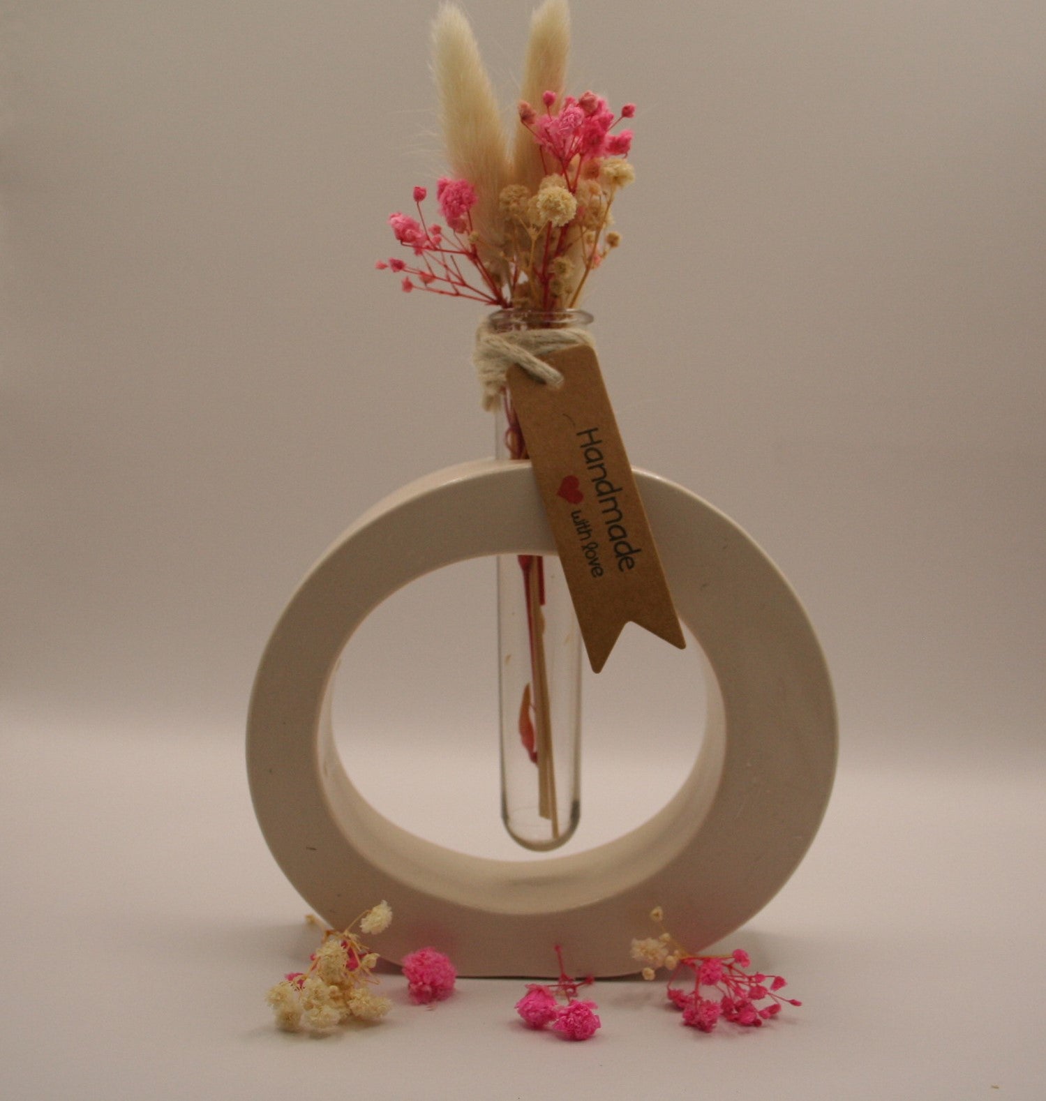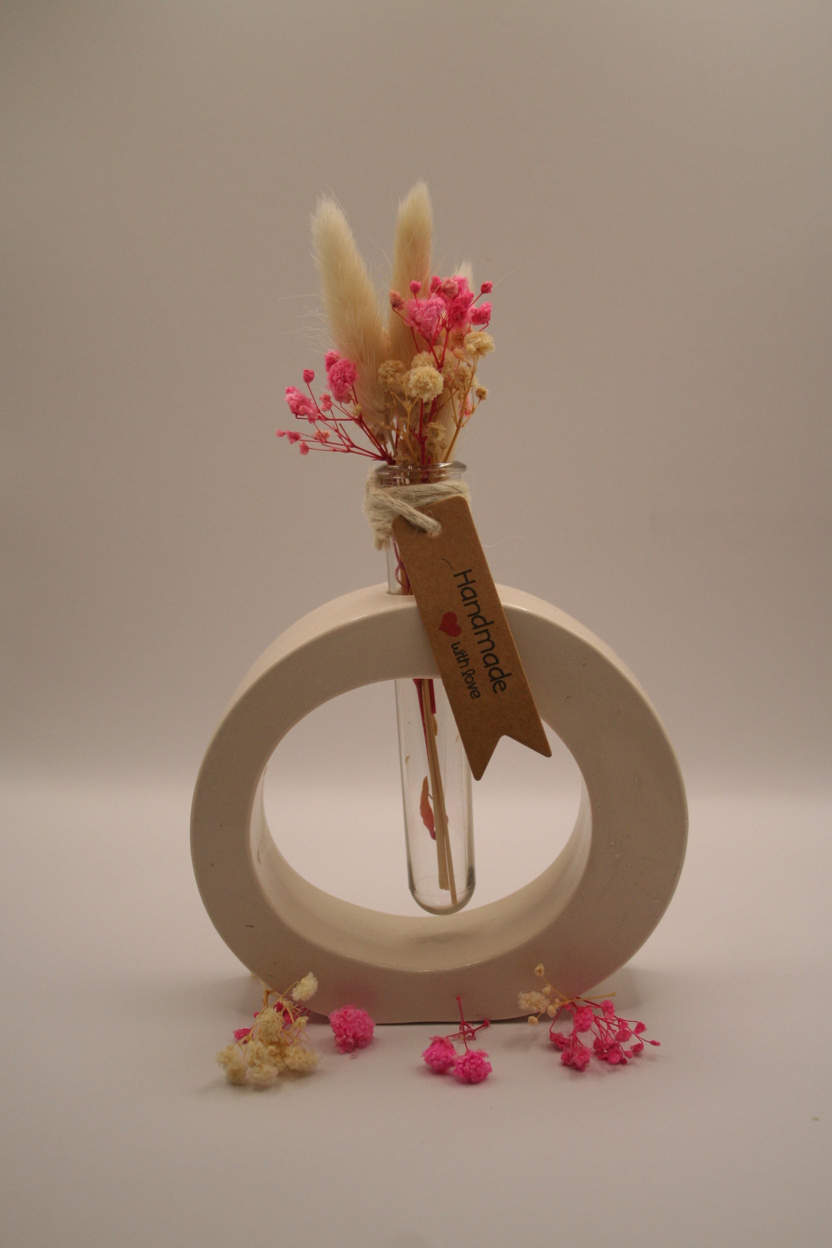 Une pièce au design contemporain, cette sculpture circulaire en résine naturelle intègre un petit tube en verre rempli d'un bouquet de fleurs séchées rose fuchsia, crème et blanches, dont de délicates pampas. Idéal comme objet déco minimaliste ou cadeau poétique.