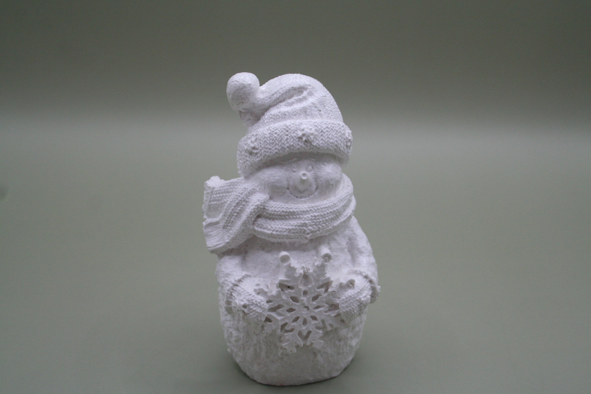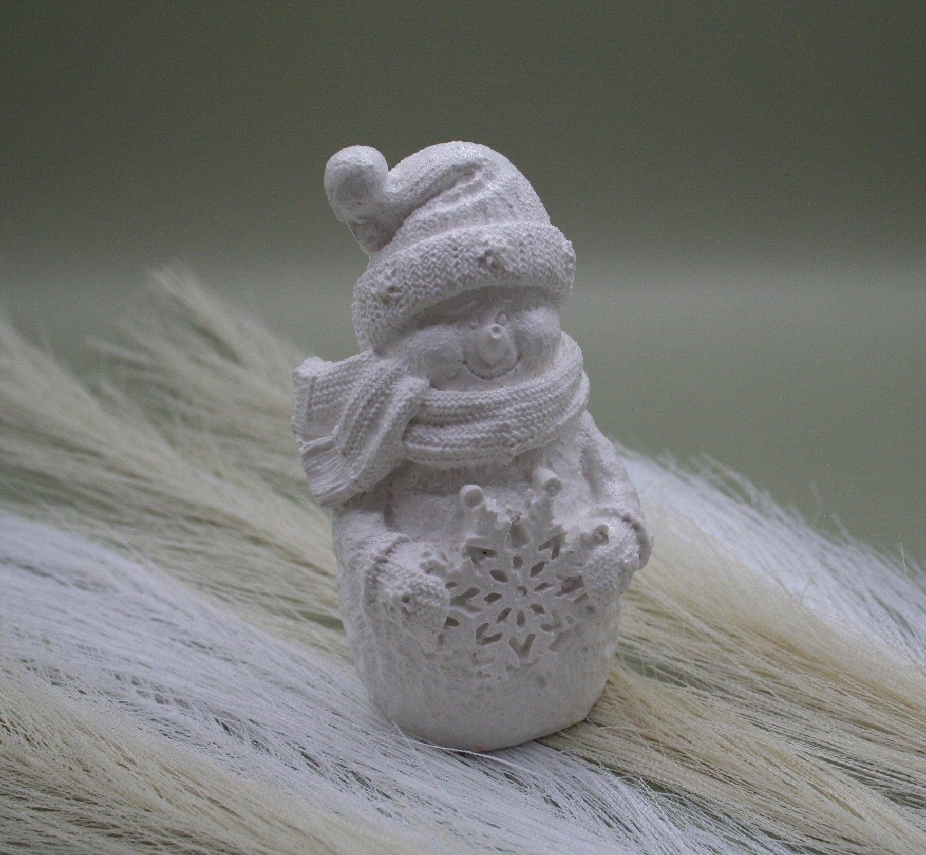 Ce bonhomme de neige tout en rondeur arbore un bonnet, une écharpe et des moufles finement texturés, comme tricotés à la main. Son sourire doux et son flocon entre les mains évoquent la magie des premiers jours d’hiver.