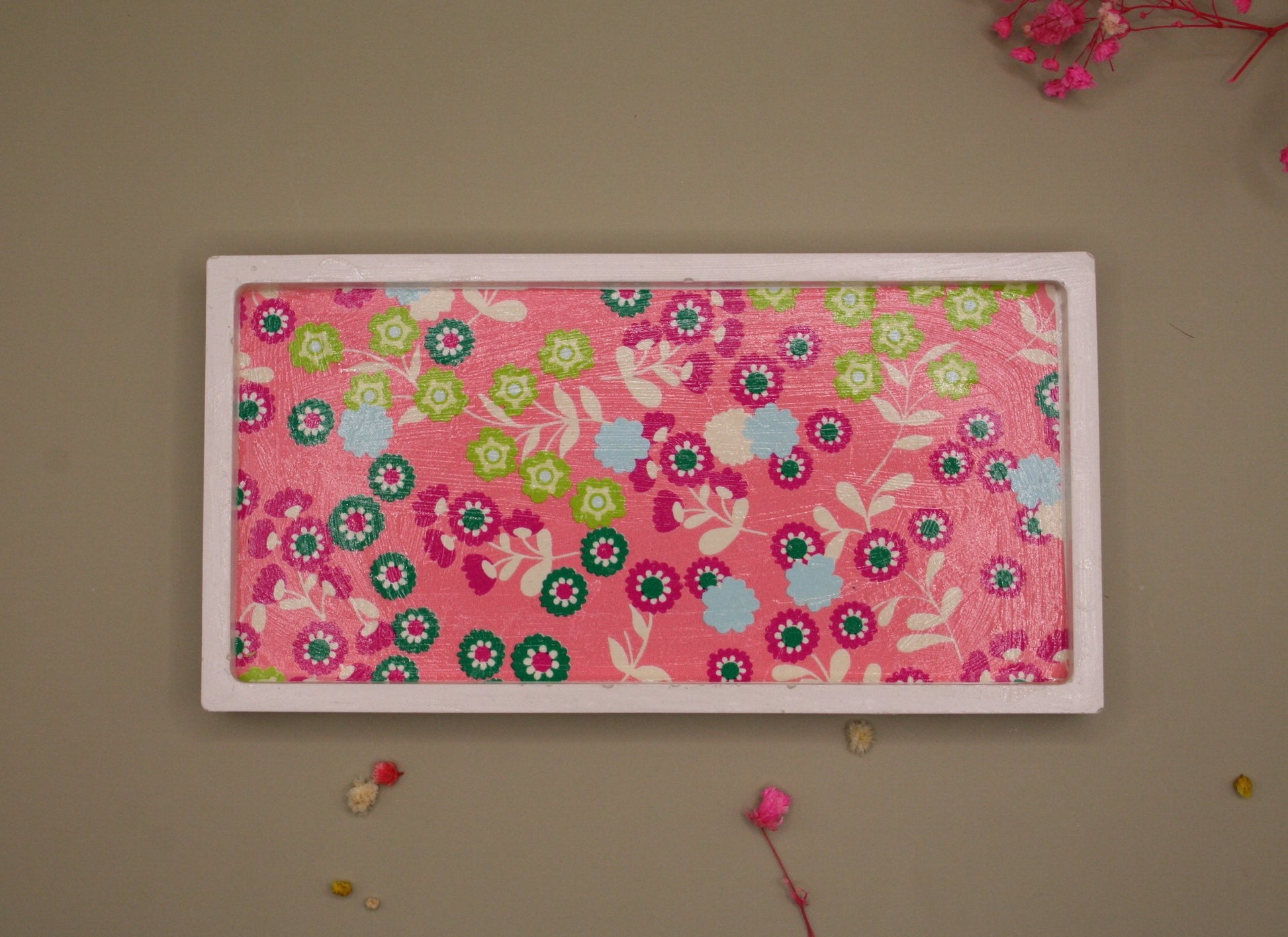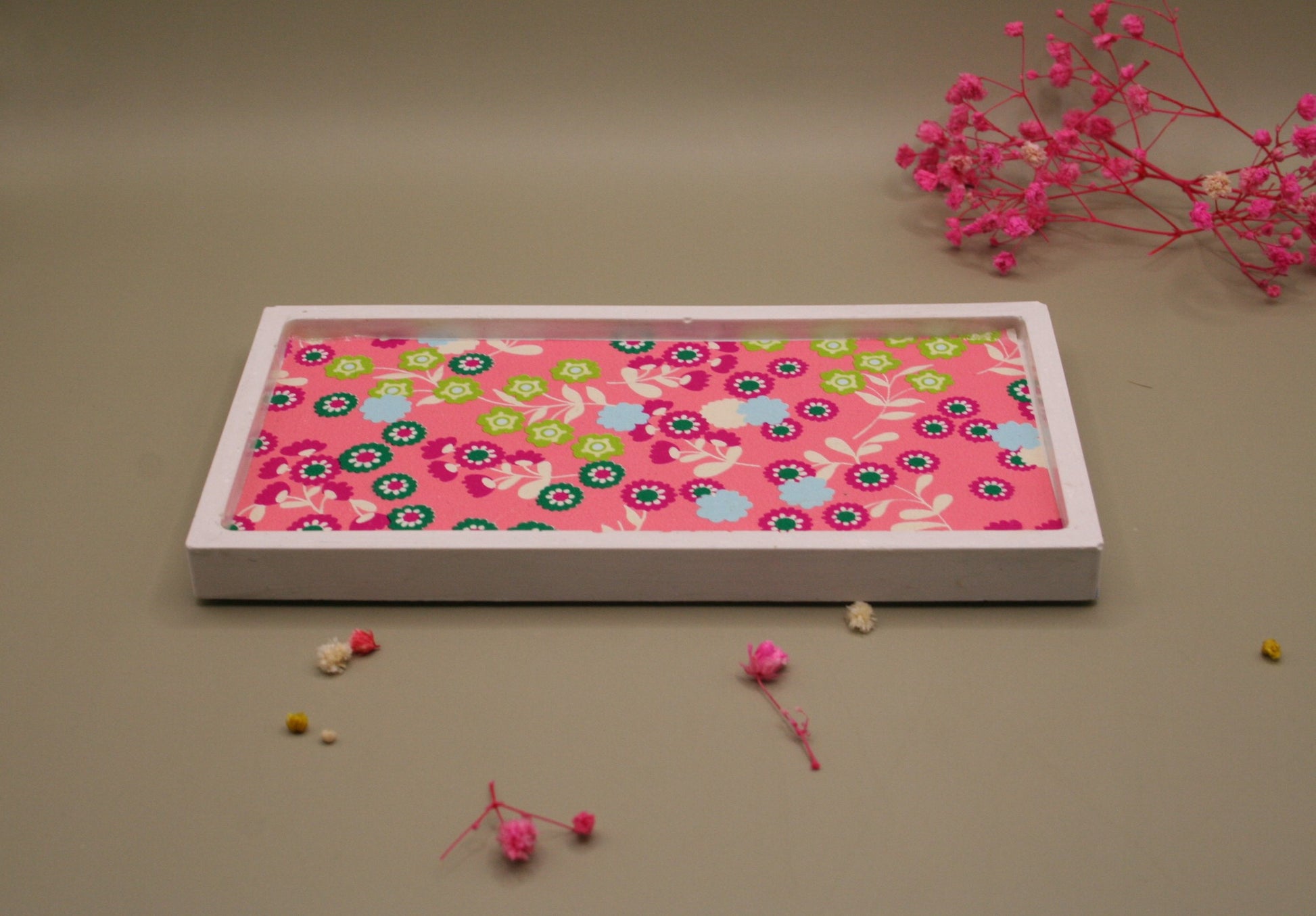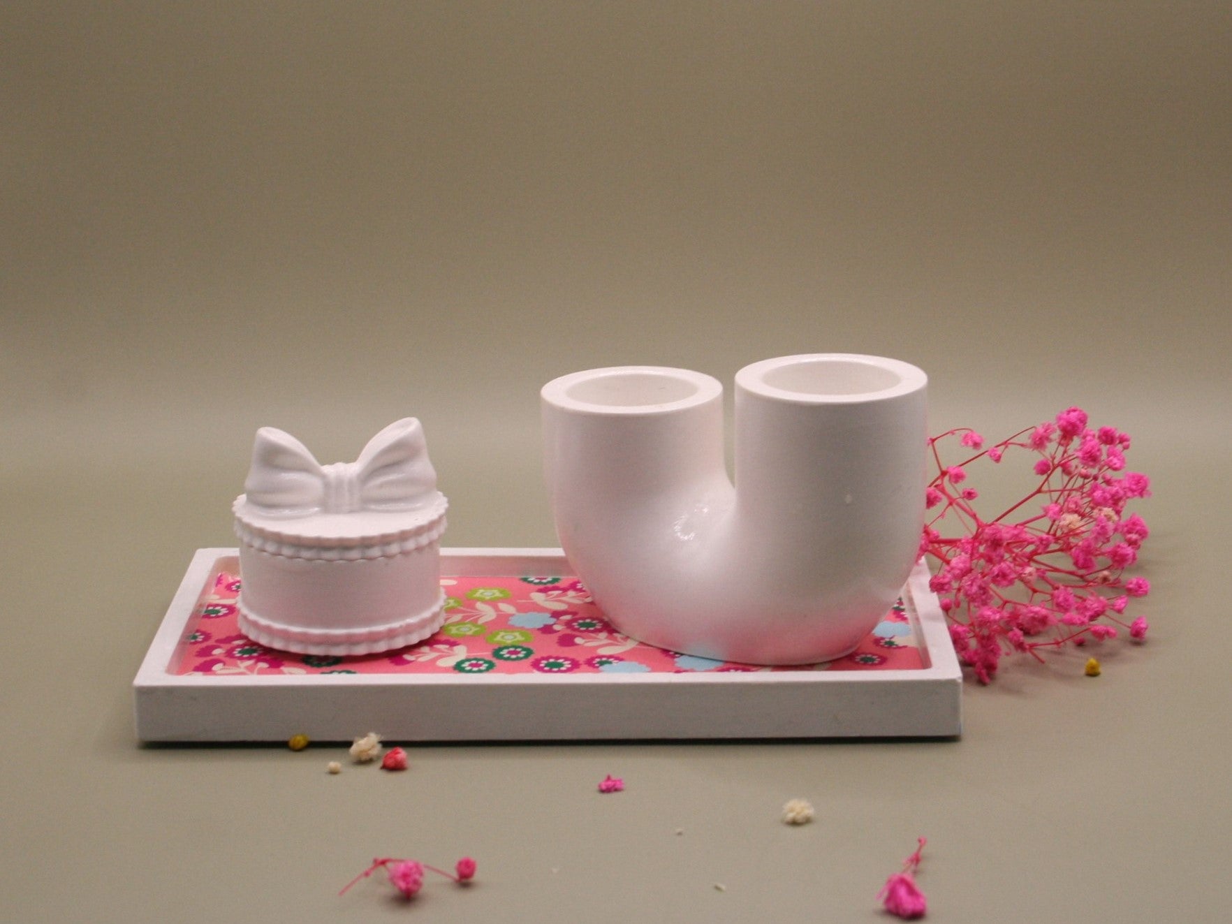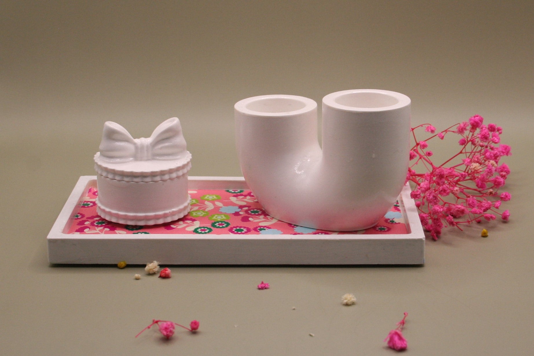 Apportez une touche romantique et originale à votre intérieur avec cet ensemble en résine naturelle composé d’un charmant pot orné d’un nœud délicat et d’un bougeoir double au design contemporain. Le tout est présenté sur un plateau rectangulaire décoré de motifs fleuris et colorés, pour un effet à la fois tendre et pétillant. Idéal pour accueillir des bougies, petits accessoires ou comme pièce décorative unique.