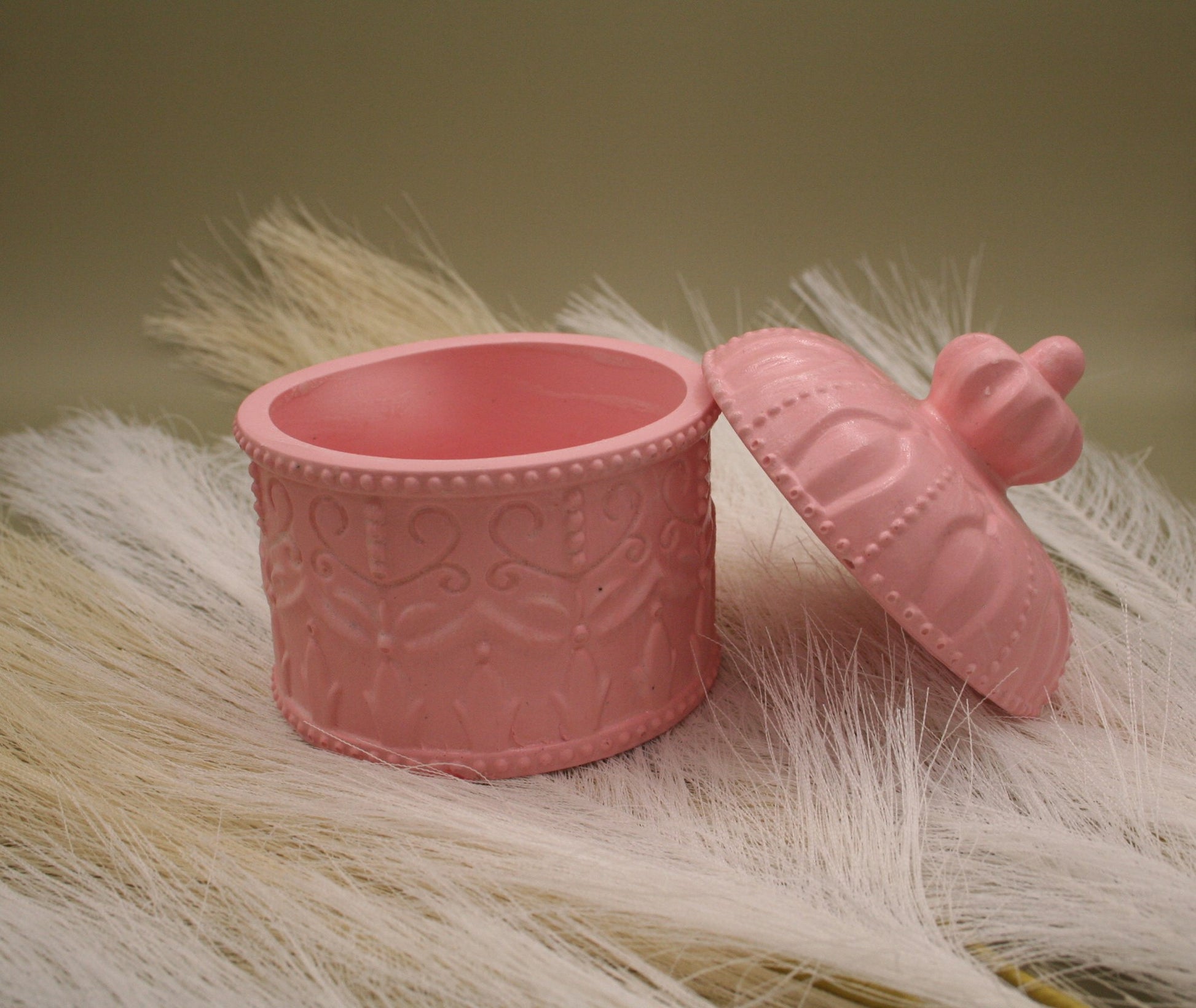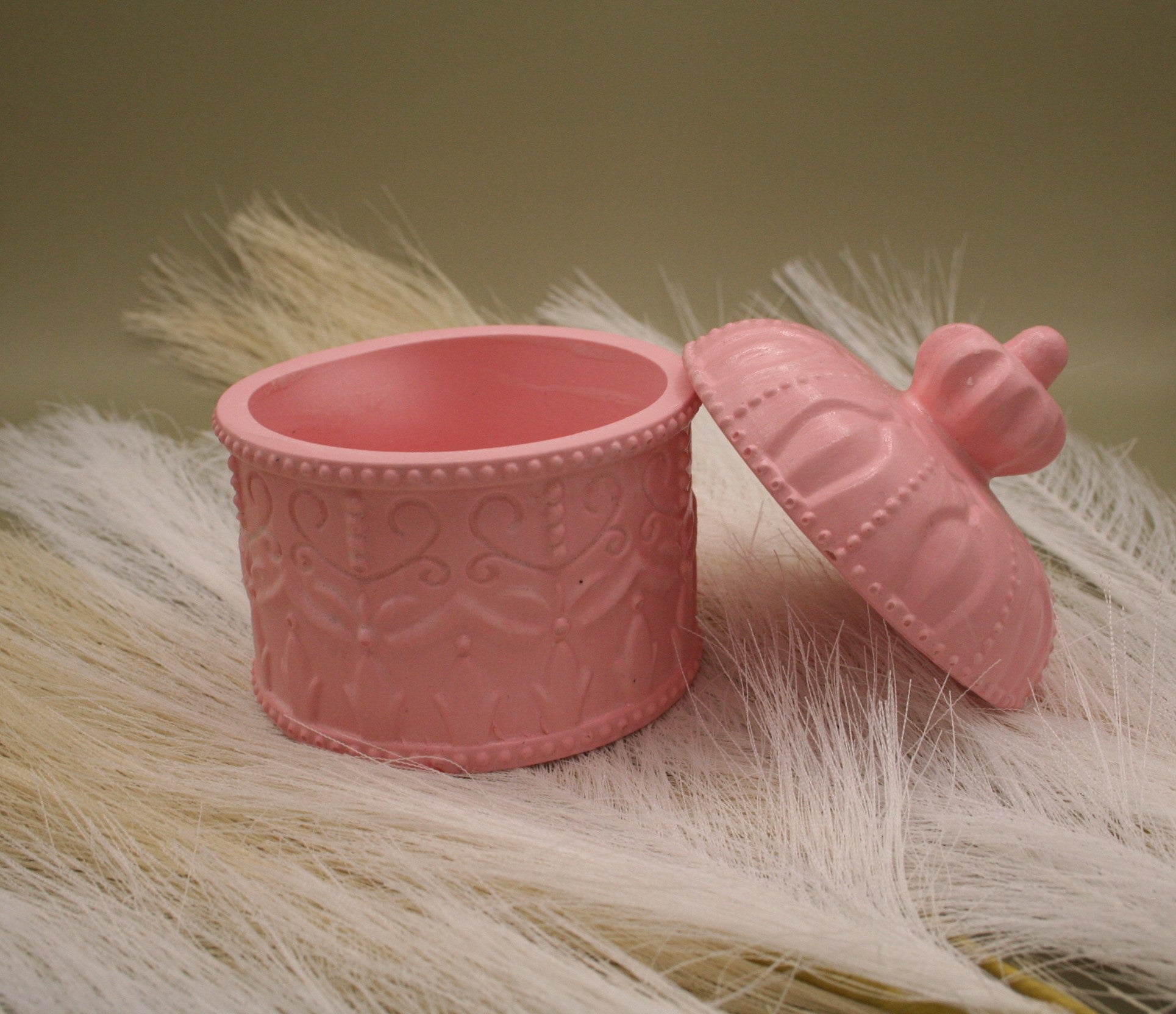 Succombez au charme rétro de cette boîte en résine naturelle, sublimée par un relief délicat et un couvercle bombé à prise facile. Sa teinte rose poudré et ses détails perlés lui donnent l’allure d’une confiserie précieuse. Parfaite pour ranger bijoux, ou secrets, elle trouve sa place aussi bien dans une chambre que dans un salon romantique.