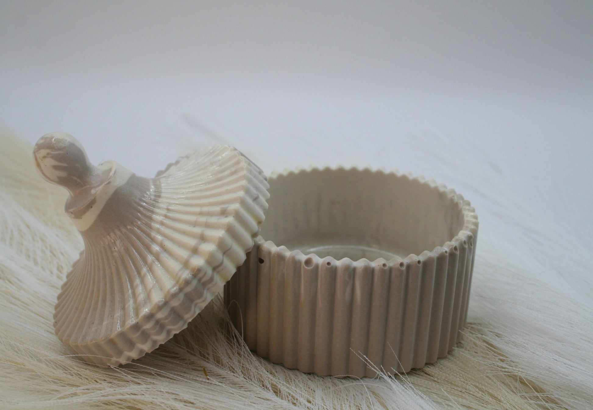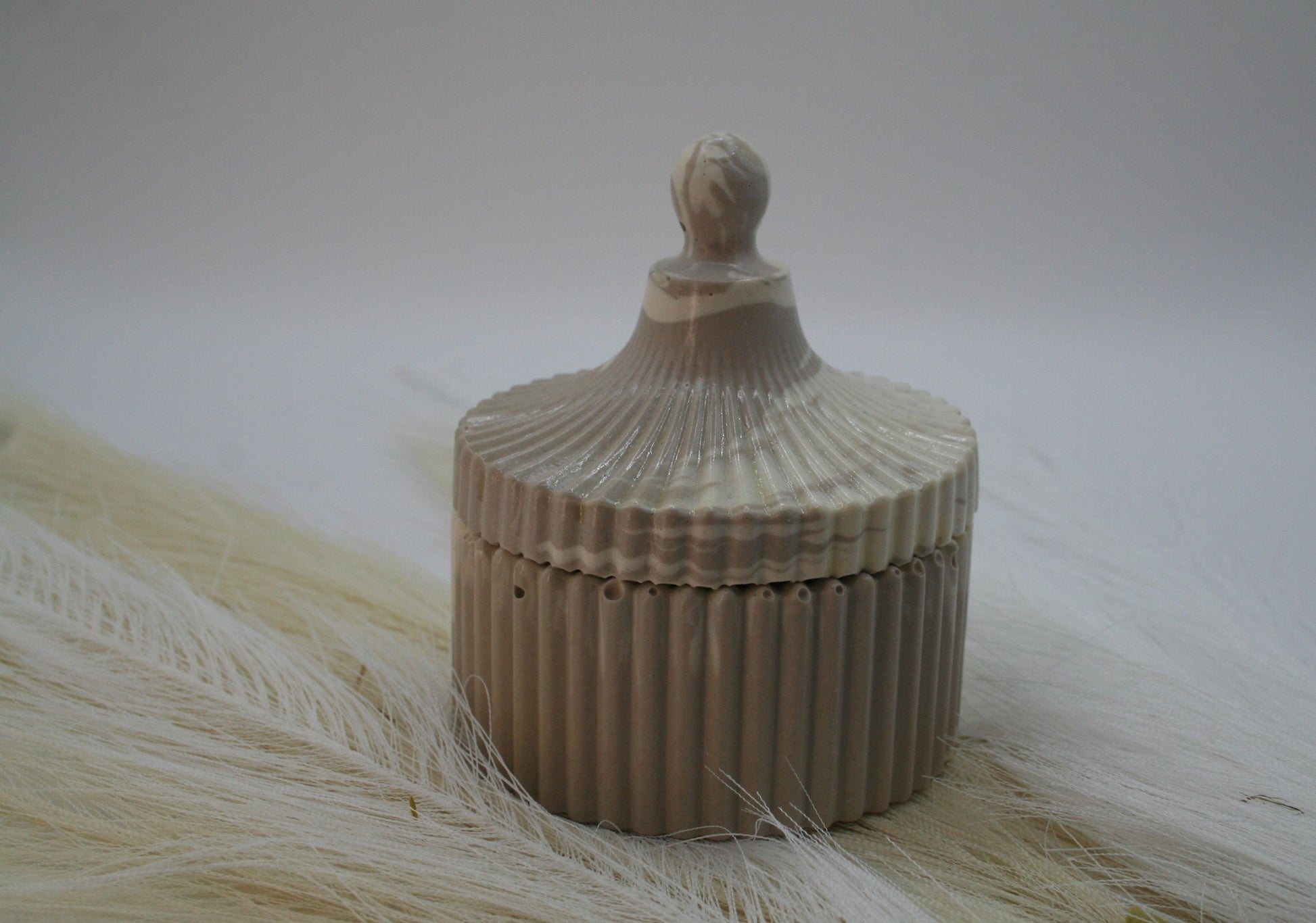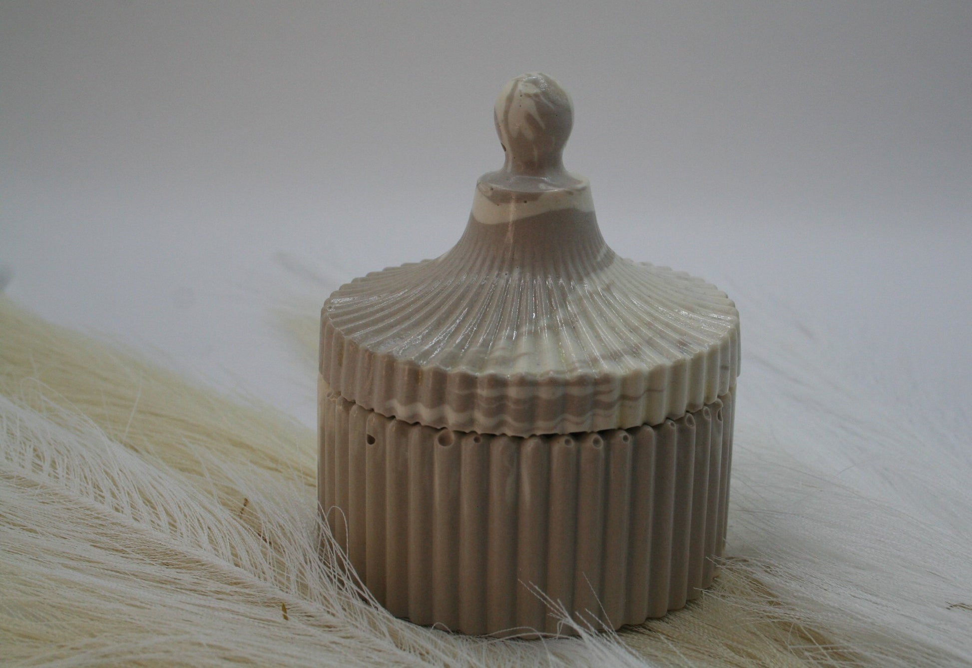 Contenant décoratif en résine naturelle, au design nervuré inspiré des lignes organiques de l’écorce ou des dunes. Sa finition lisse et brillante met en valeur sa teinte beige douce, tandis que son couvercle sculpté avec bouton central ajoute une élégance discrète. Une pièce à la fois fonctionnelle et esthétique, parfaite pour une ambiance épurée et chaleureuse.