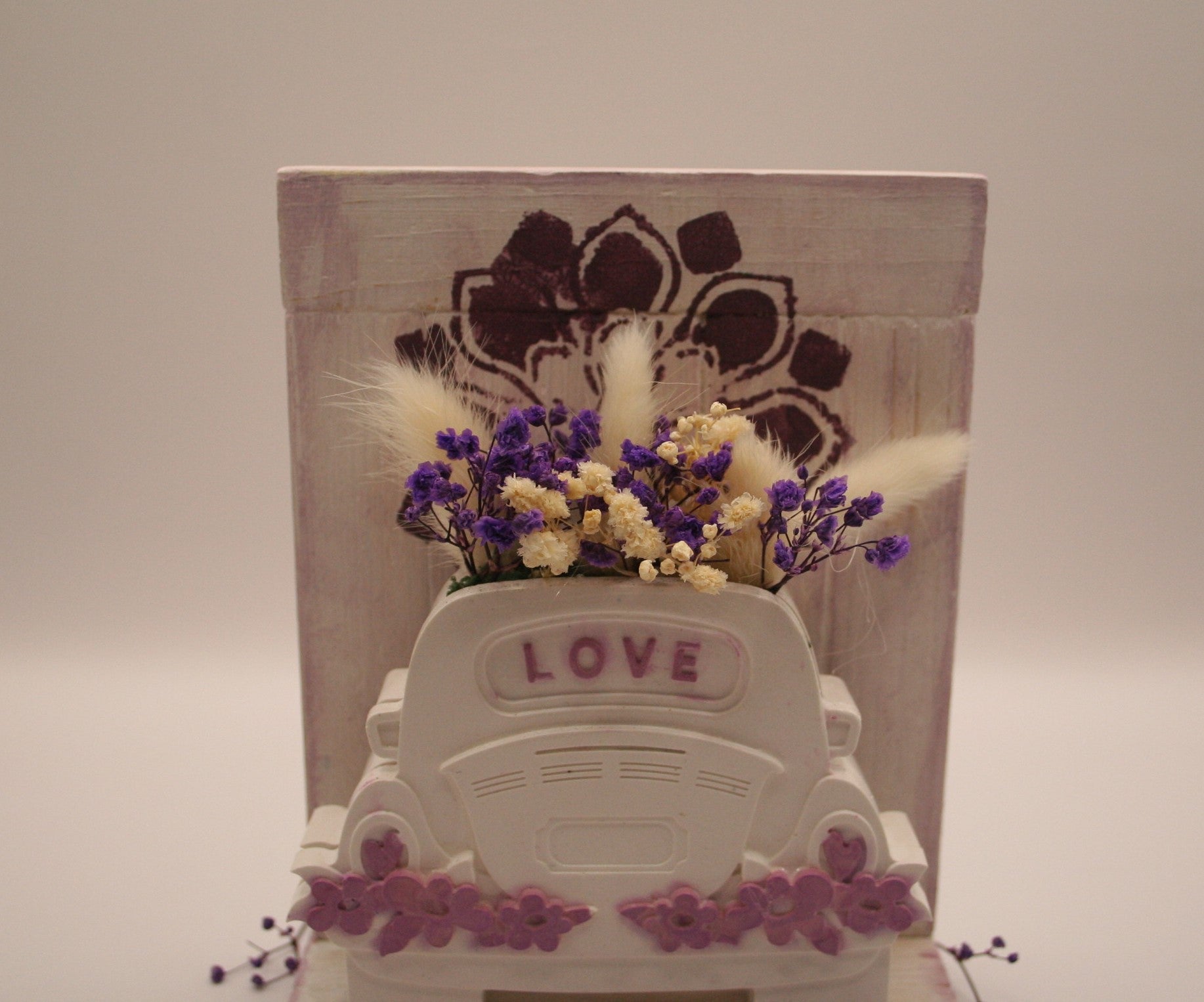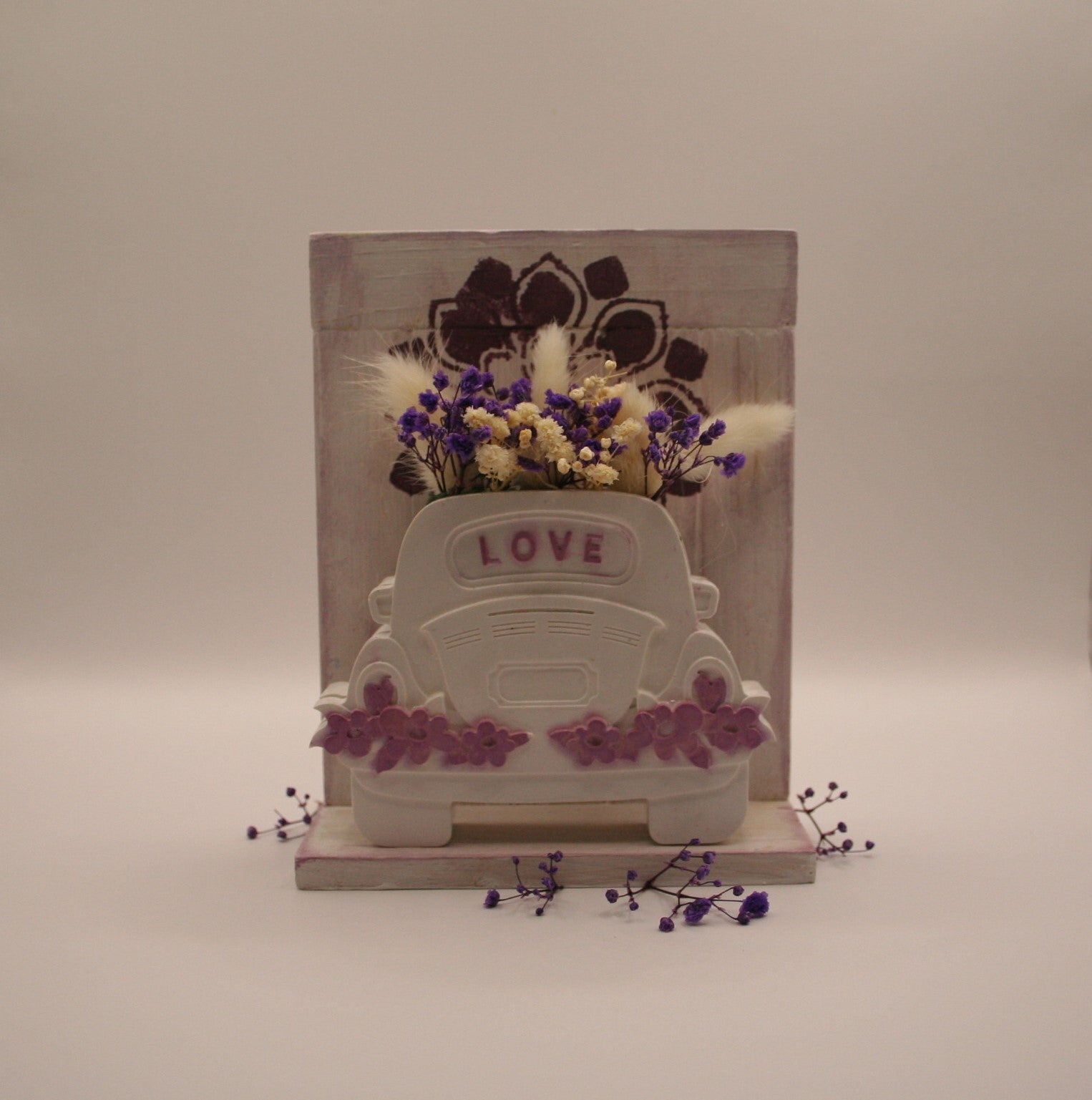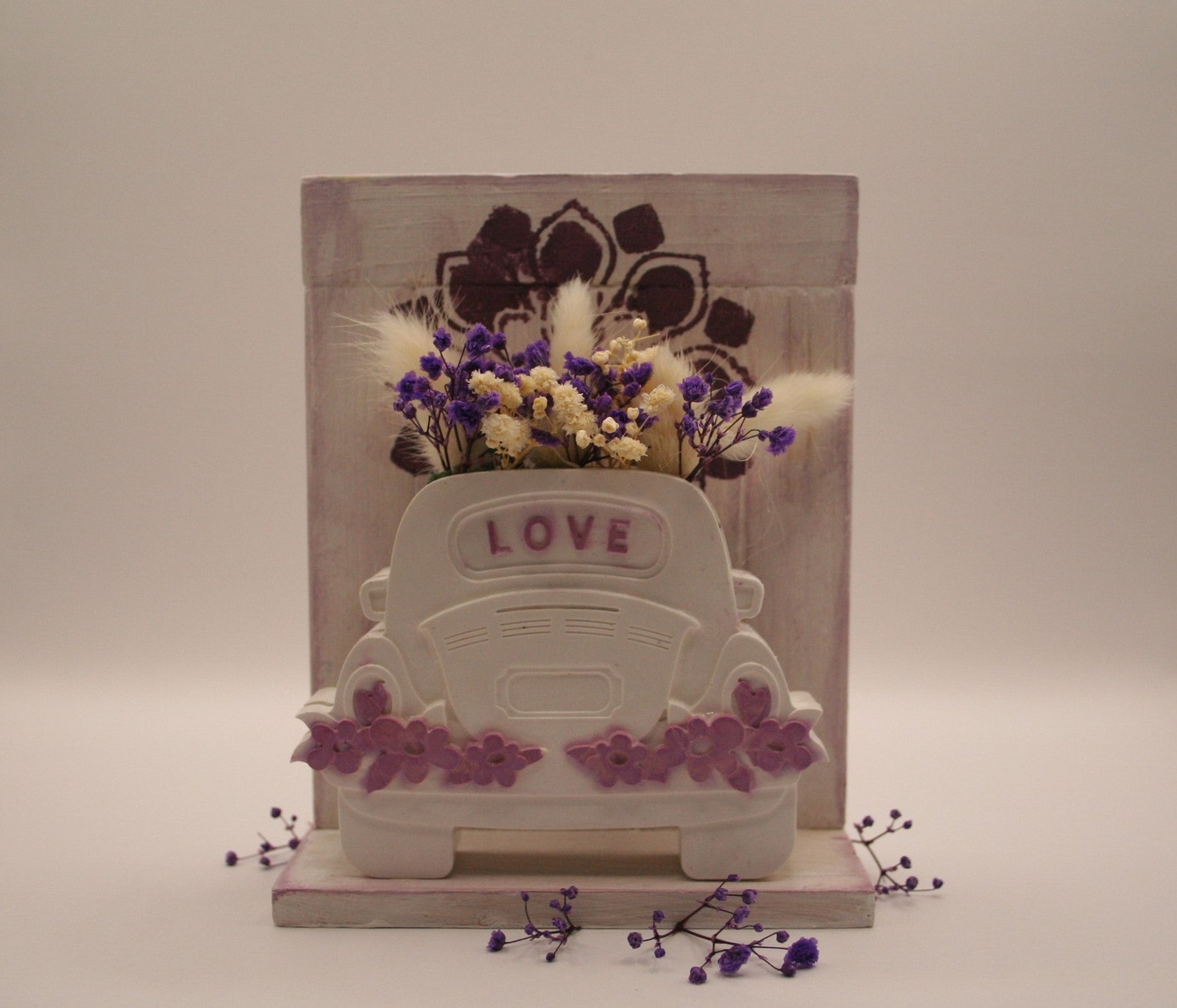 Un objet décoratif plein de charme représentant une petite voiture blanche en résine naturelle, où est inscrit le mot love. Cette voiture transportant de l'amour avec un bouquet de fleurs séchées colorées sortant de la voiture. Cette voiture est posée sur un socle en bois.